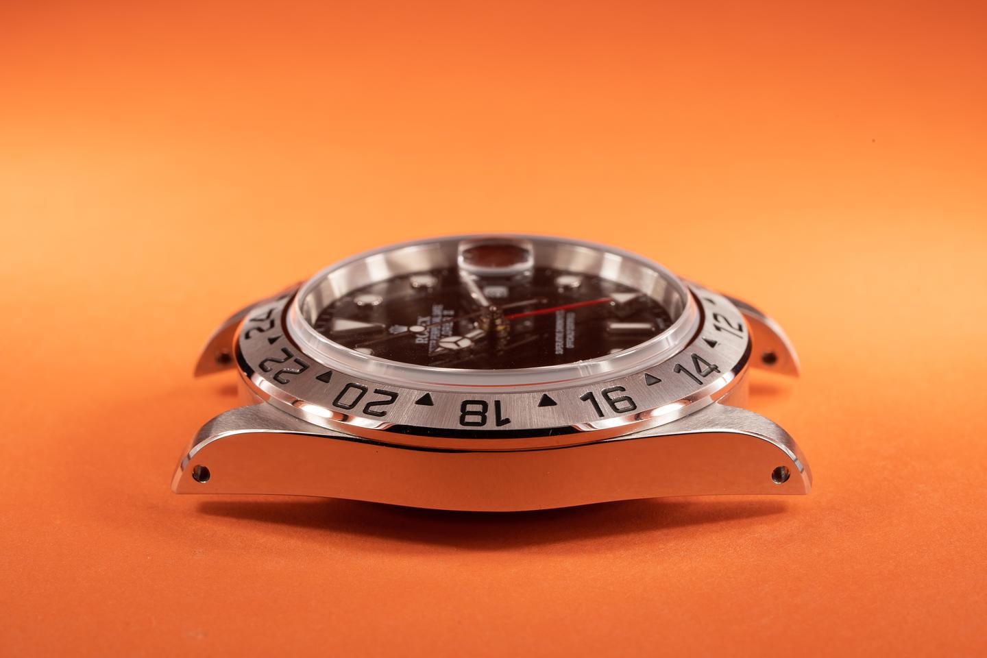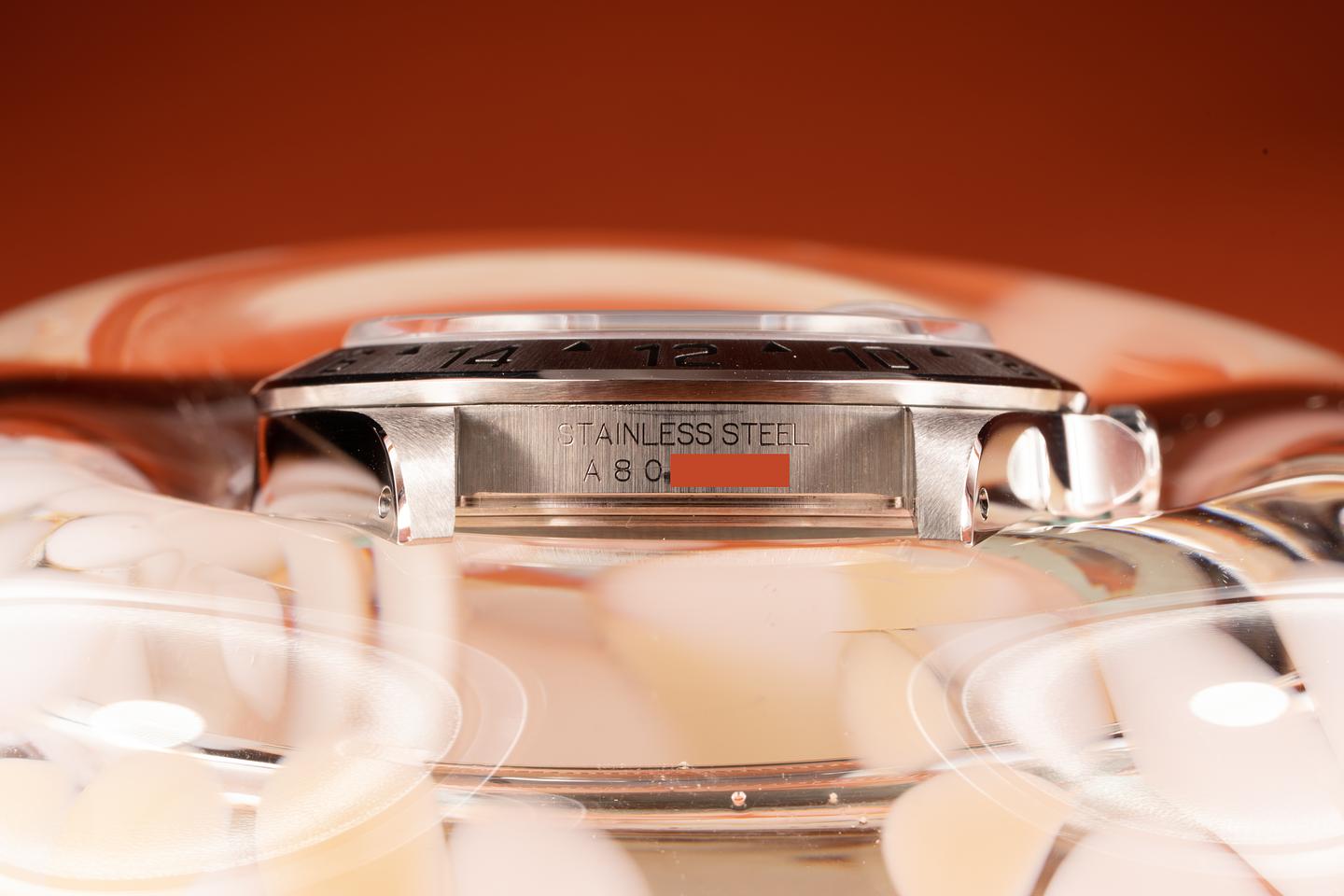 Case: The case has just returned from polishing and features sharp and prominent bevels. The stainless bezel has also just returned from polished and shows a sharp and well-defined sunburst finish.
