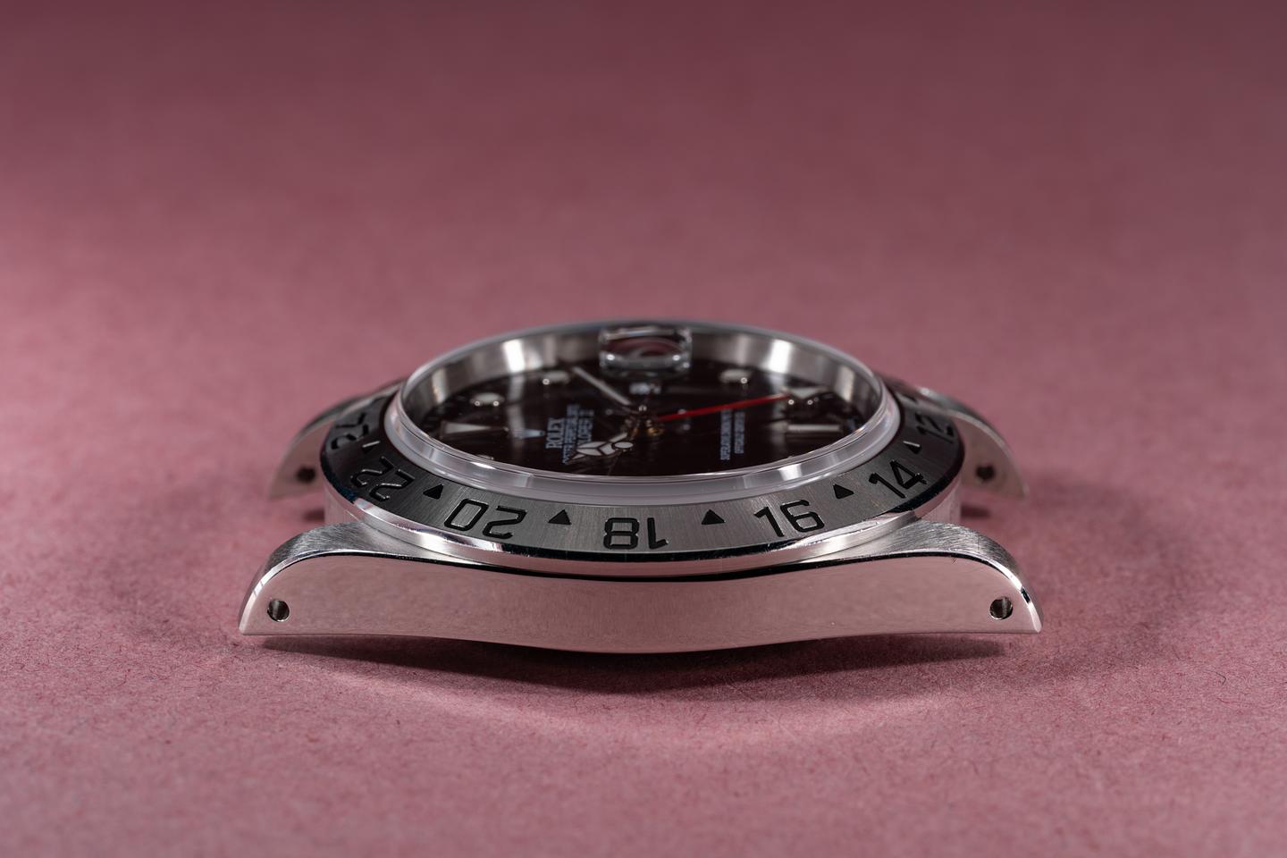 Case: The previously polished case is excellent showing prominent bevels and only light wear from use. The stainless bezel is also in excellent condition showing only very light wear and a sharp well-defined sunburst finish.