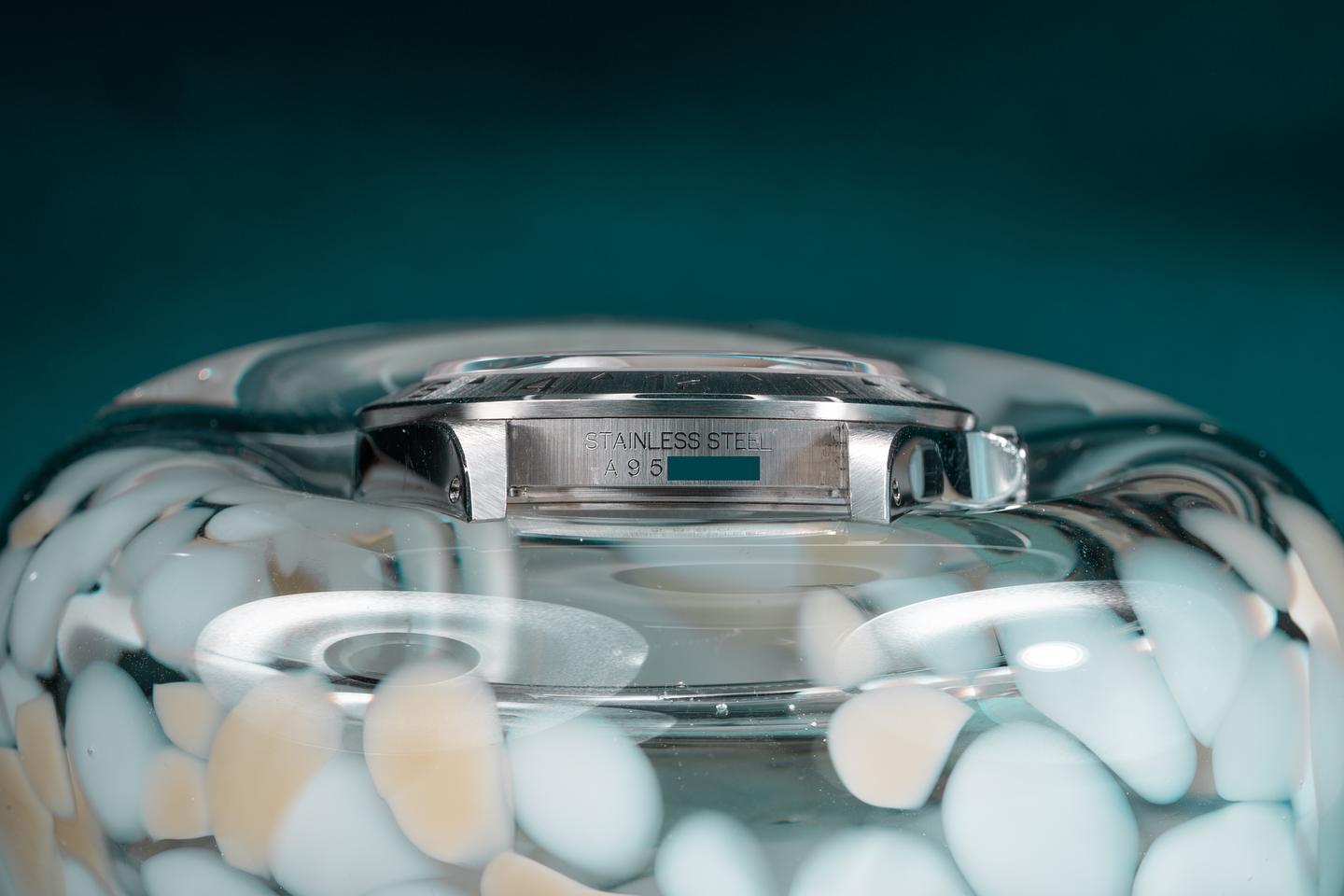 Case: The unpolished case is excellent showing sharp prominent bevels and only very light wear from use. The stainless bezel is also in excellent condition showing a sharp and well-defined factory sunburst finish.