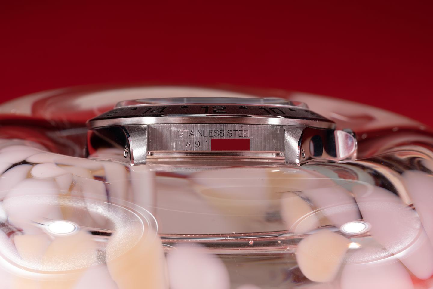 Case: The recently polished case is excellent showing sharp prominent bevels and only extremely light wear from use. The stainless bezel is also in excellent condition showing a sharp well-defined sunburst finish.