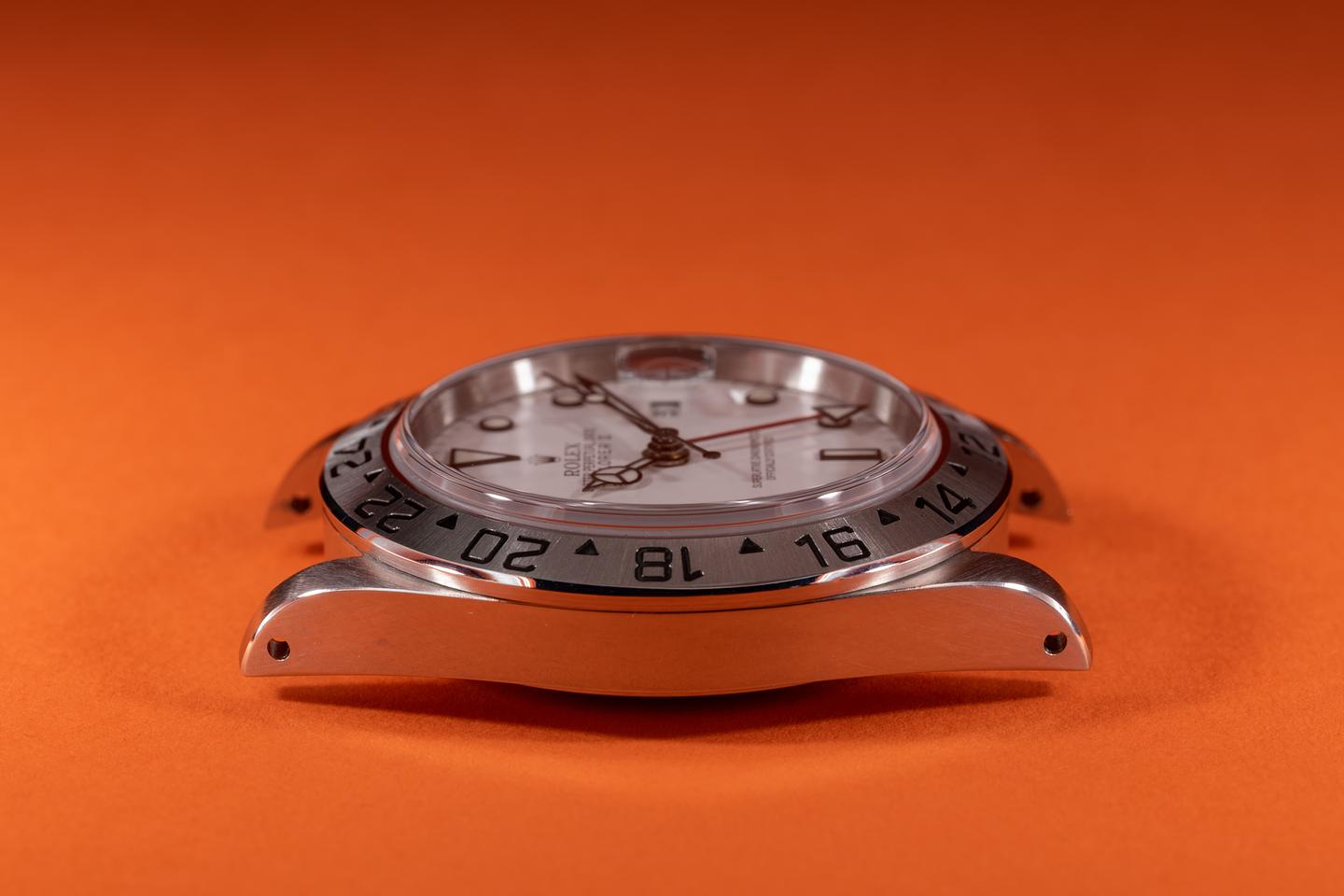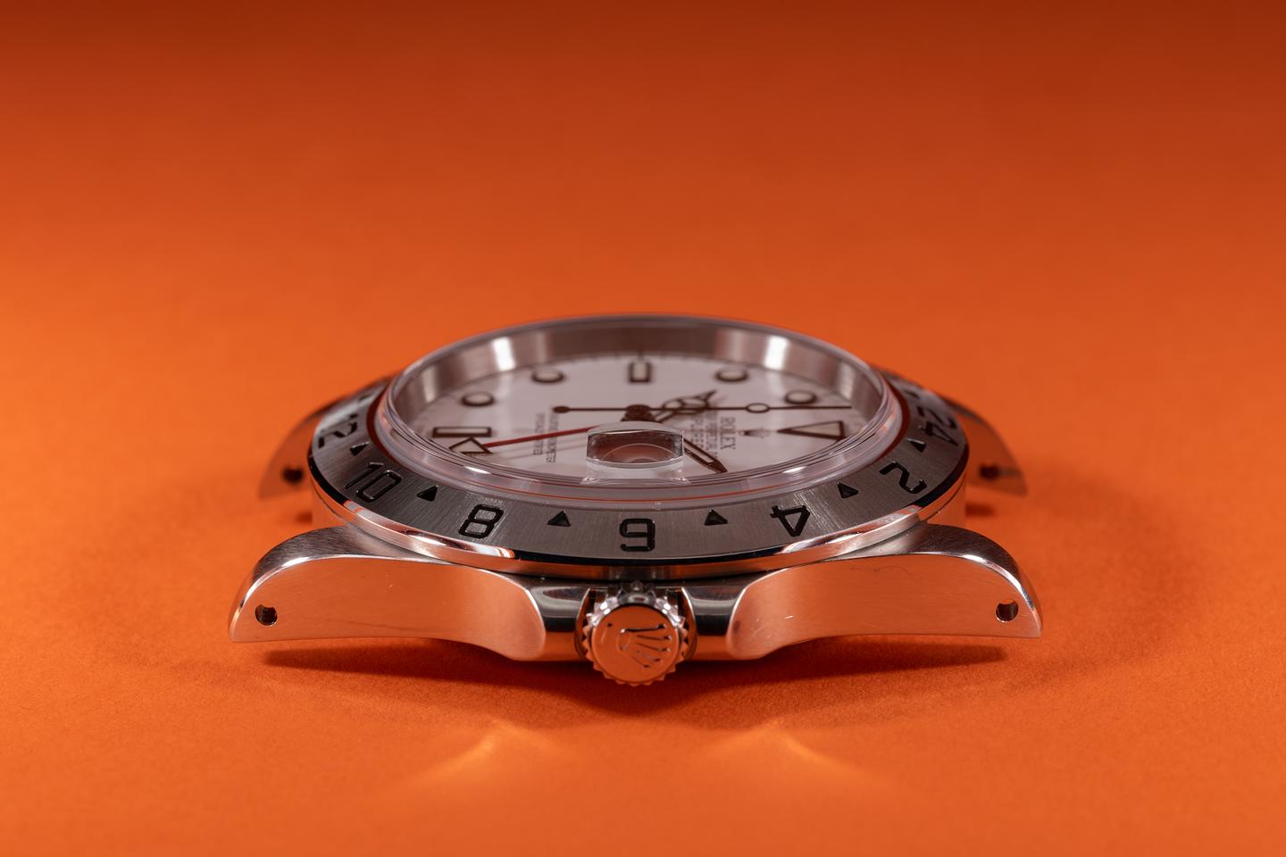 Case: The thick and even case has just returned from polishing showing sharp prominent bevels. The freshly polished stainless bezel is also in excellent condition showing a sharp well defined sunburst finish.