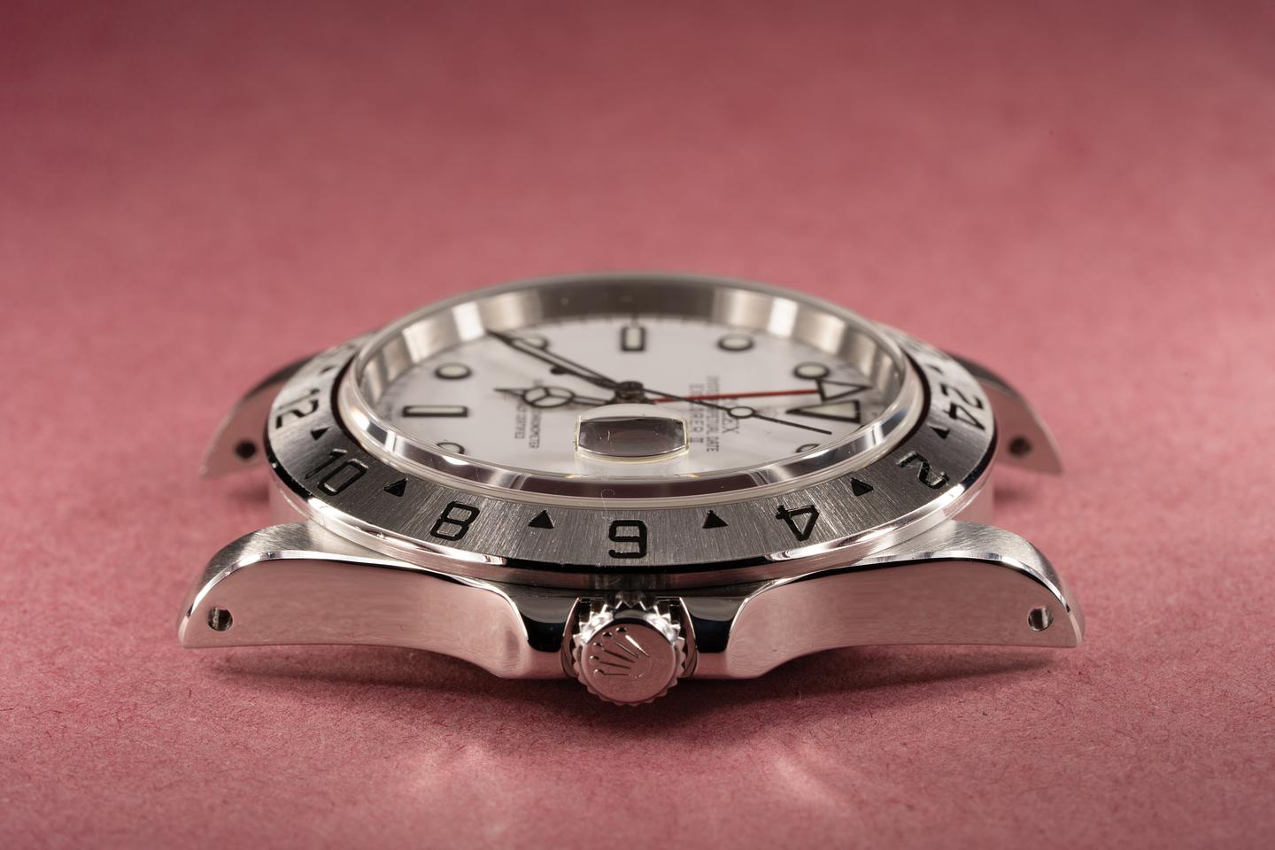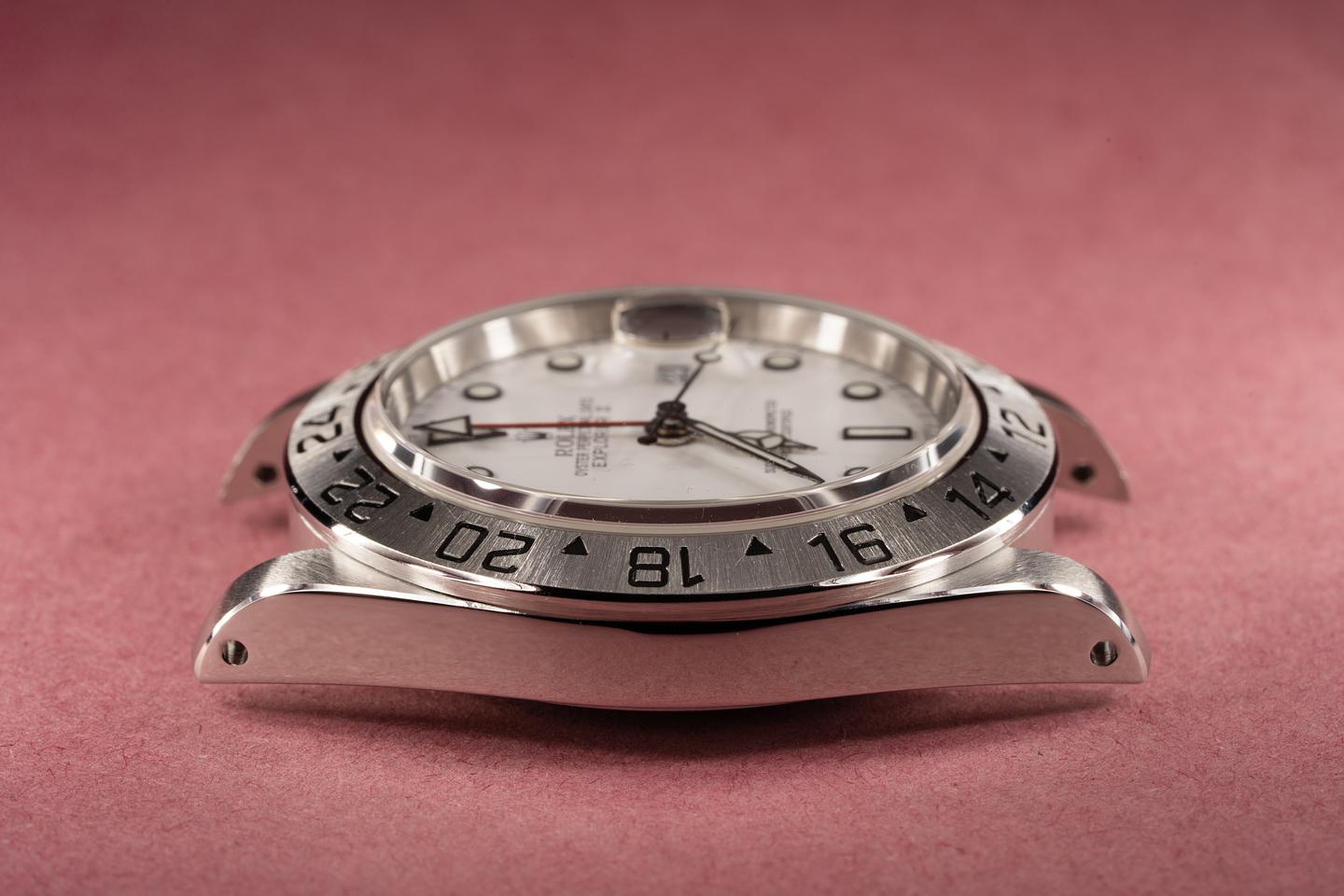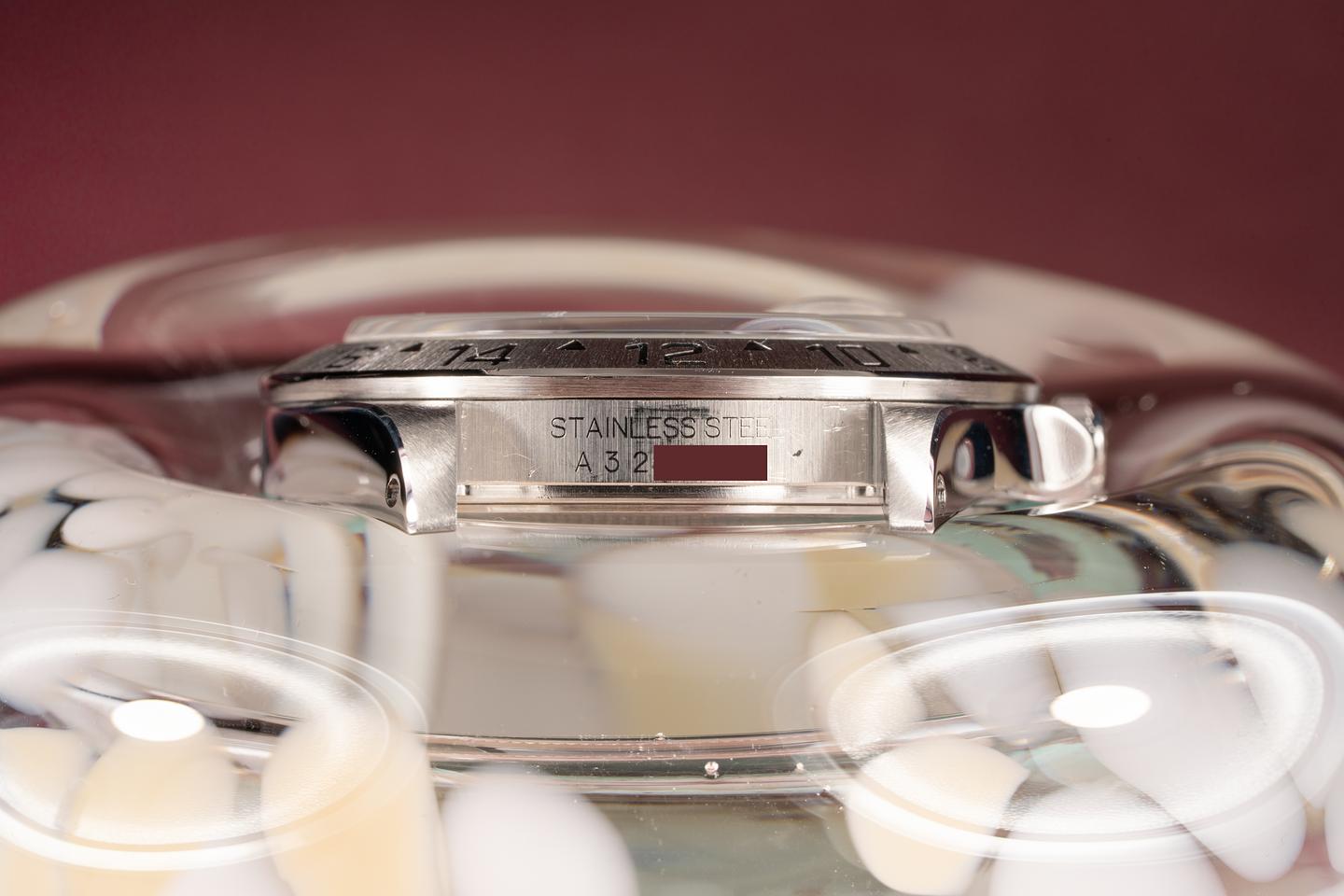Case: The case has just returned from polishing and features sharp and prominent bevels. The stainless bezel has also just returned from polished and shows a sharp and well defined sunburst finish.
