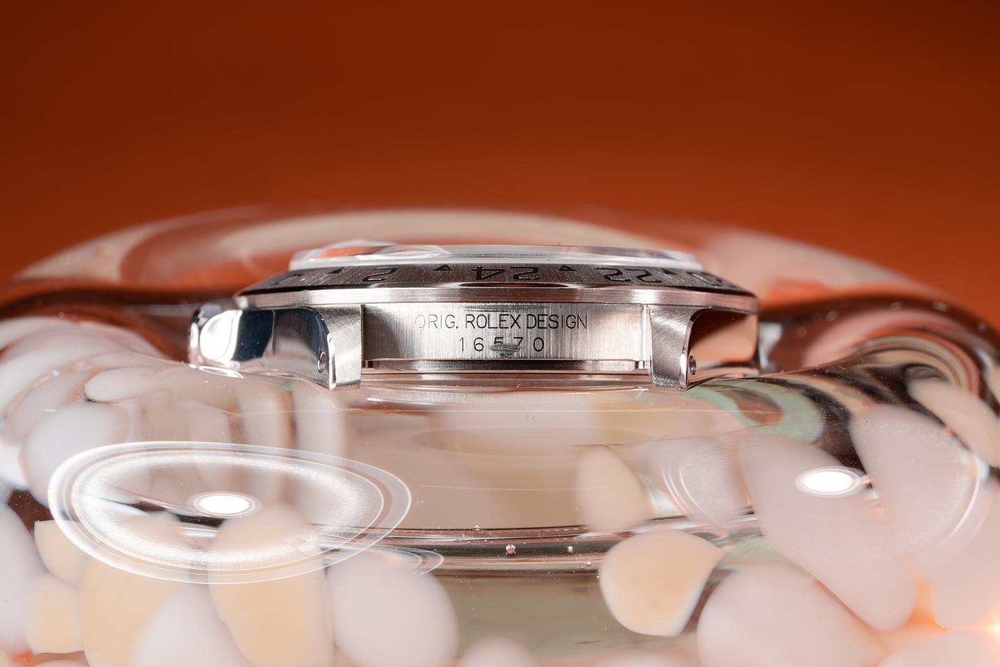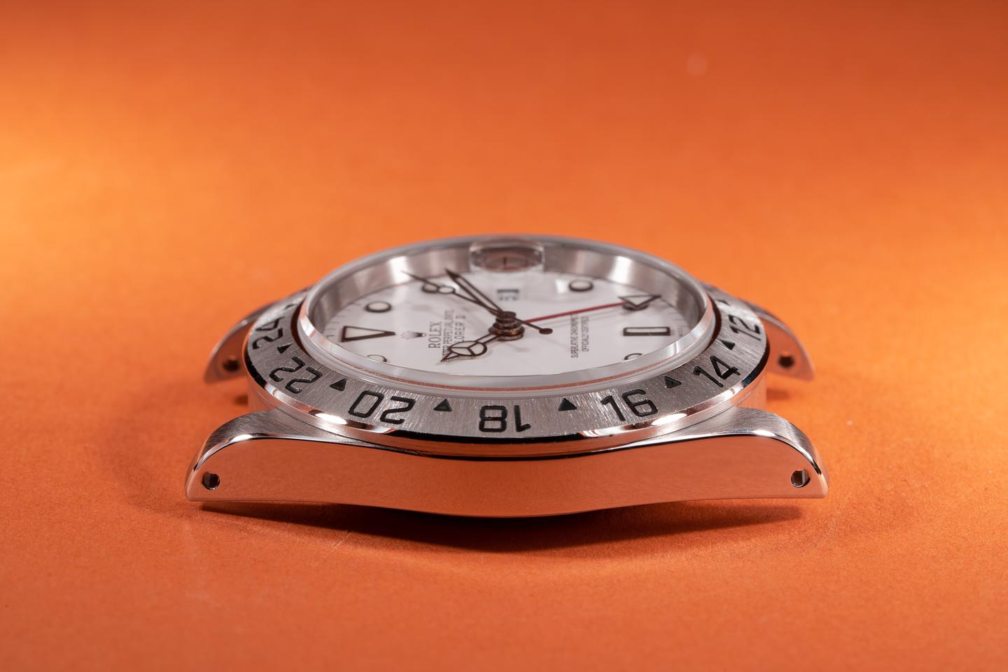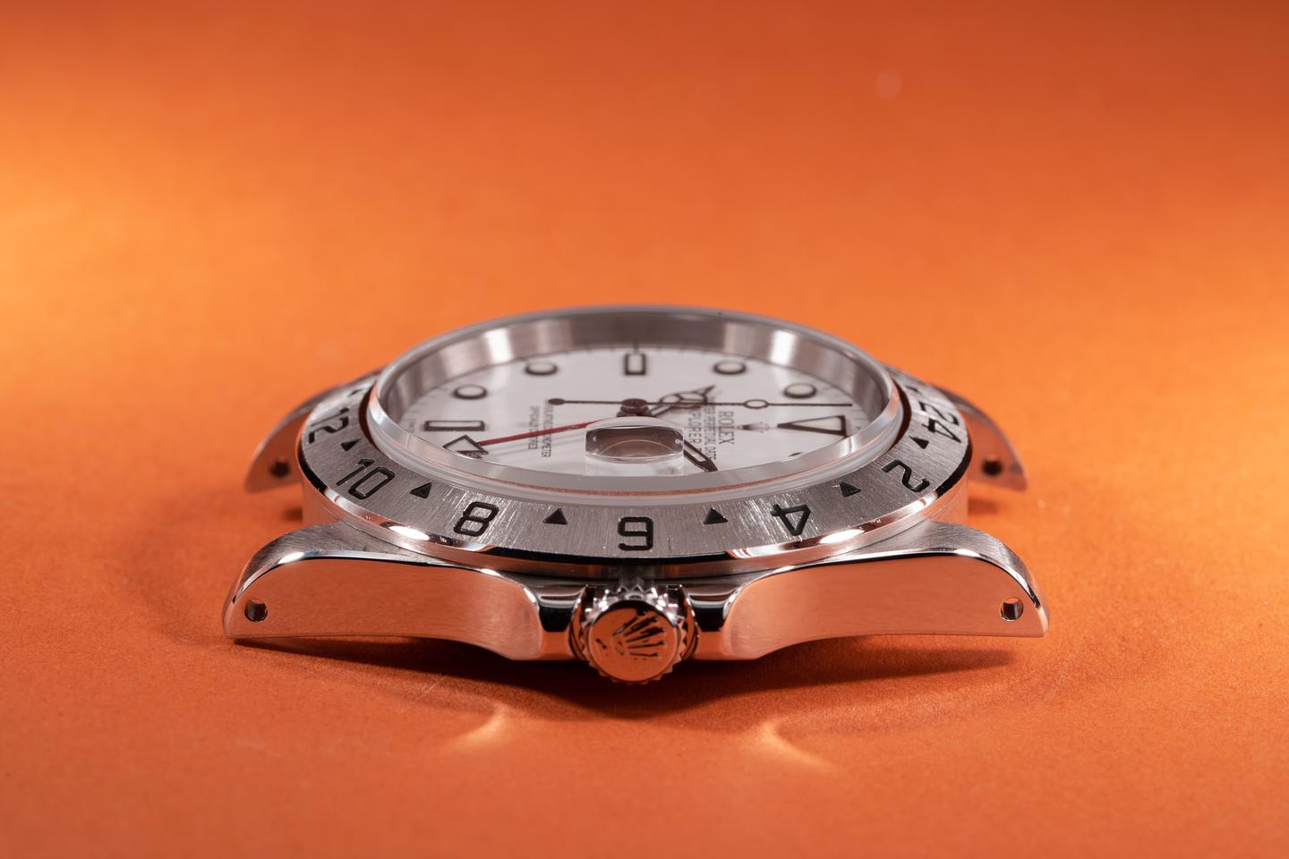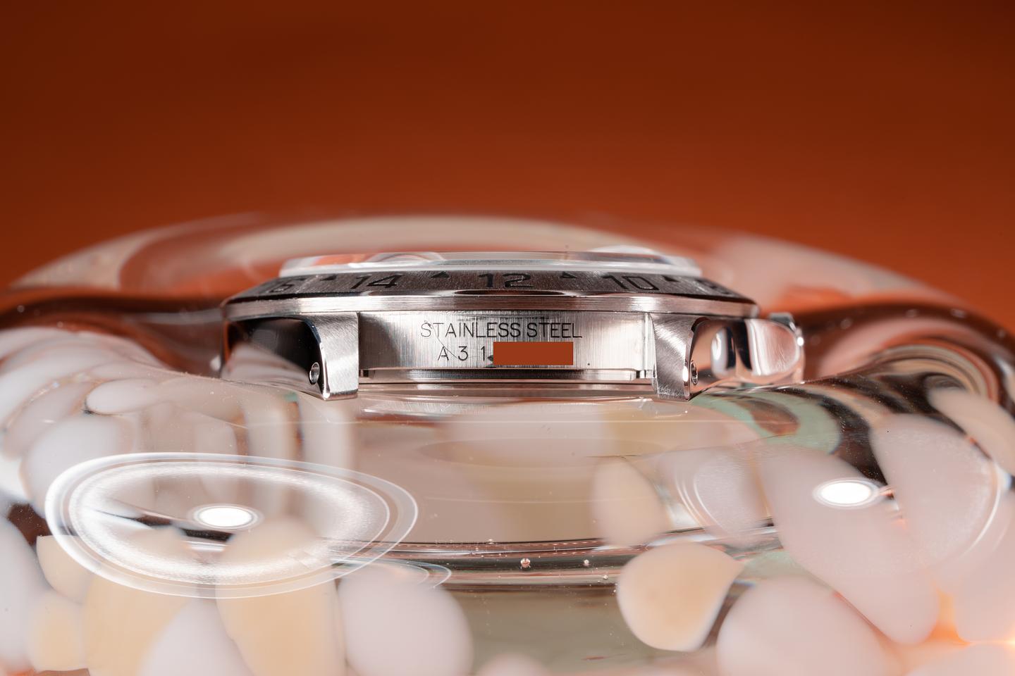 Case: The previously polished case is excellent showing sharp prominent bevels and only light wear from use. The stainless bezel is also excellent showing a sharp and well-defined sunburst finish.