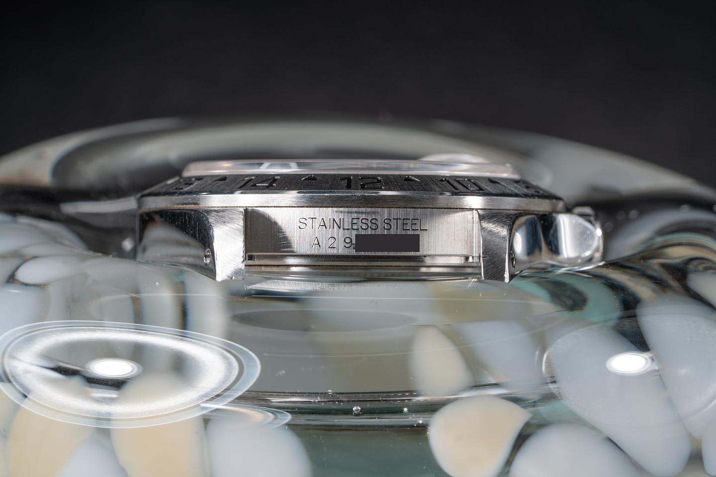 Case: The thick case appears to be unpolished showing prominent factory bevels and some wear from use. The stainless bezel is also in excellent condition showing a sharp well-defined factory sunburst finish and some light wear. The original factory sticker is still in place on the caseback.
