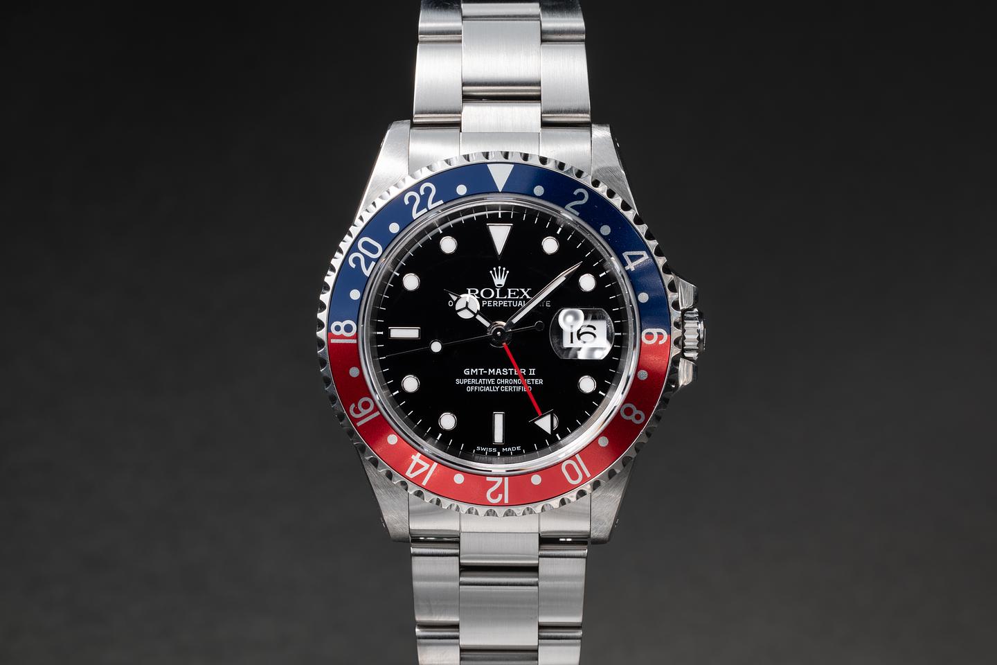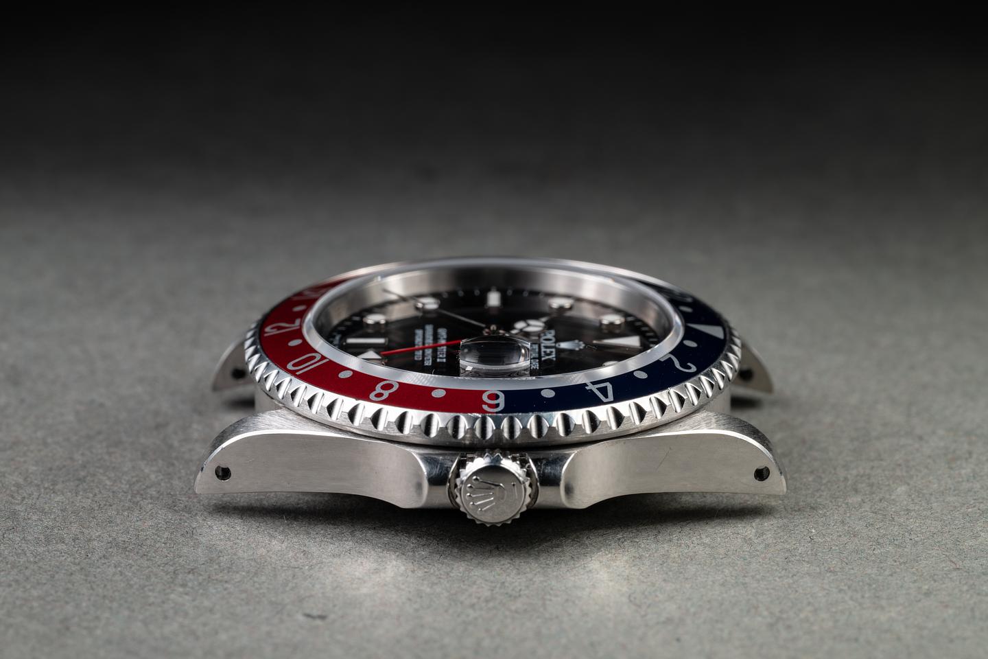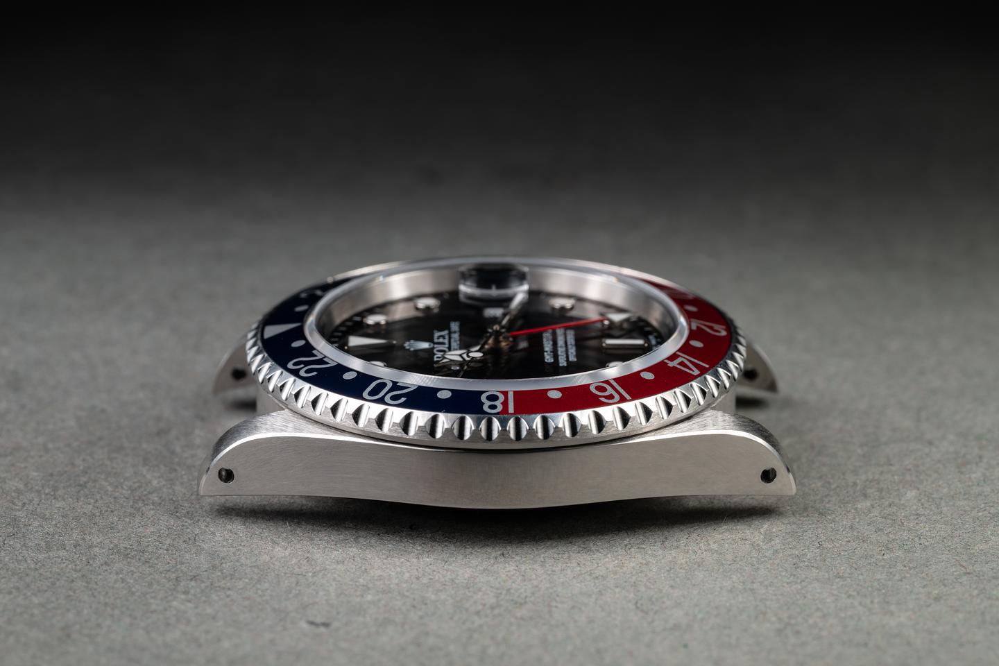 Case: The previously polished case is excellent, showing sharp, prominent bevels and only very light wear from use. The blue and red "Pepsi" bezel insert is also in excellent condition, showing only very light wear from use.