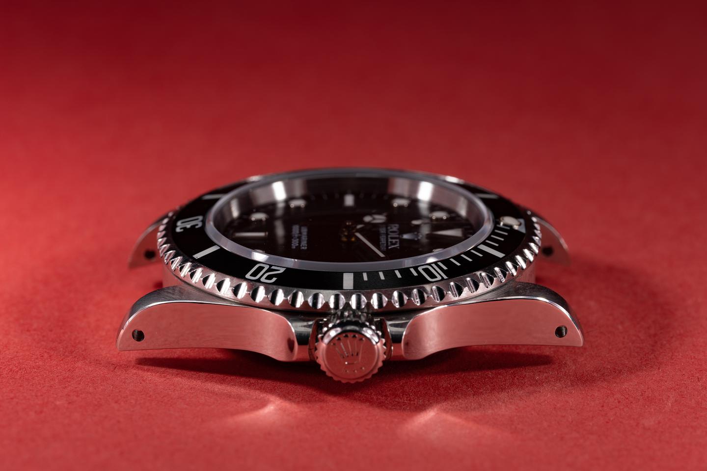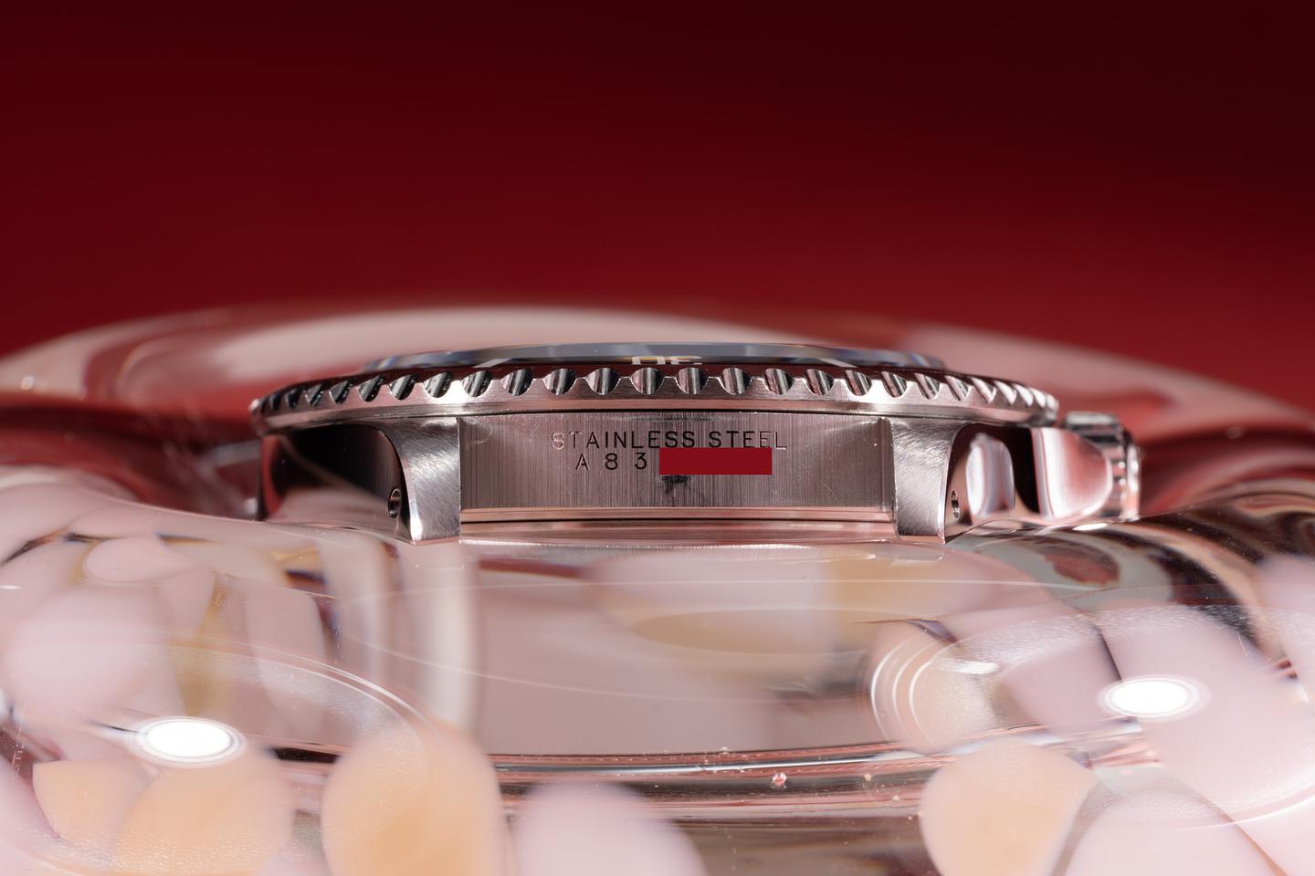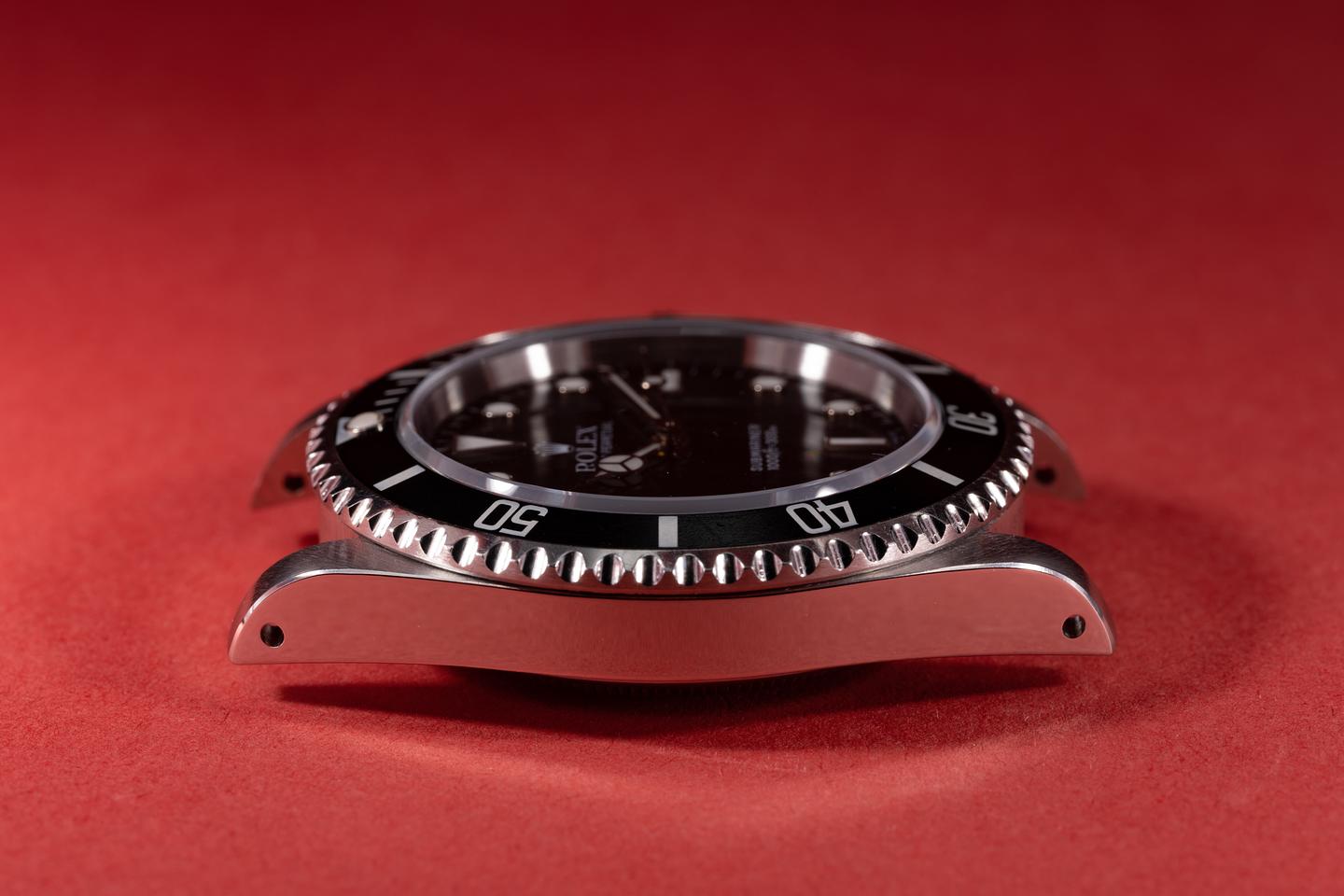 Case: The thick and even case is excellent and has just returned from polishing showing sharp prominent bevels. The black bezel insert is also in excellent condition and shows only light wear from use.