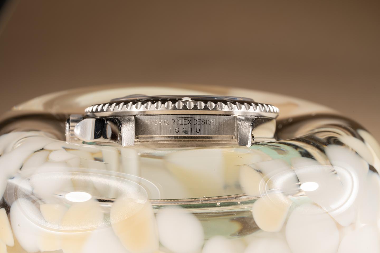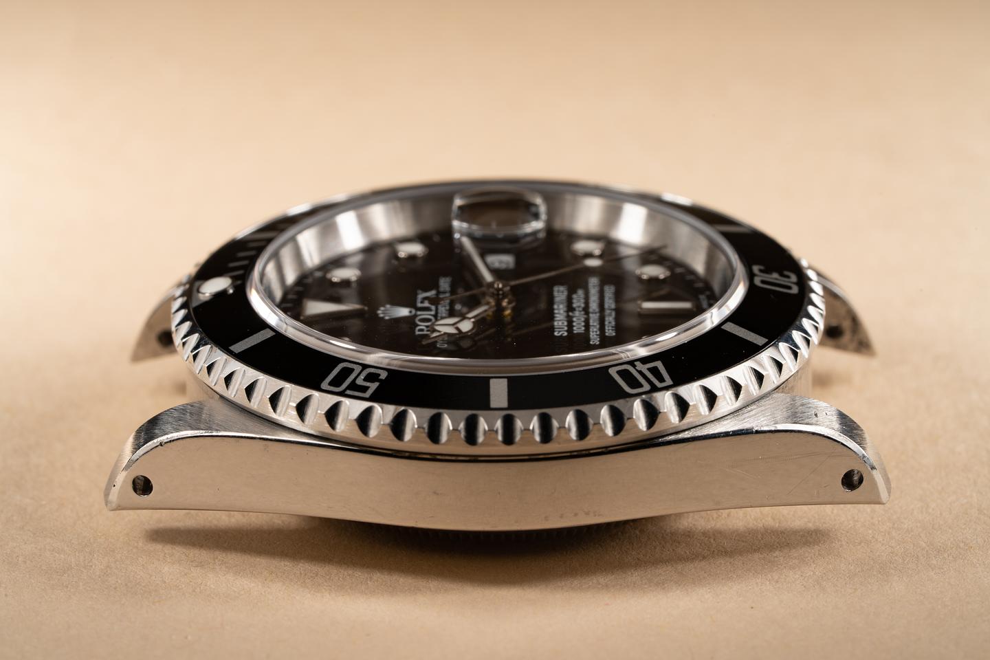 Case: The excellent case appears to be unpolished and features sharp prominent bevels and shows only light wear. The black bezel insert is also excellent and shows little if any wear. The original caseback sticker is still in tact.