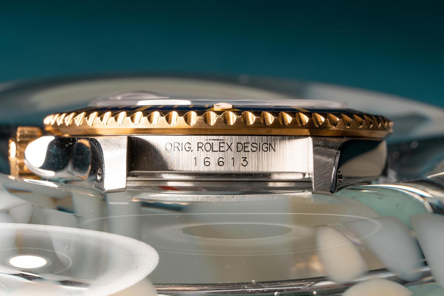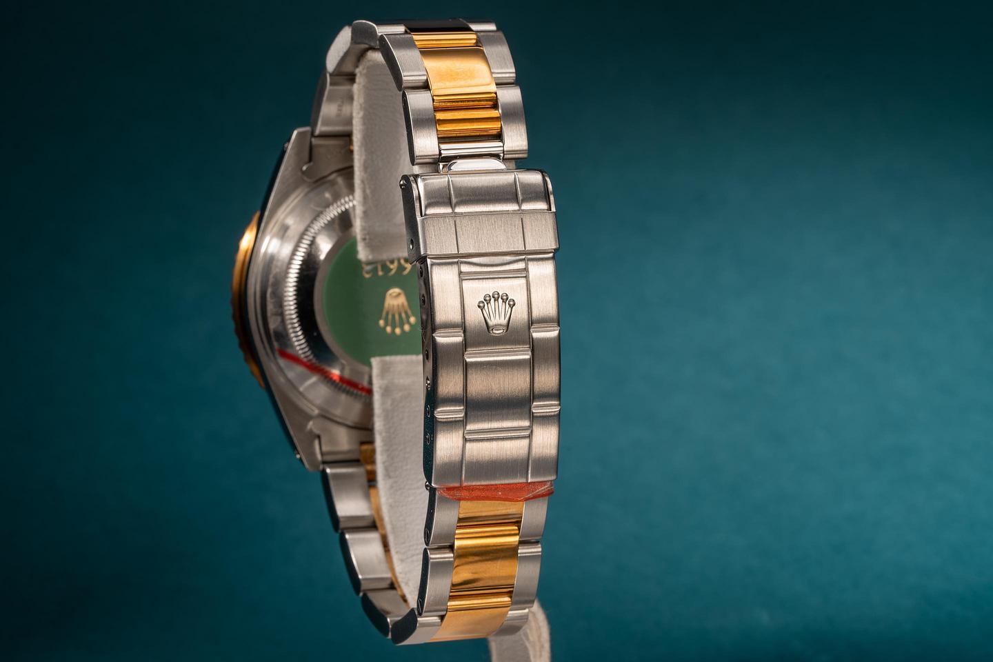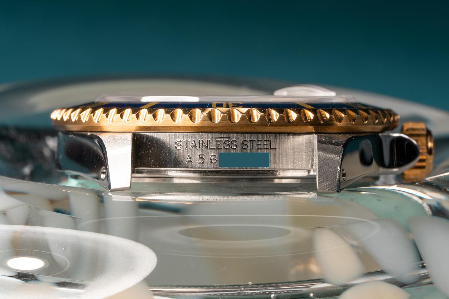 Case: Mint unpolished two-tone sharp case with extremely light wear. The blue bezel insert is excellent showing little if any wear.