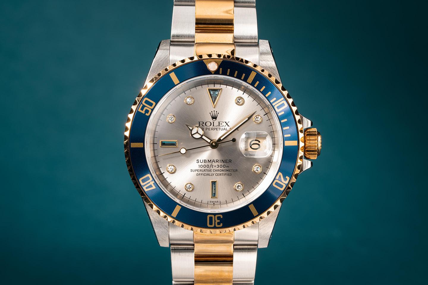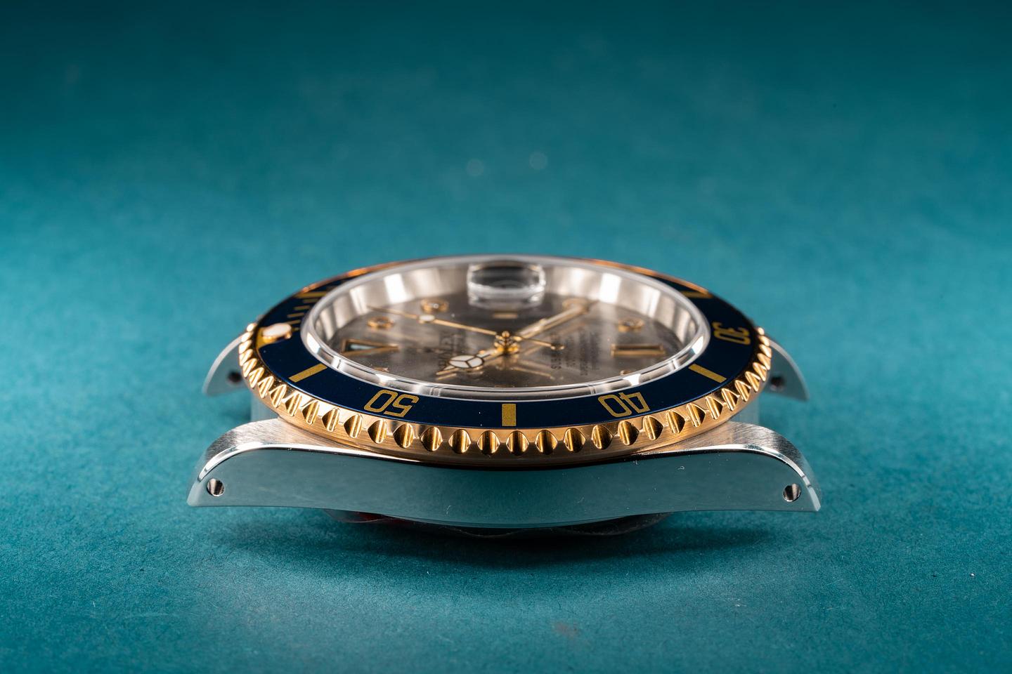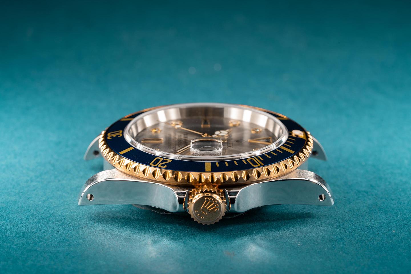 Case: Mint unpolished two-tone sharp case with extremely light wear. The blue bezel insert is excellent showing little if any wear.