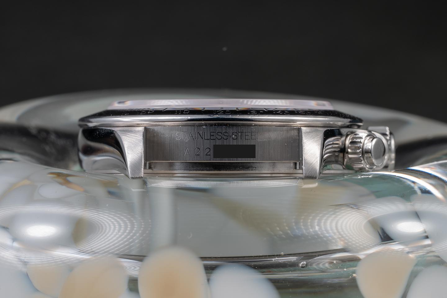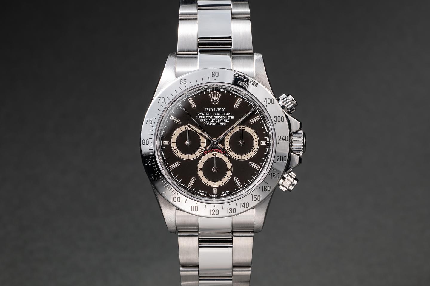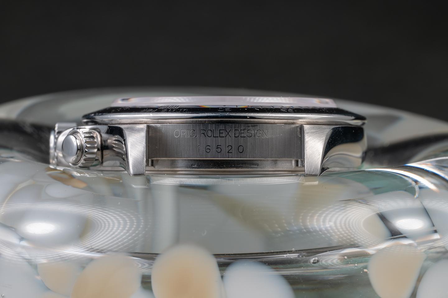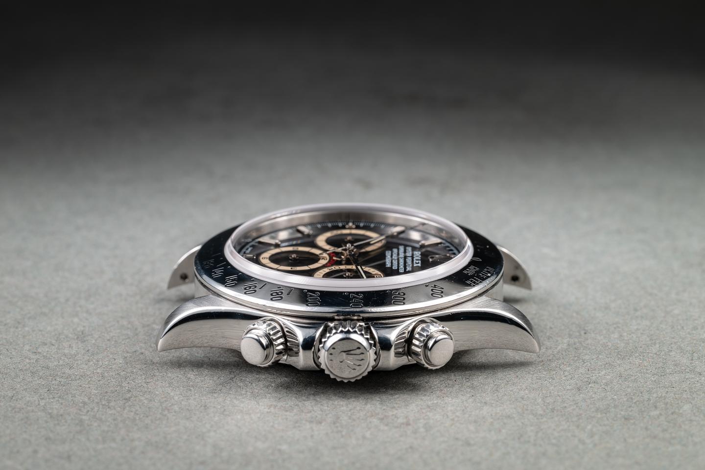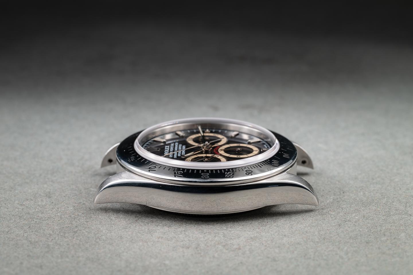 Notes: We don't want to oversell it; the brown is subtle and will not be noticeable under all lighting conditions. But the dial is definitely turning brown, and if it's anything like previous generations of tropical dails it will continue to do so. While we don't have a big enough sample size yet to say definitively. We have noticed a trend that seems to show that a batch of the "Swiss Made" Daytona dial from the late 90's to early 2000's is prone to turning tropical.