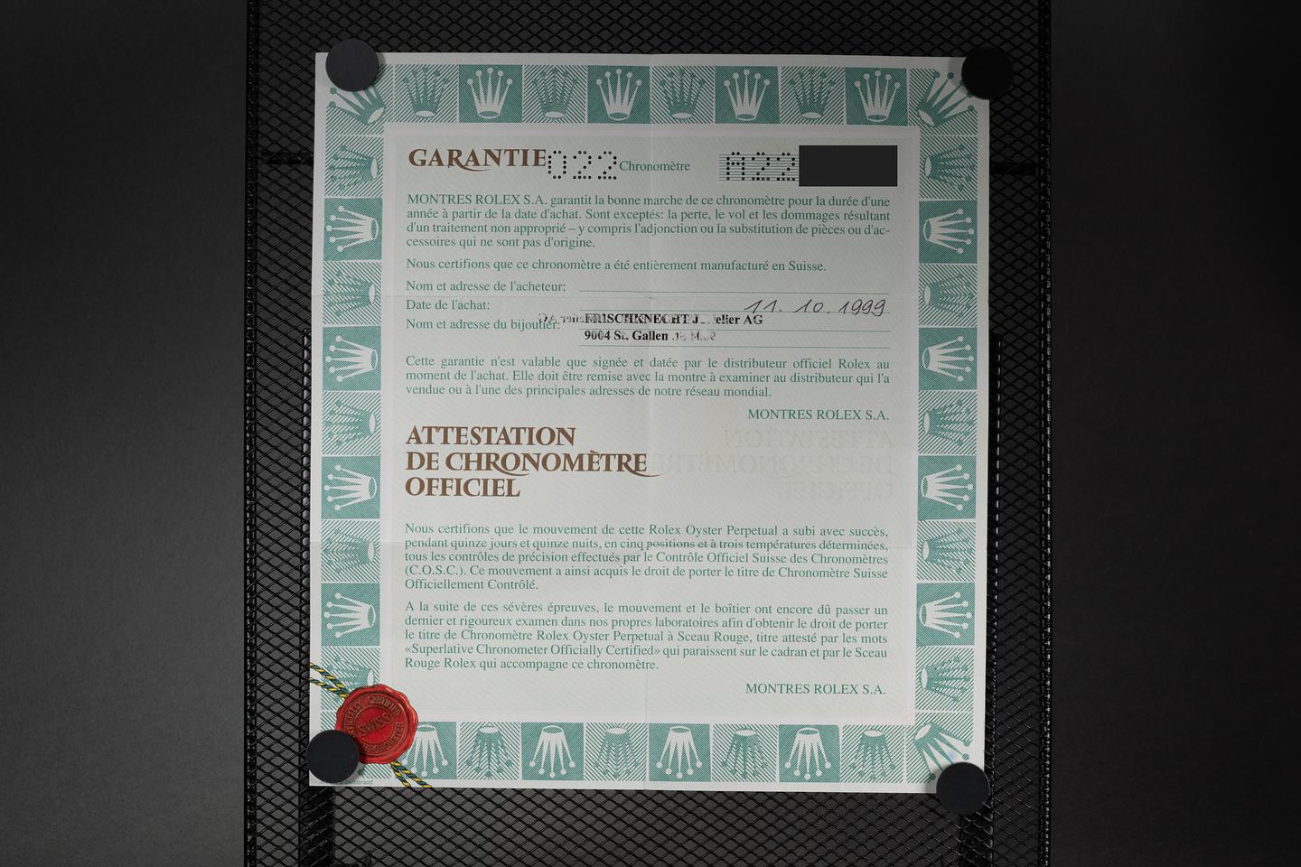 Bracelet: The 12-link Oyster bracelet is excellent, showing only extremely light stretch for its age. The clasp is stamped with a matching 1999 date code.