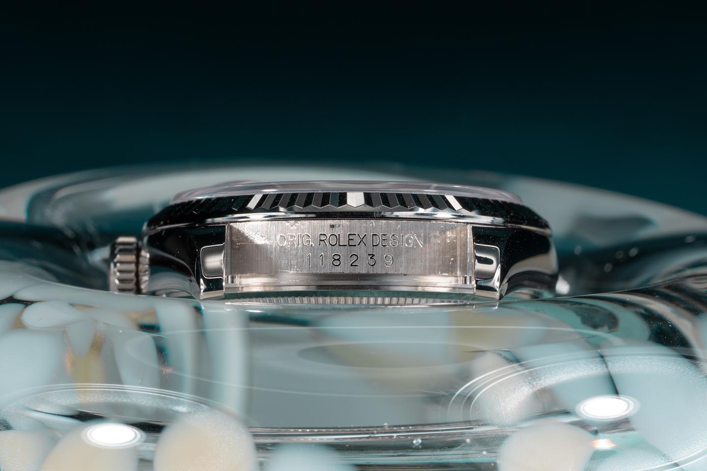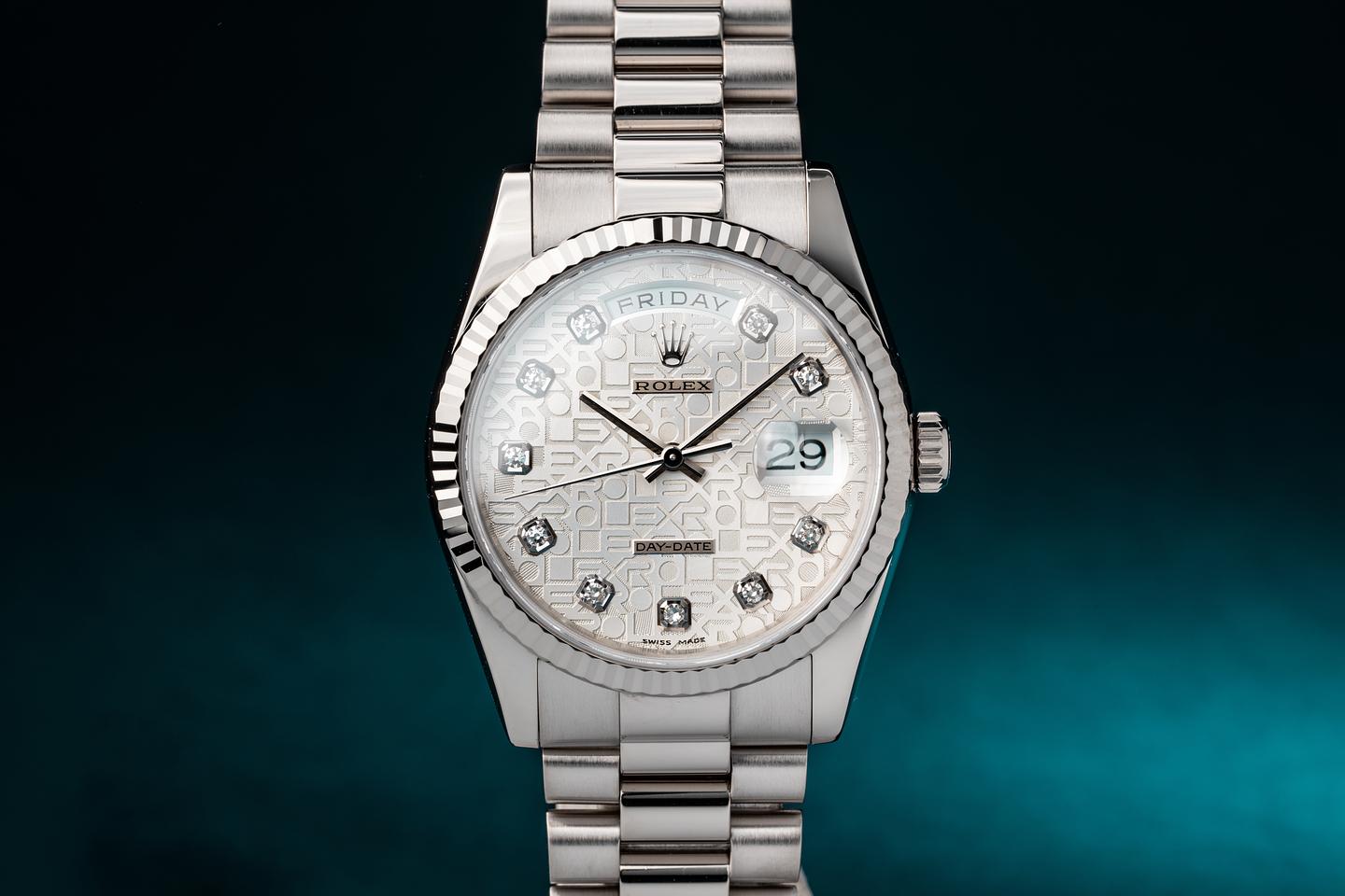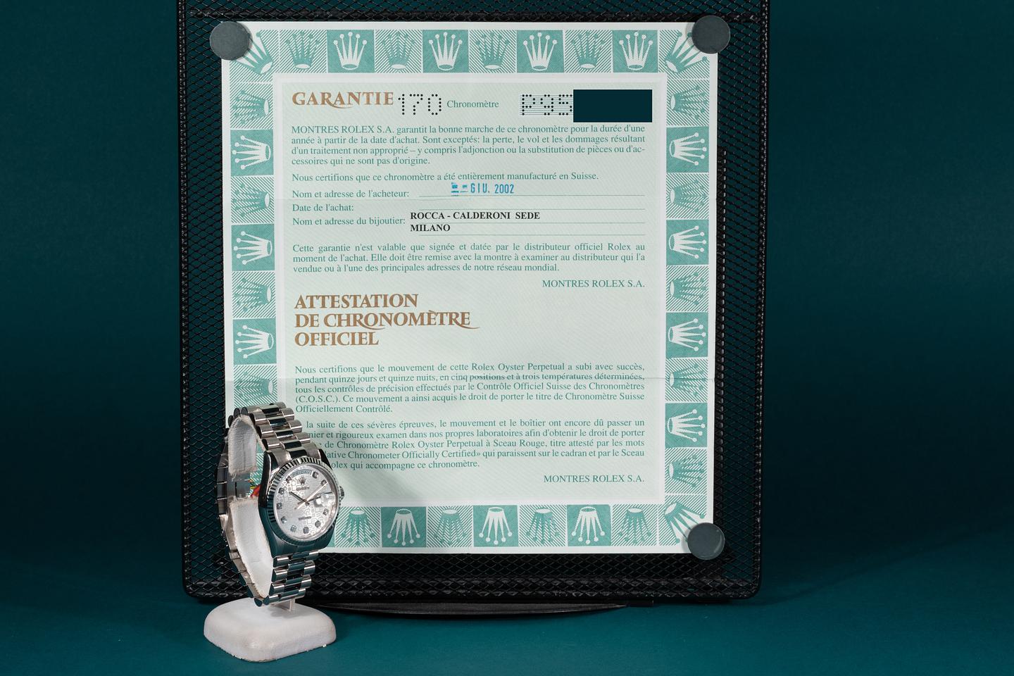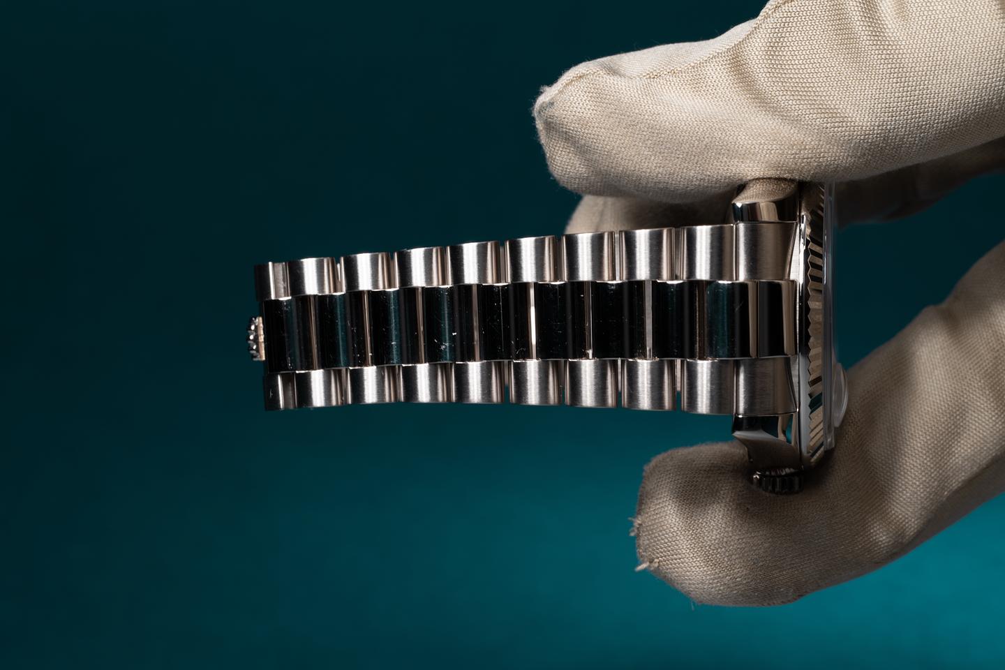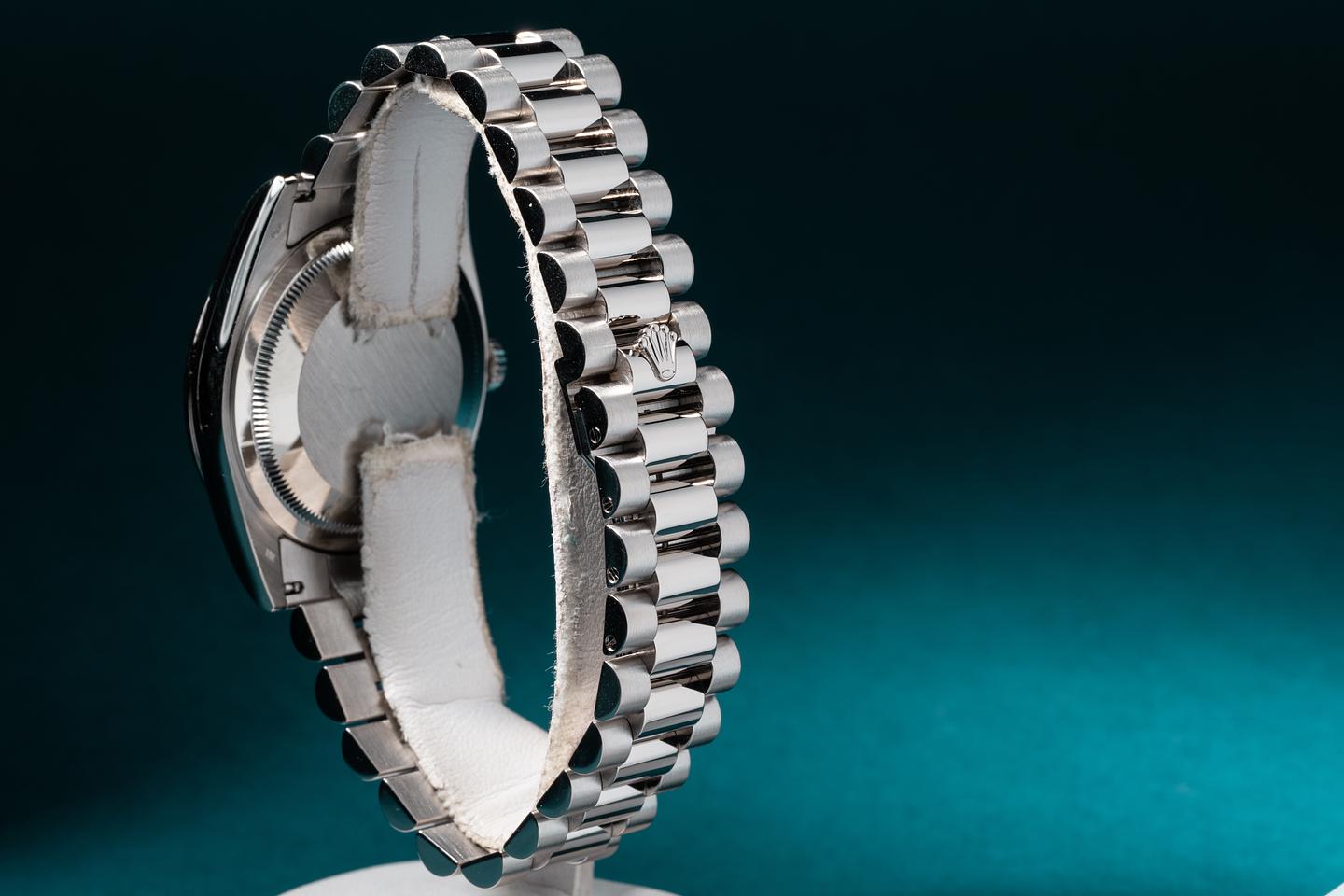 Bracelet: The 23 link 18K white gold President bracelet is excellent showing only very light stretch for its age. The clasp is stamped with a matching 2000 date code.