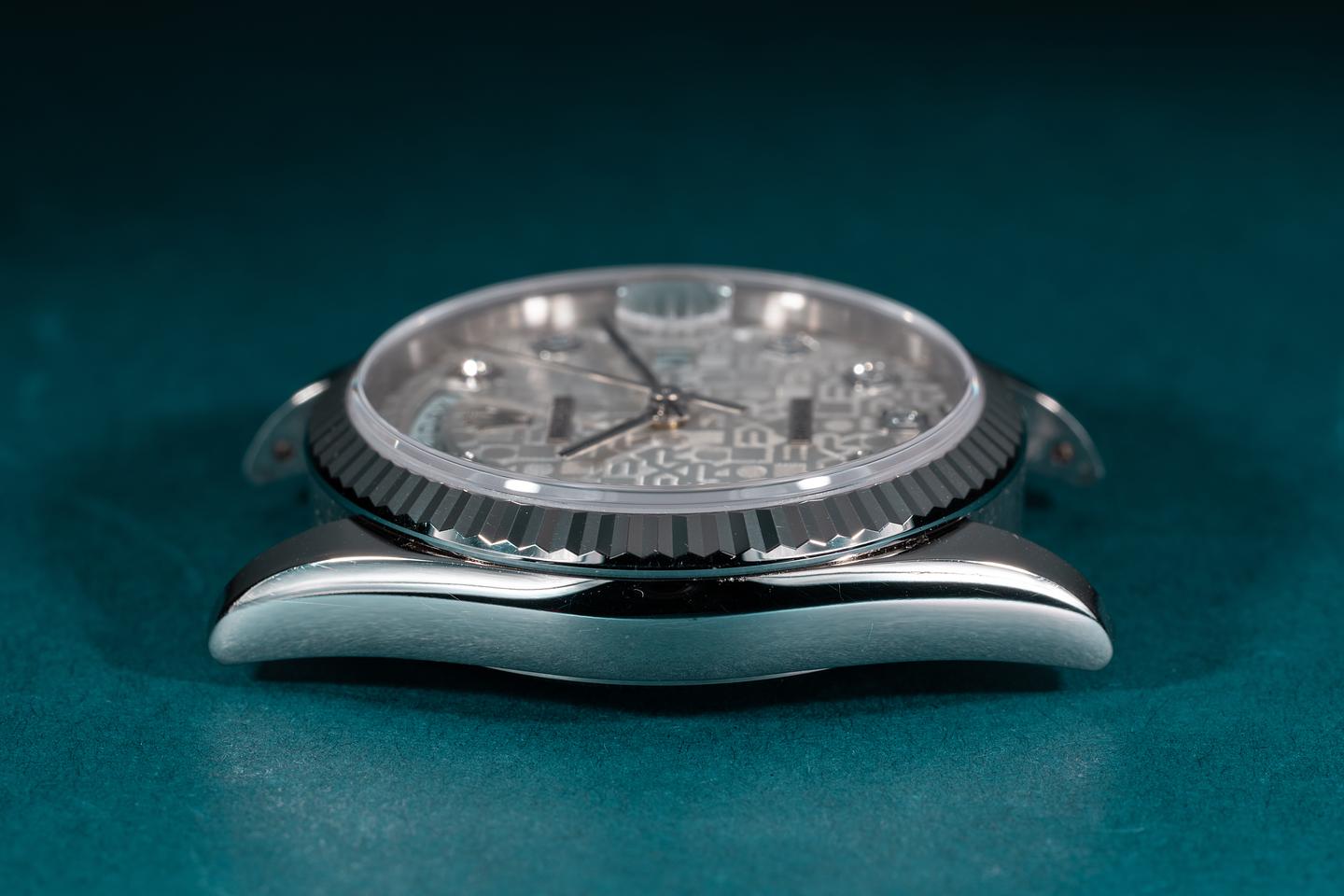 Case: The thick and even 18k white gold case is excellent showing only very light wear from use. The sharp 18k white gold fluted bezel is also in excellent condition showing only very light wear from use.