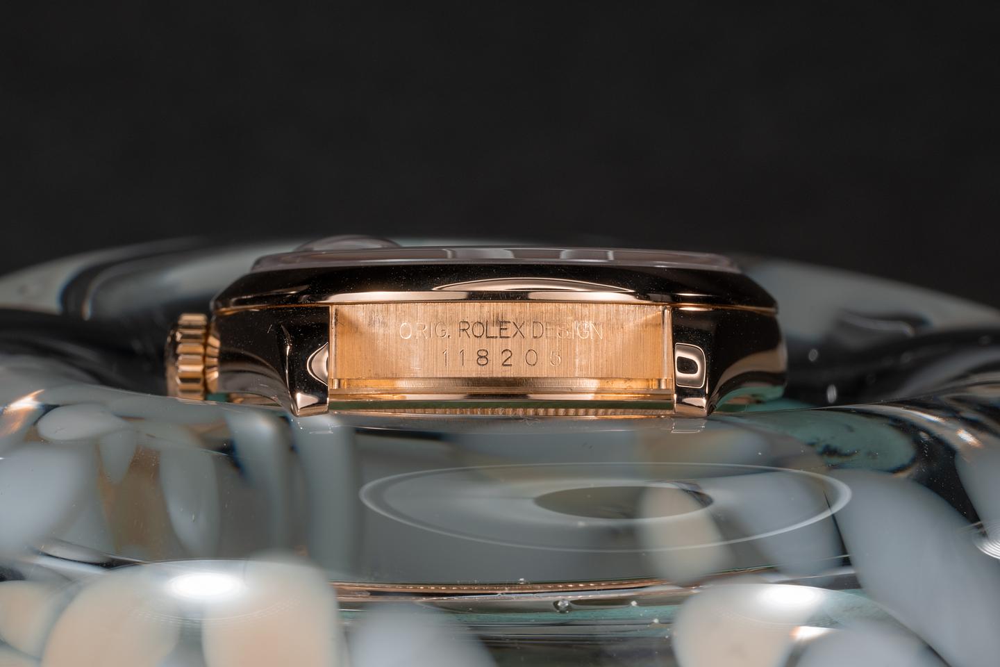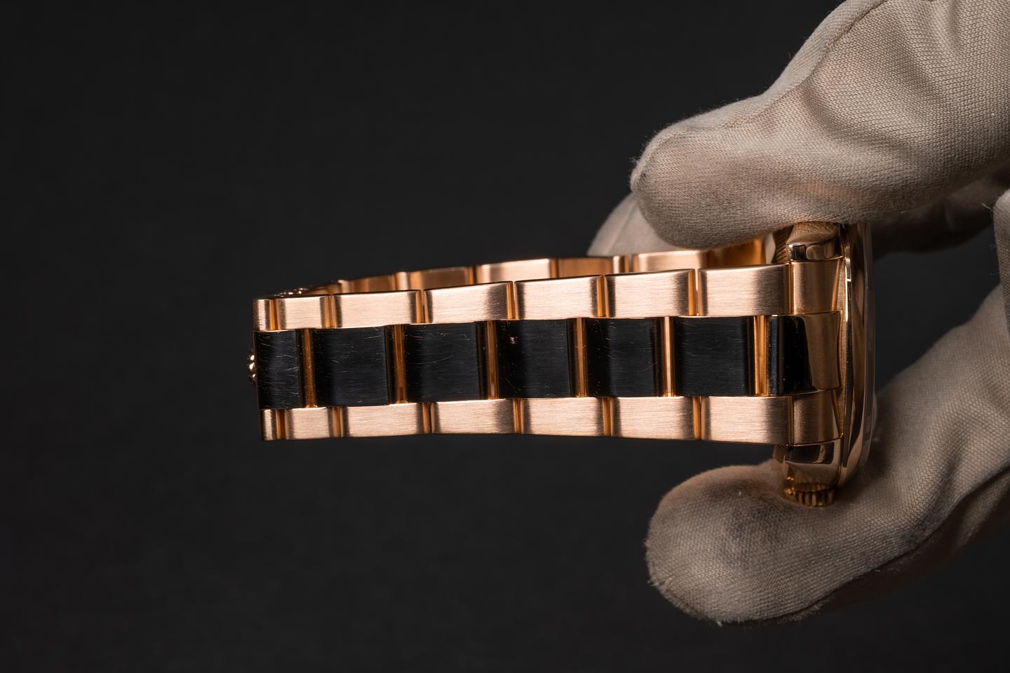 Bracelet: The 12.5 link 18k rose gold Oyster bracelet is excellent showing no perceivable stretch. The clasp is stamped with a matching 2000 date code.