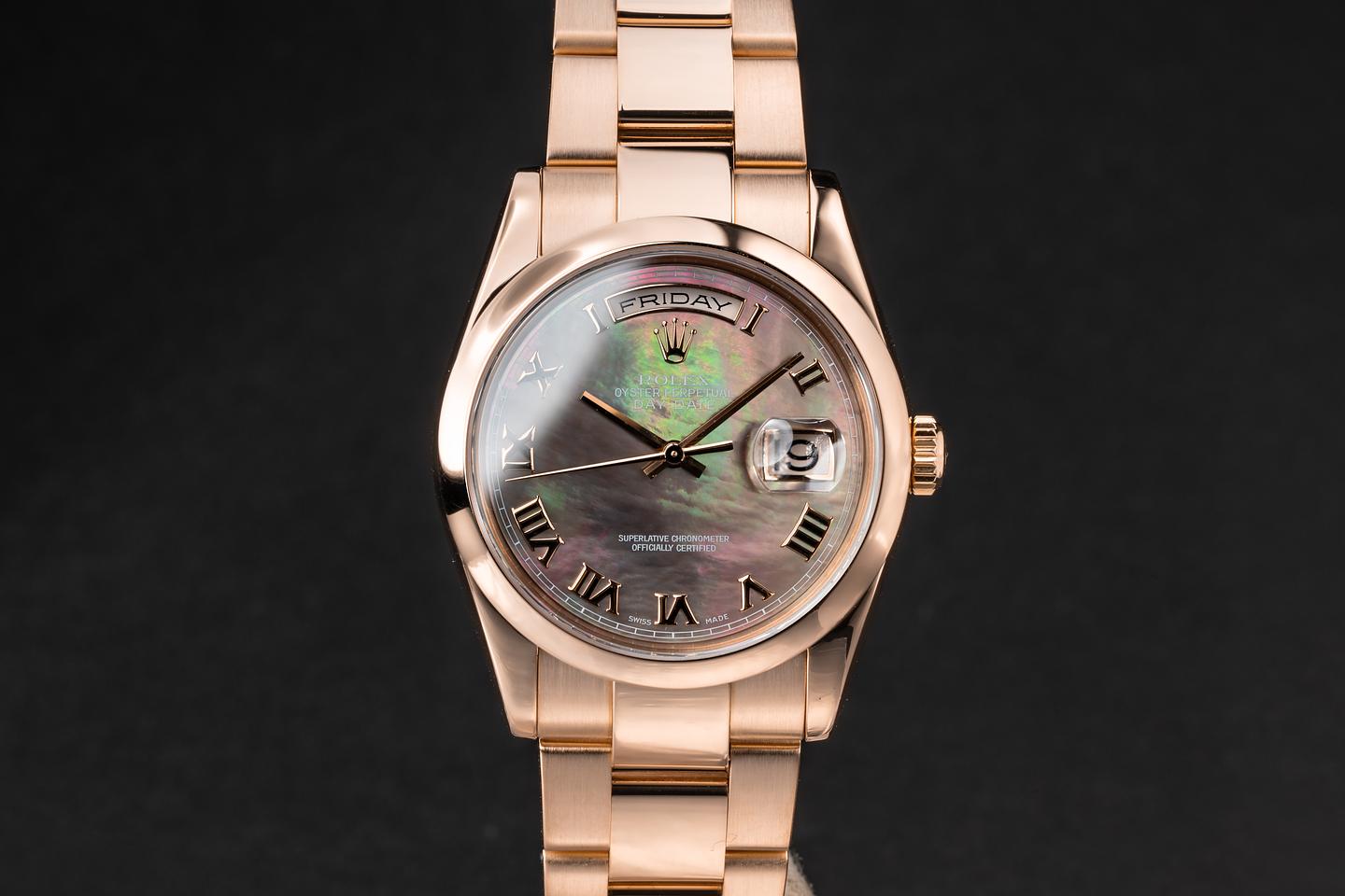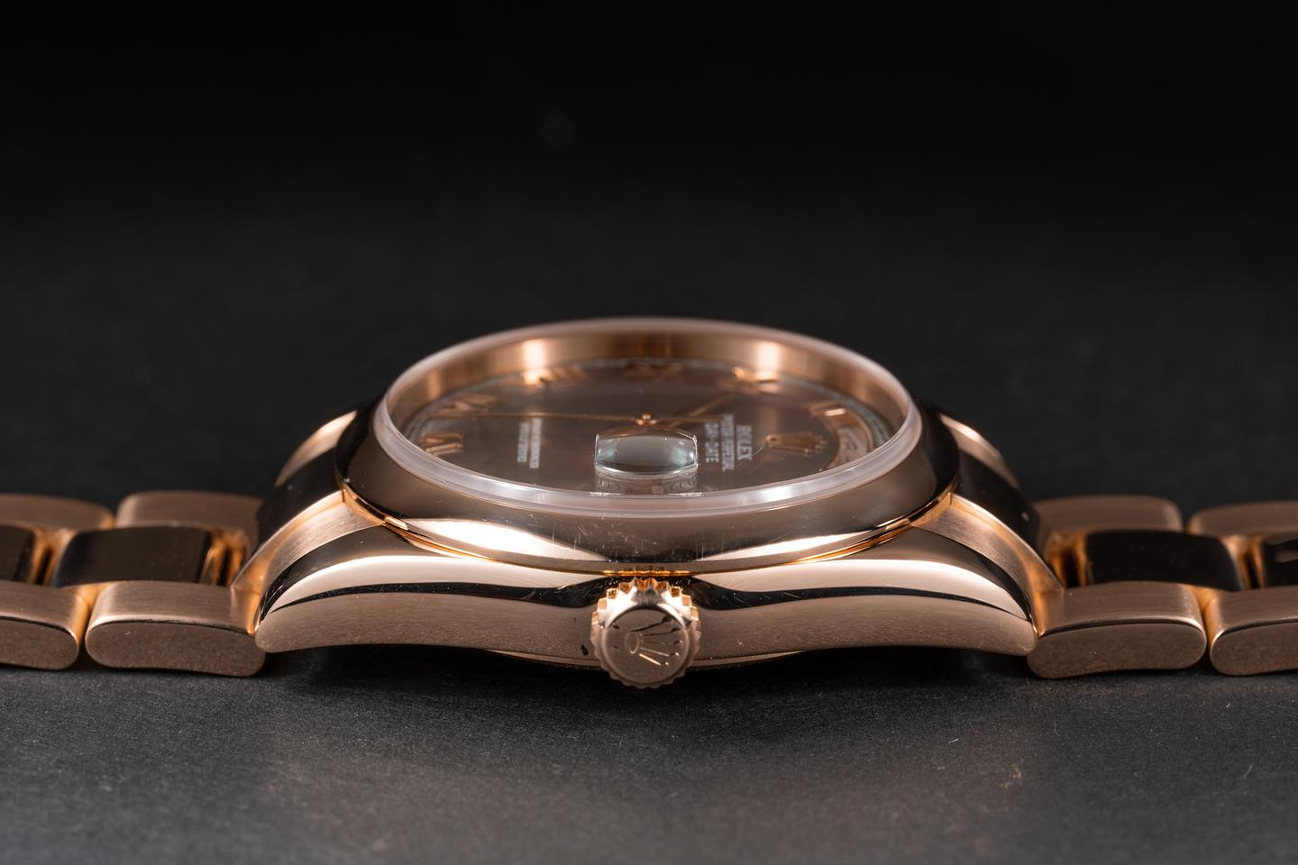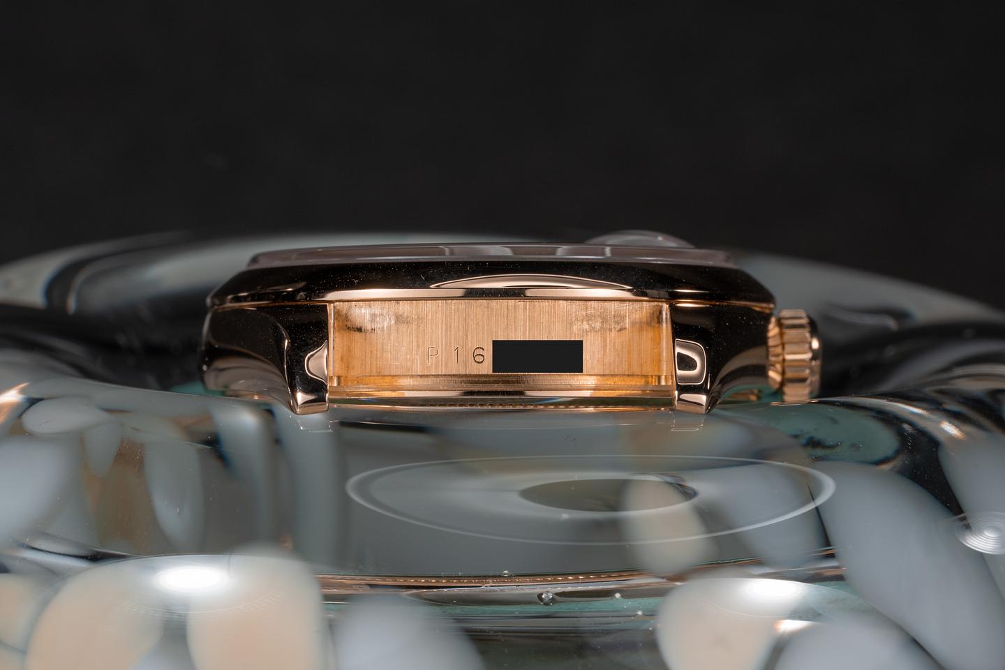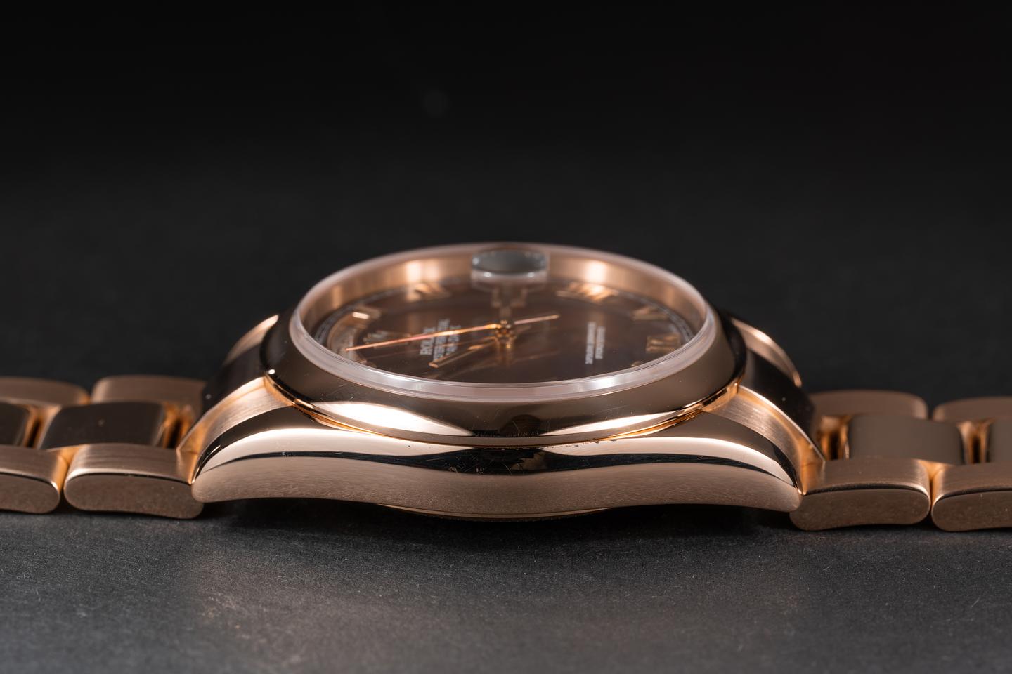 Case: The 18k rose gold case is excellent showing only very light wear from use. The smooth 18k rose gold bezel is also in excellent condition showing only very light wear from use.