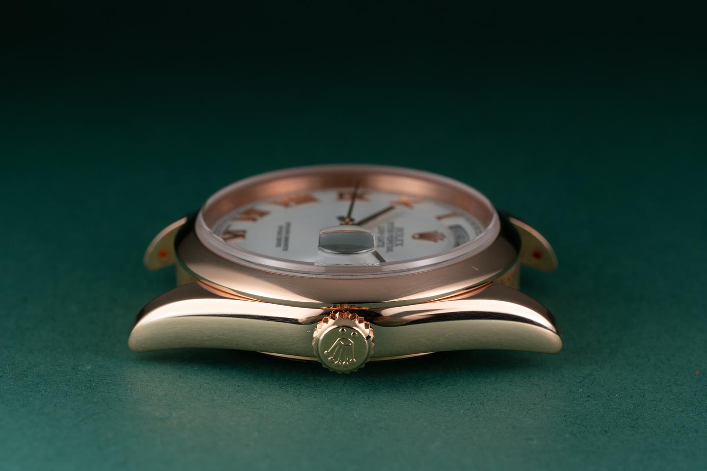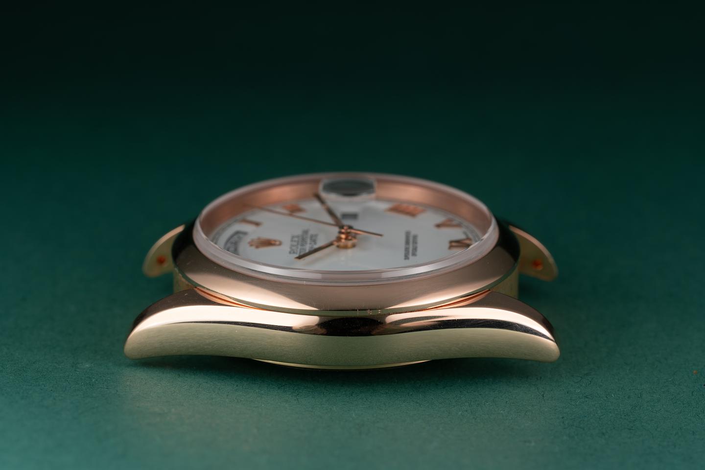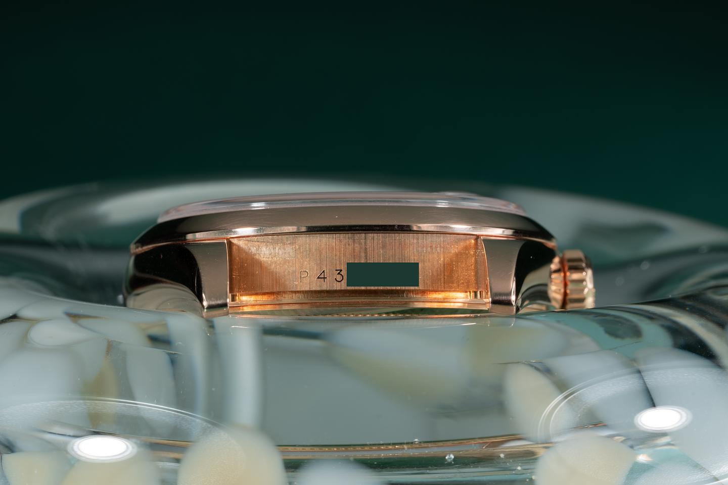 Case: The thick and even 18k rose gold case is excellent showing only light wear from use. The smooth 18k rose gold bezel is also in excellent condition showing only light wear from use.