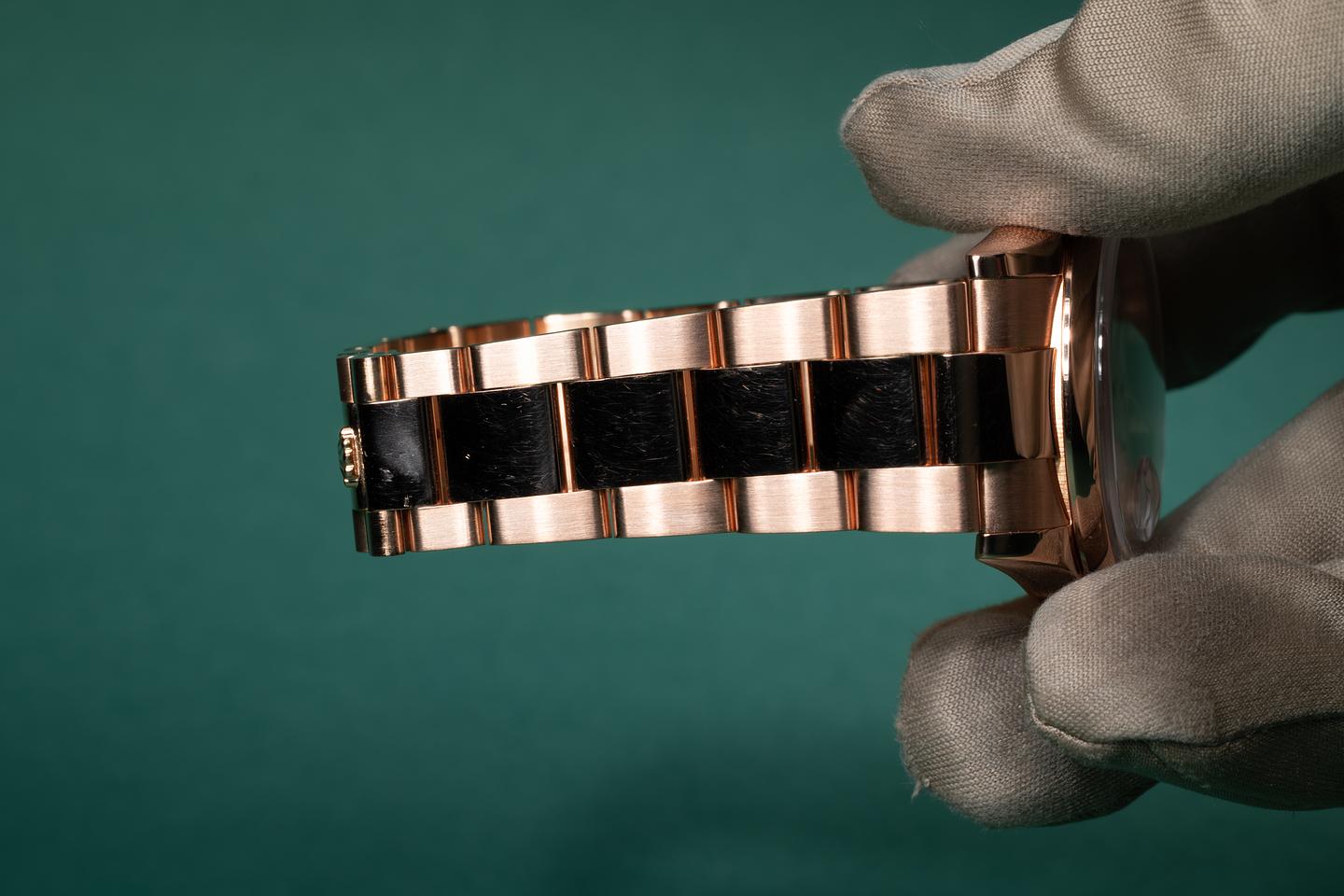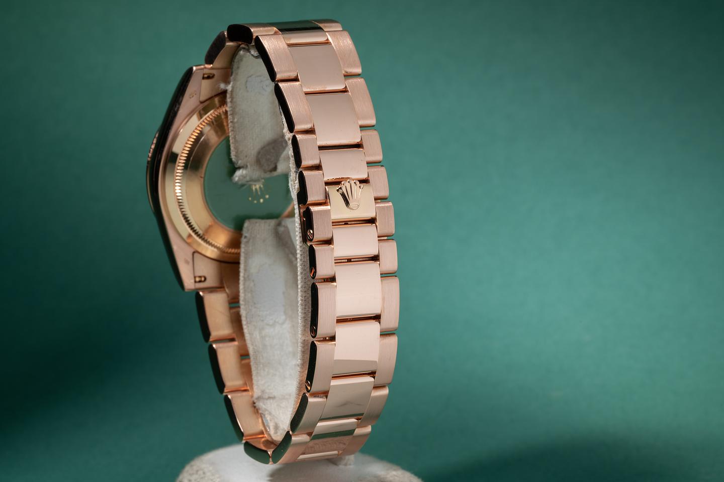 Bracelet: The 12.5 link 18k rose gold oyster bracelet is excellent showing only very light stretch for its age. The clasp is stamped with a matching 2000 date code.
