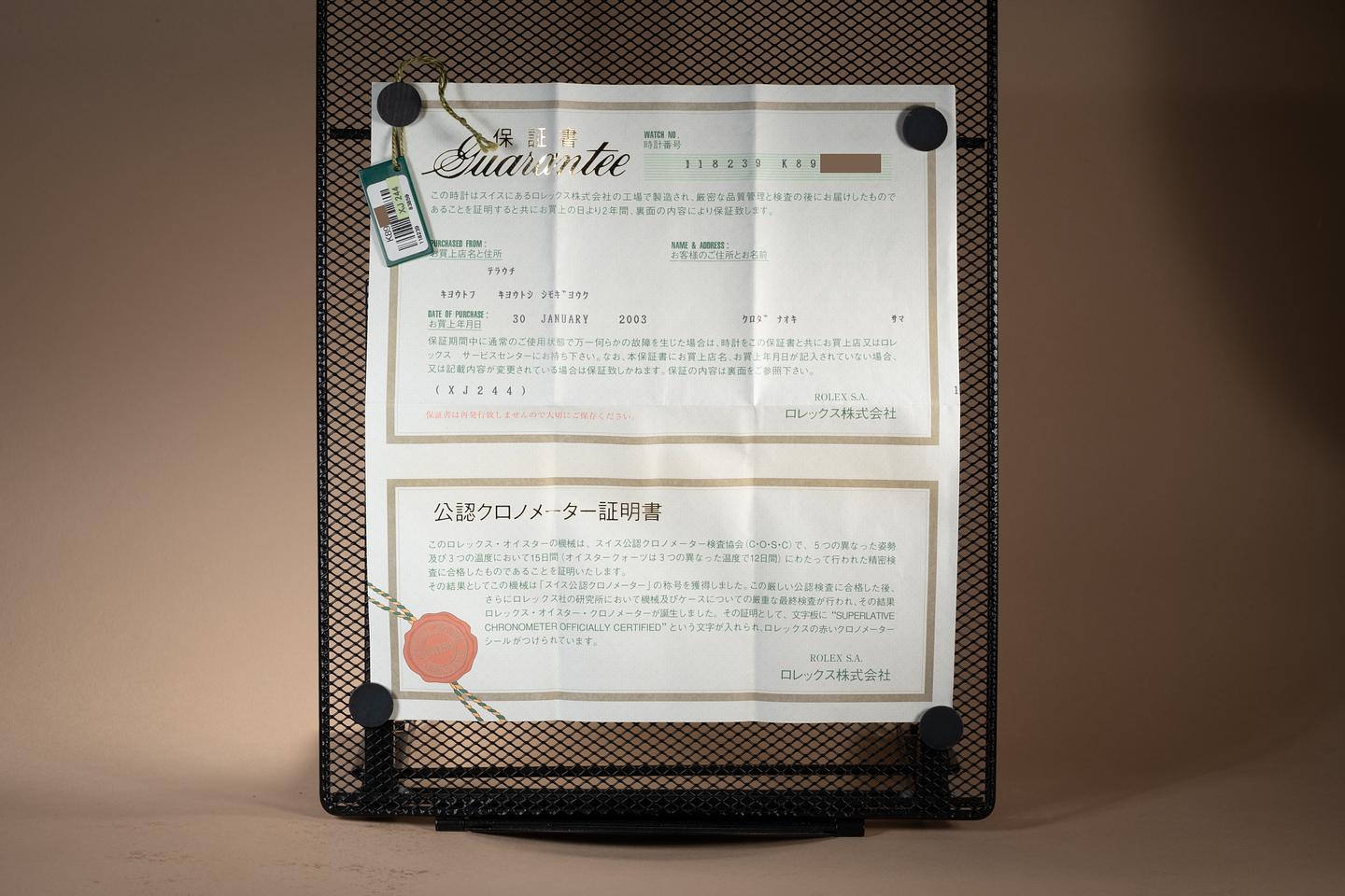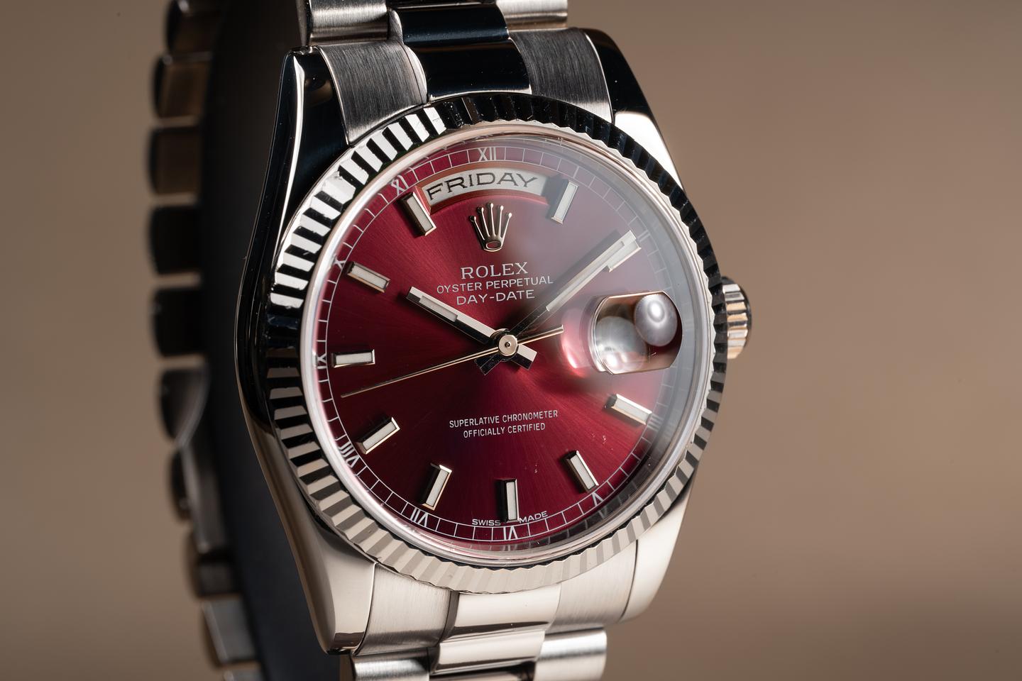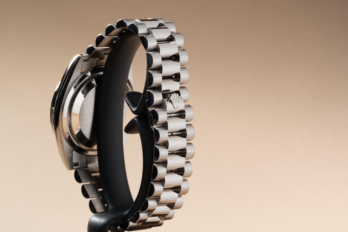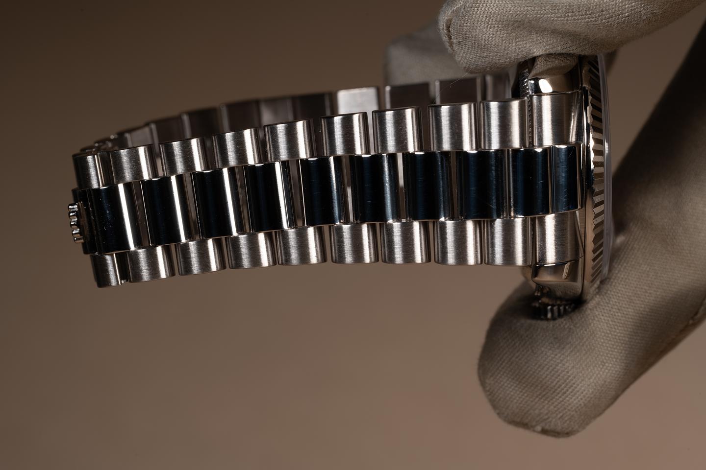 Bracelet: The 22 link 18K white gold President bracelet is excellent showing only very light stretch for its age. The clasp is stamped with a matching 2000 date code. The bracelet will fit up to a 17.2 cm. / 6.77" wrist.