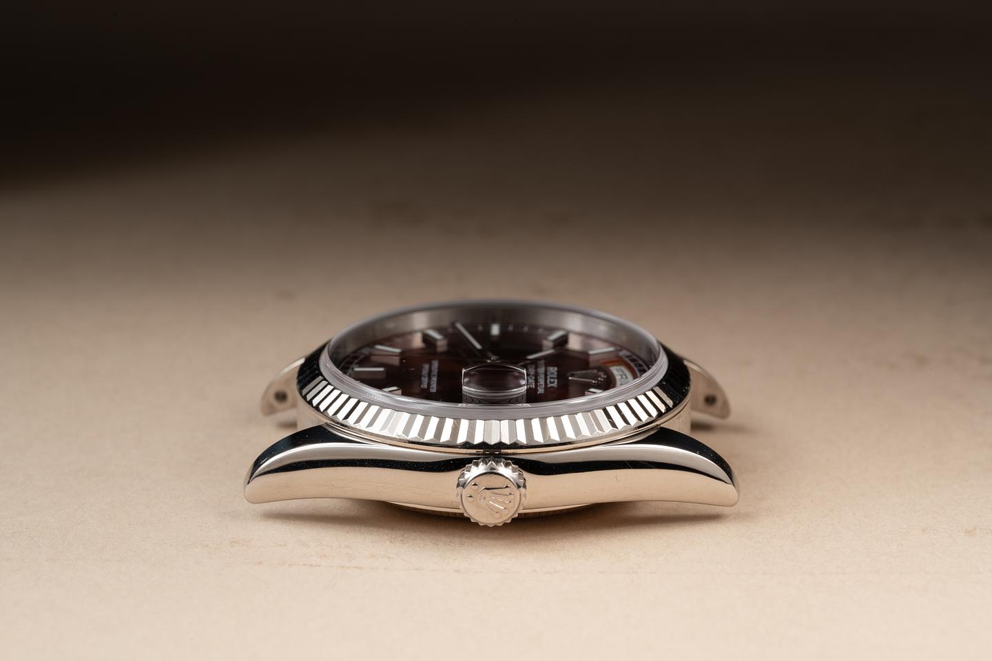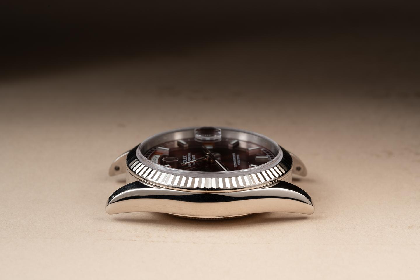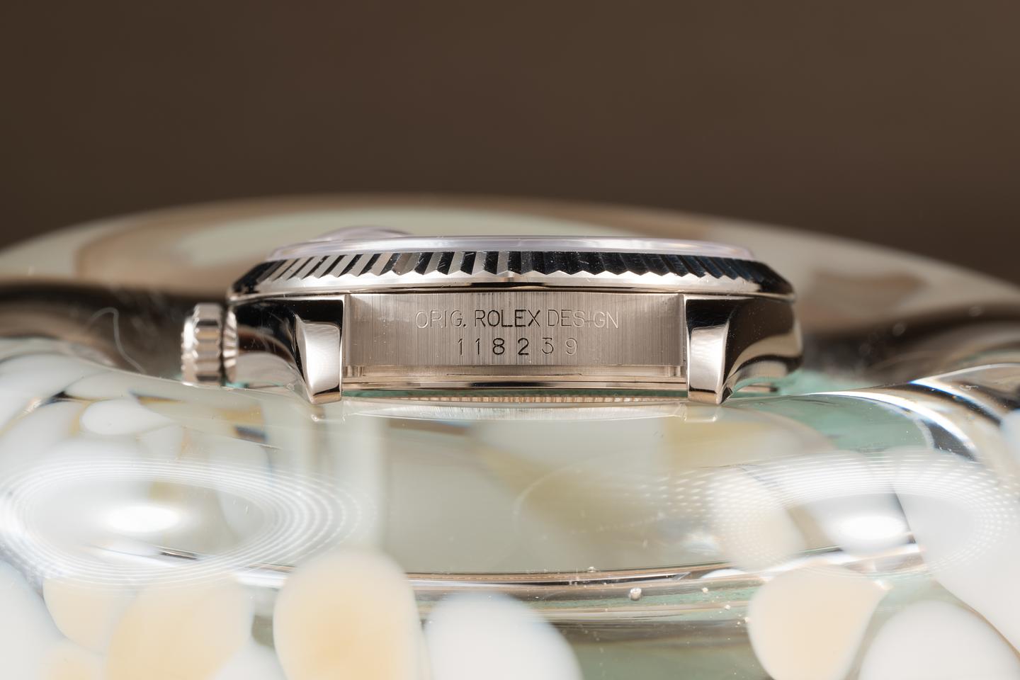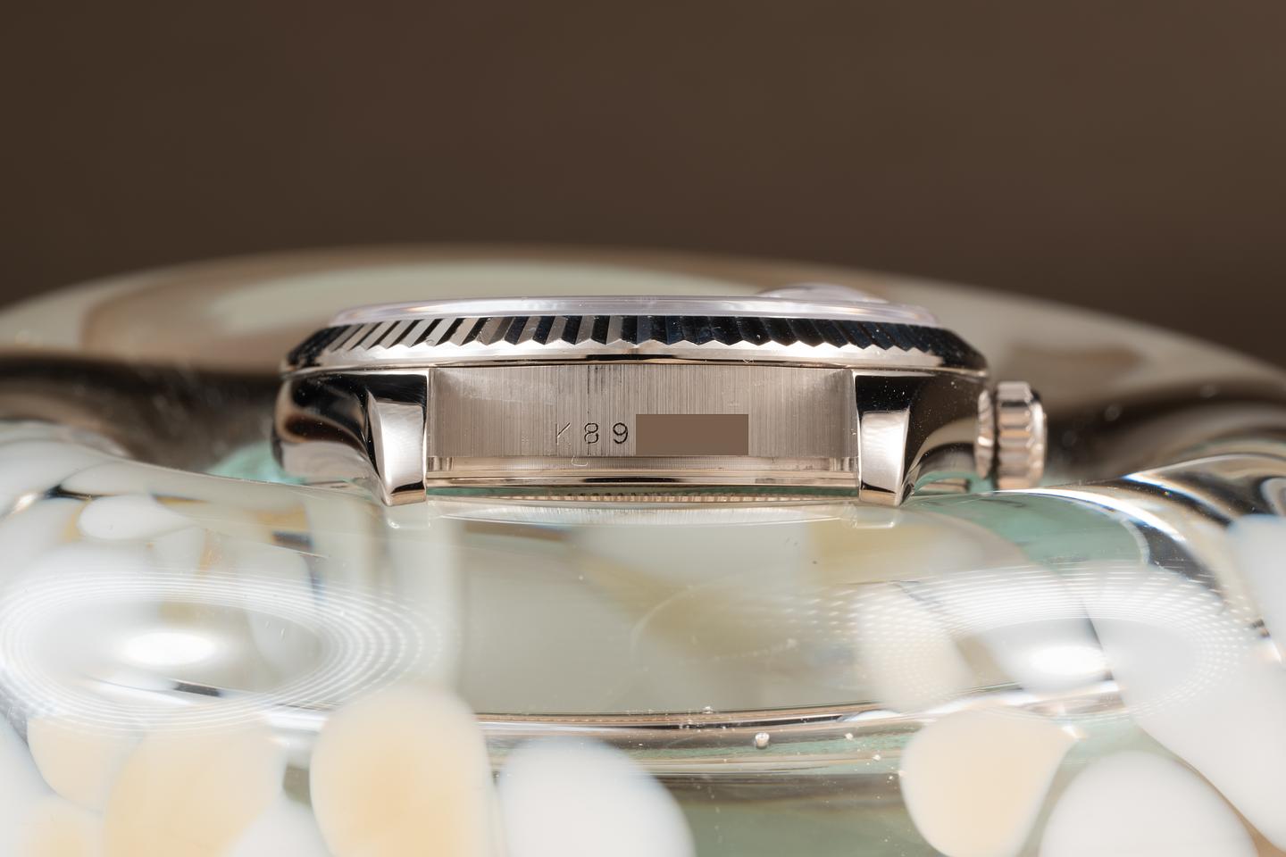 Case: The recently polished 36mm 18K white gold case is excellent showing only very light wear from use. The 18K white gold fluted bezel is also in excellent condition showing only light wear. There is some light chipping on the crystal.