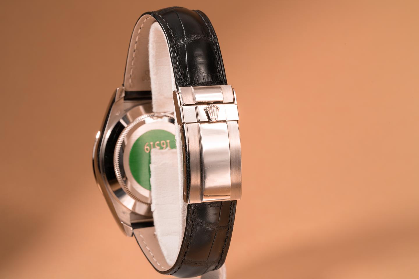 Bracelet: New Rolex black alligator strap with Rolex WG clasp.