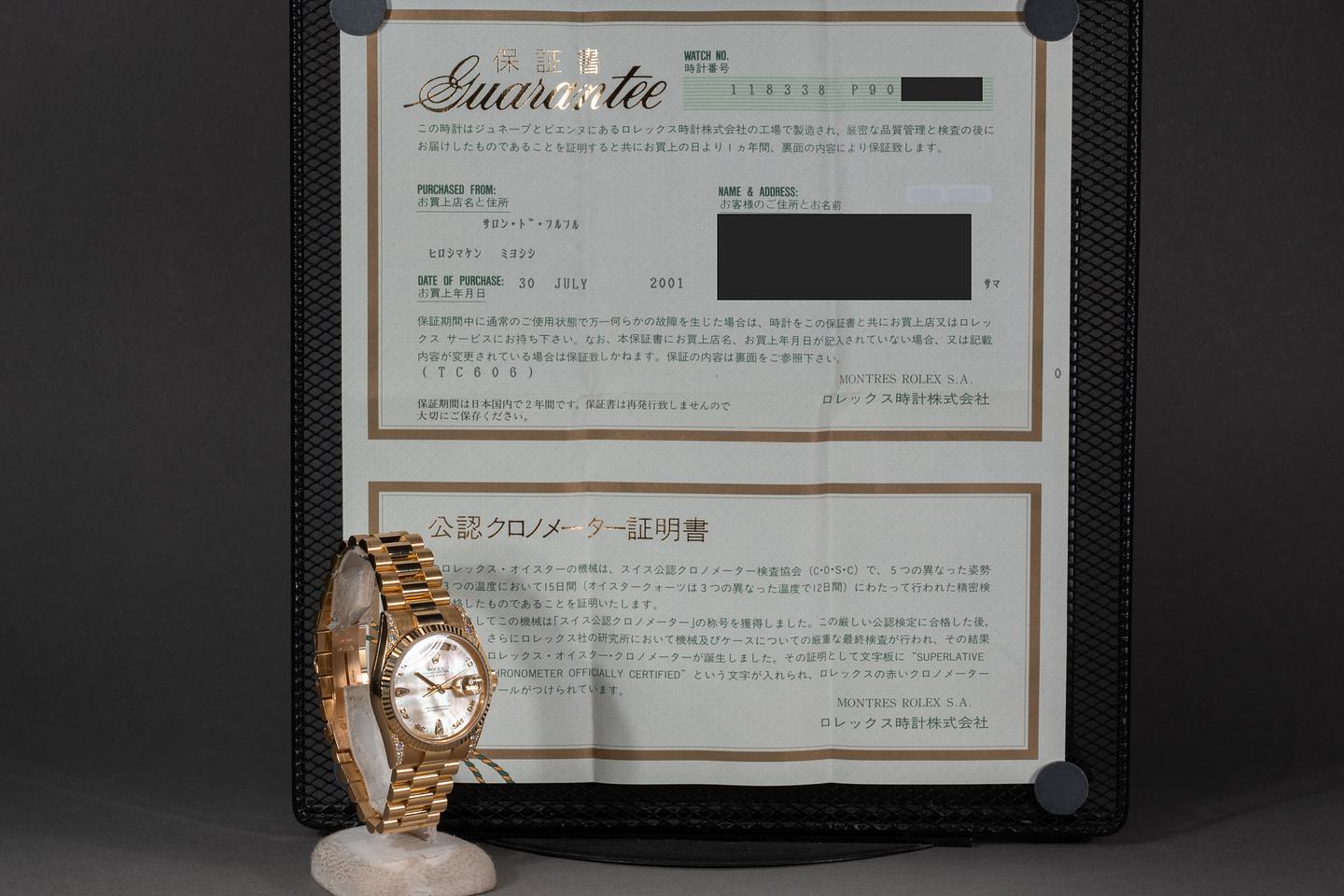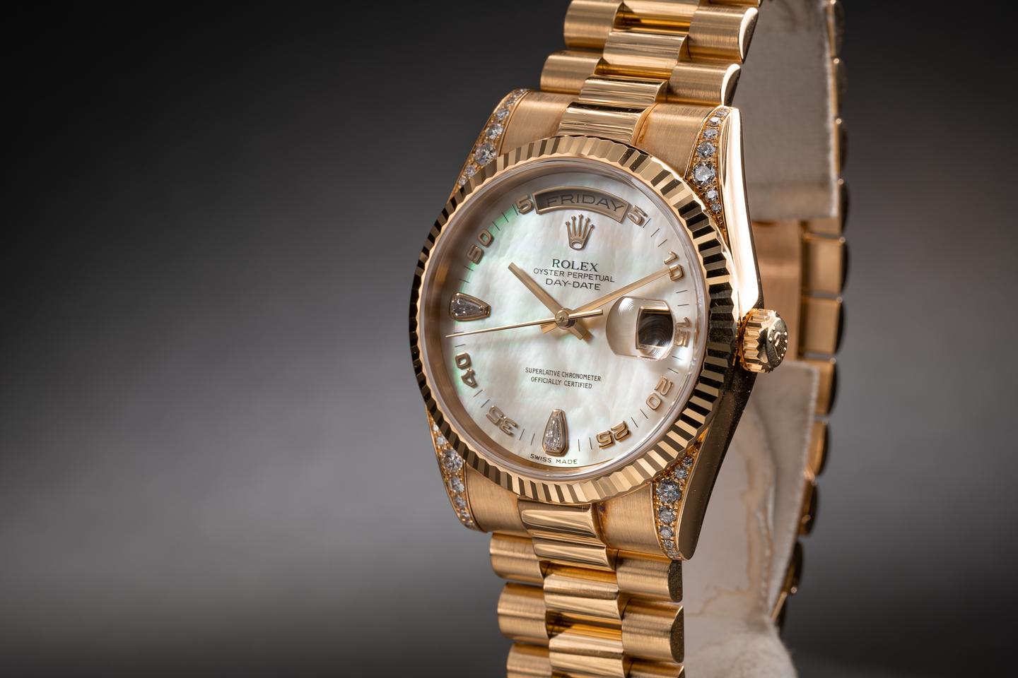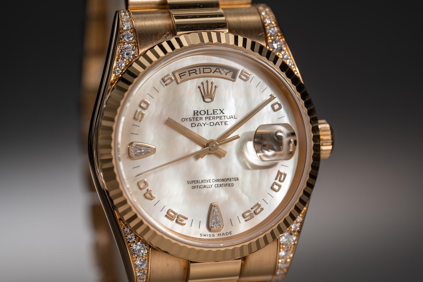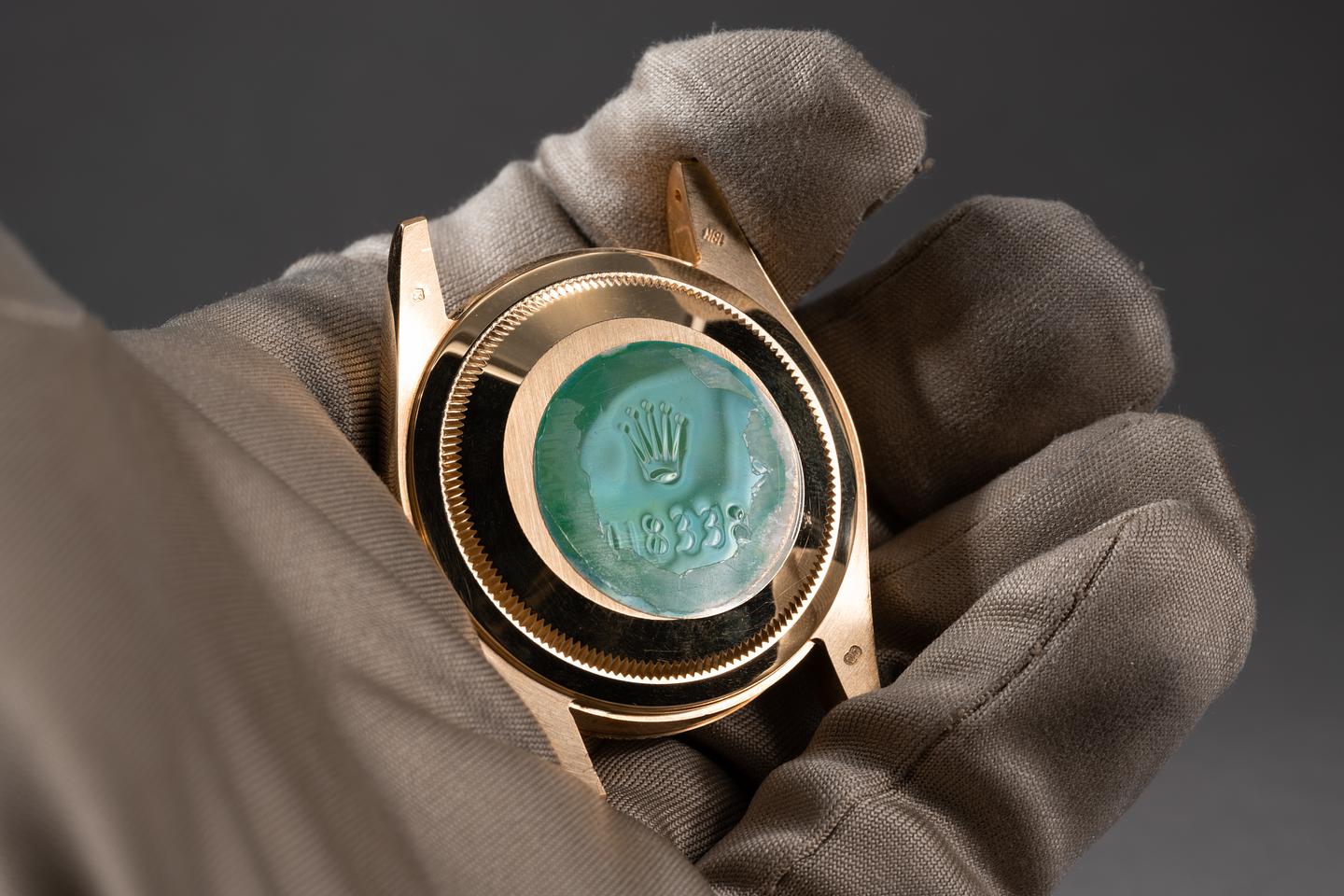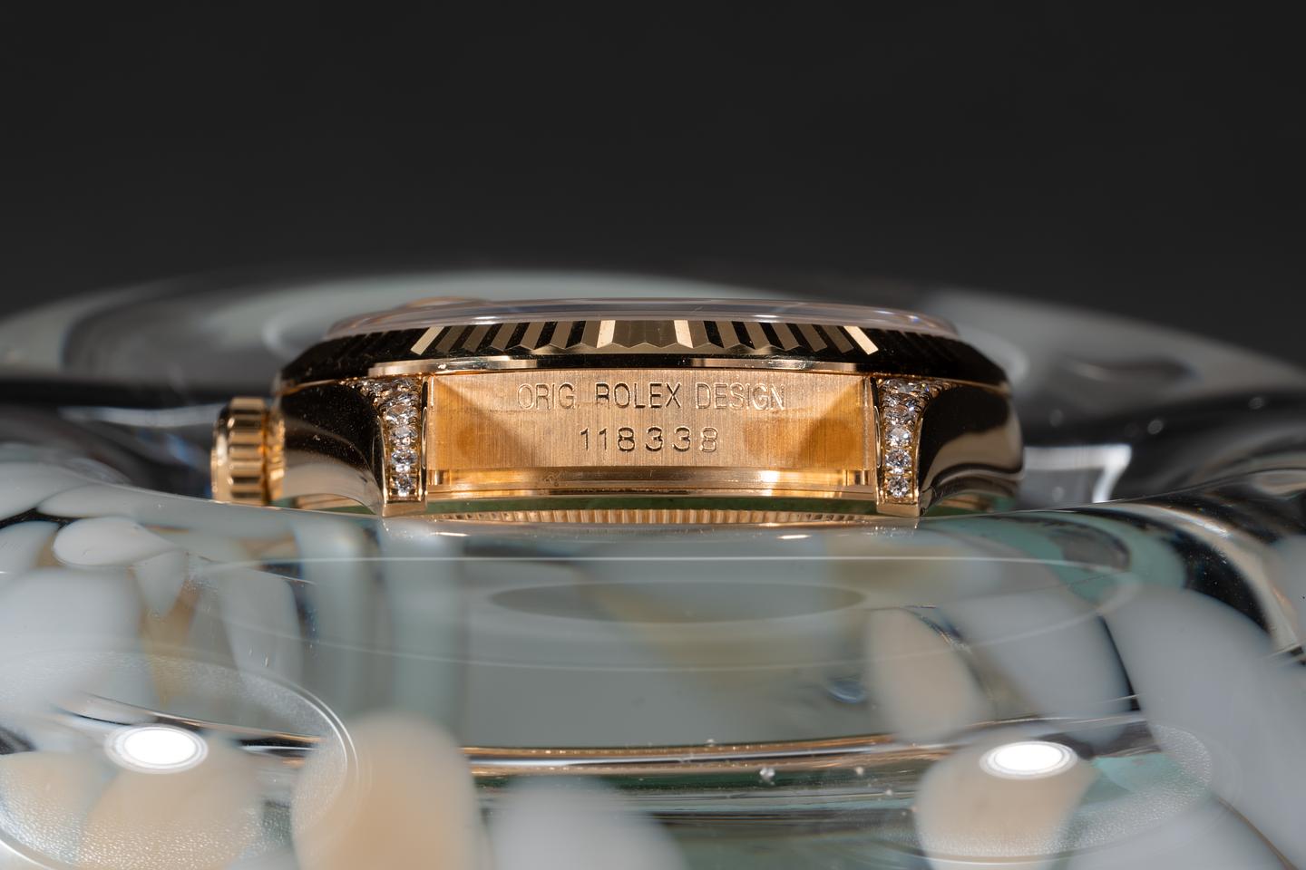 Case: The 18k yellow gold diamond encrusted case is excellent showing only extremely light wear from use. The sharp 18k fluted bezel is also in excellent condition showing only extremely light wear from use. The original factory sticker is still in place on the caseback.
