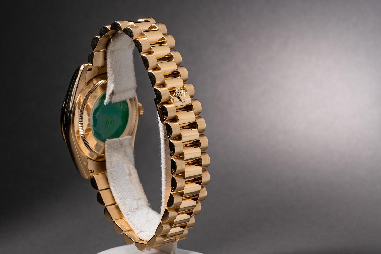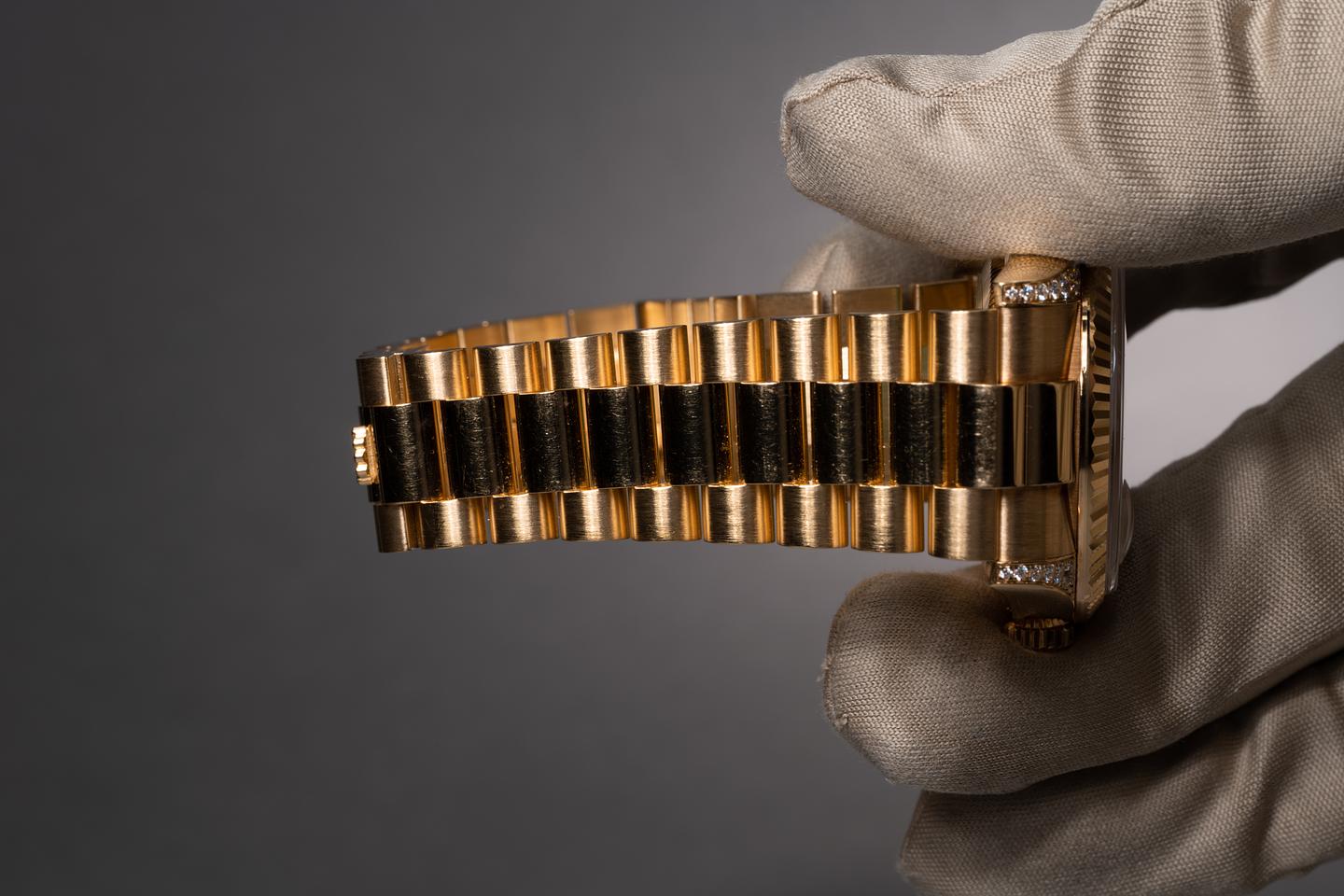 Bracelet: The 24 link 18k yellow gold President bracelet is excellent showing no perceivable stretch. The clasp is stamped with a matching 2000 date code.