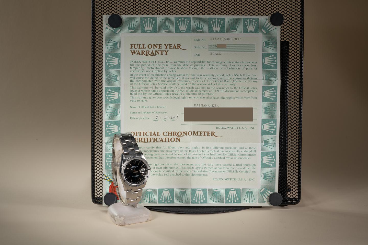 Bracelet: The 12 link Oyster bracelet is excellent showing only very light stretch for its age. The clasp is stamped with a matching 2000 date code.