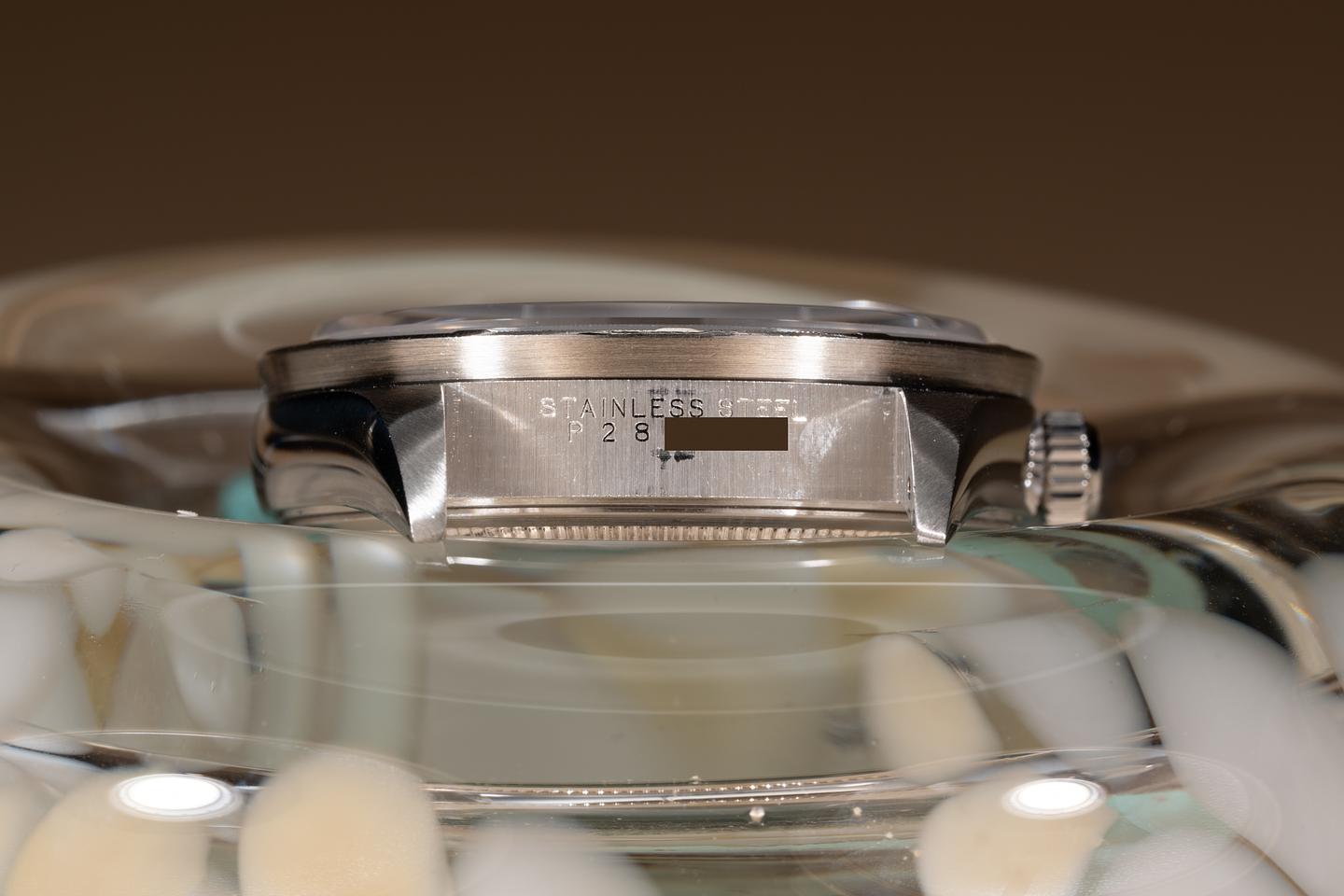 Case: The thick and even 34mm no holes case is excellent showing only very light wear from use. The stainless engine turned bezel is also in excellent condition showing only very light wear from use.
