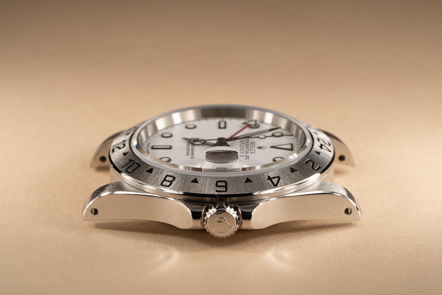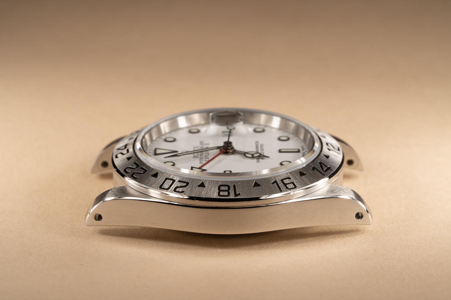 Case: The recently polished case is excellent showing only very light wear. The stainless bezel is also in excellent condition with a sharp and well-defined sunburst finish.