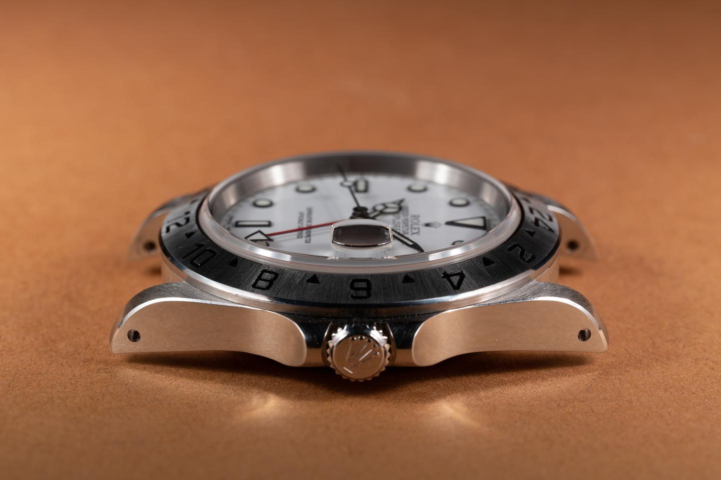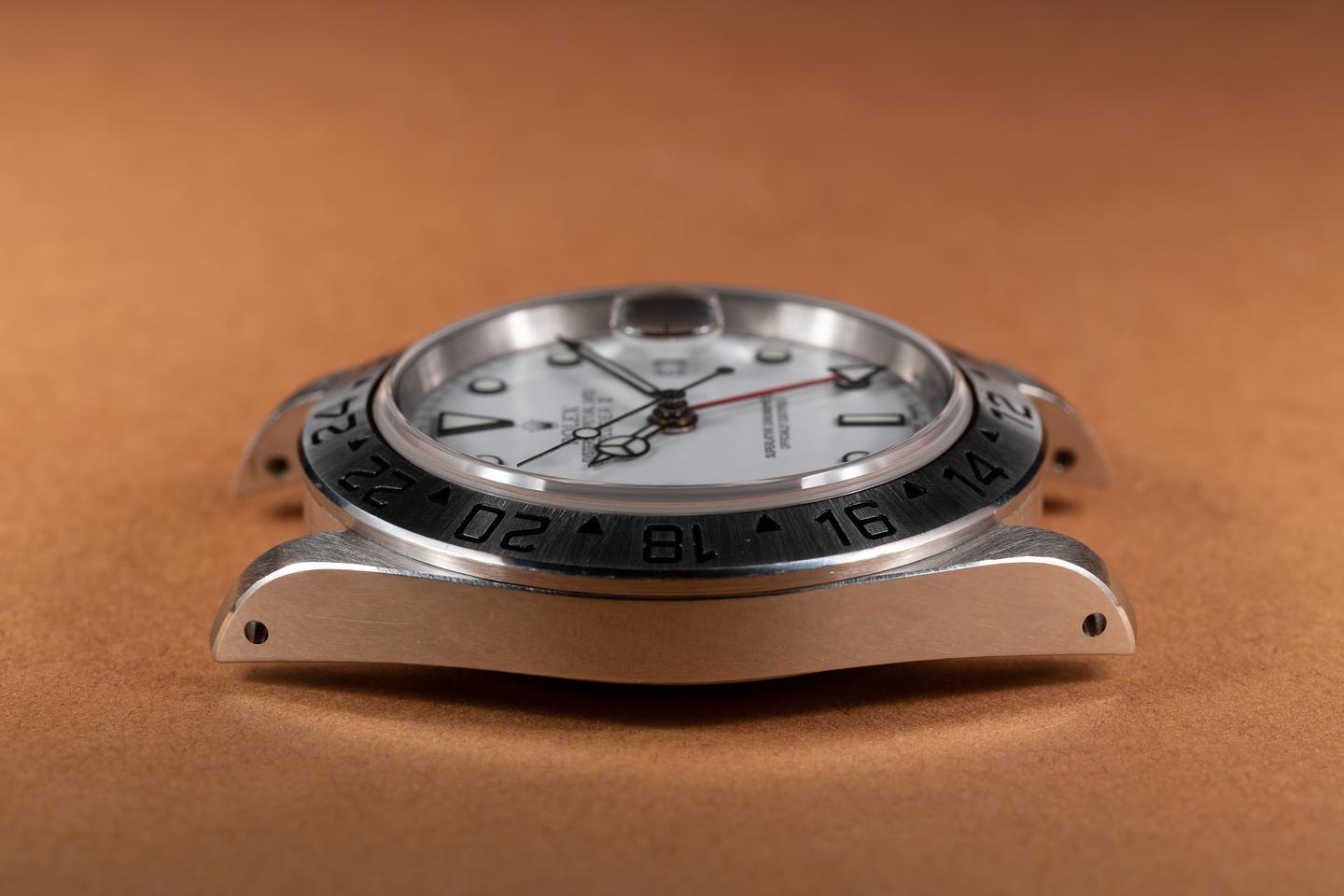 Case: The recently polished case is excellent showing sharp prominent bevels and only light wear from use. The stainless bezel is also in excellent condition showing a sharp well-defined sunburst finish