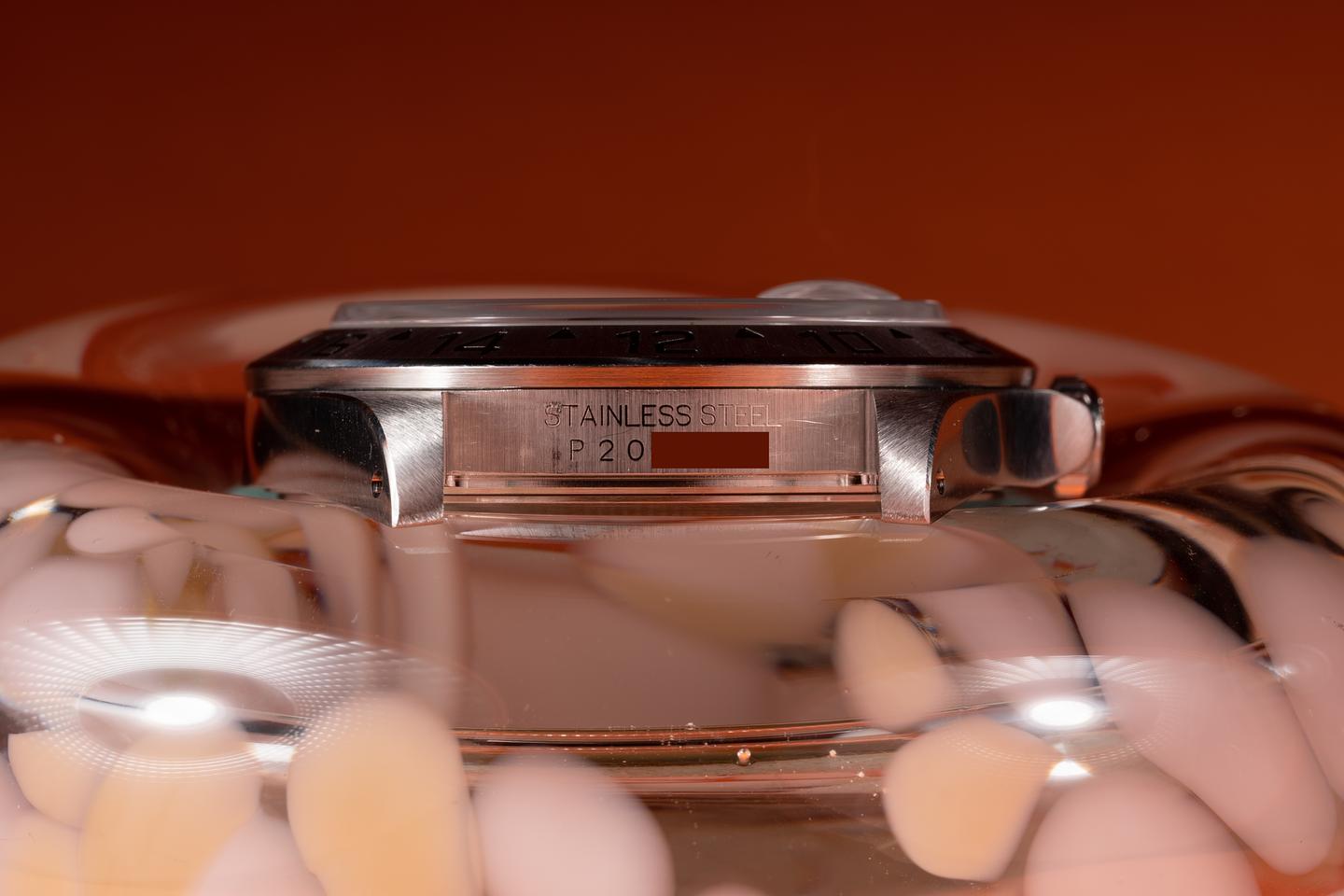 Case: The recently polished case is excellent showing sharp prominent bevels and only light wear from use. The stainless bezel is also in excellent condition showing a sharp well-defined sunburst finish