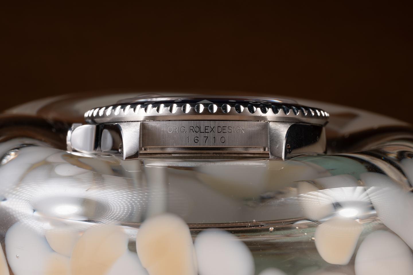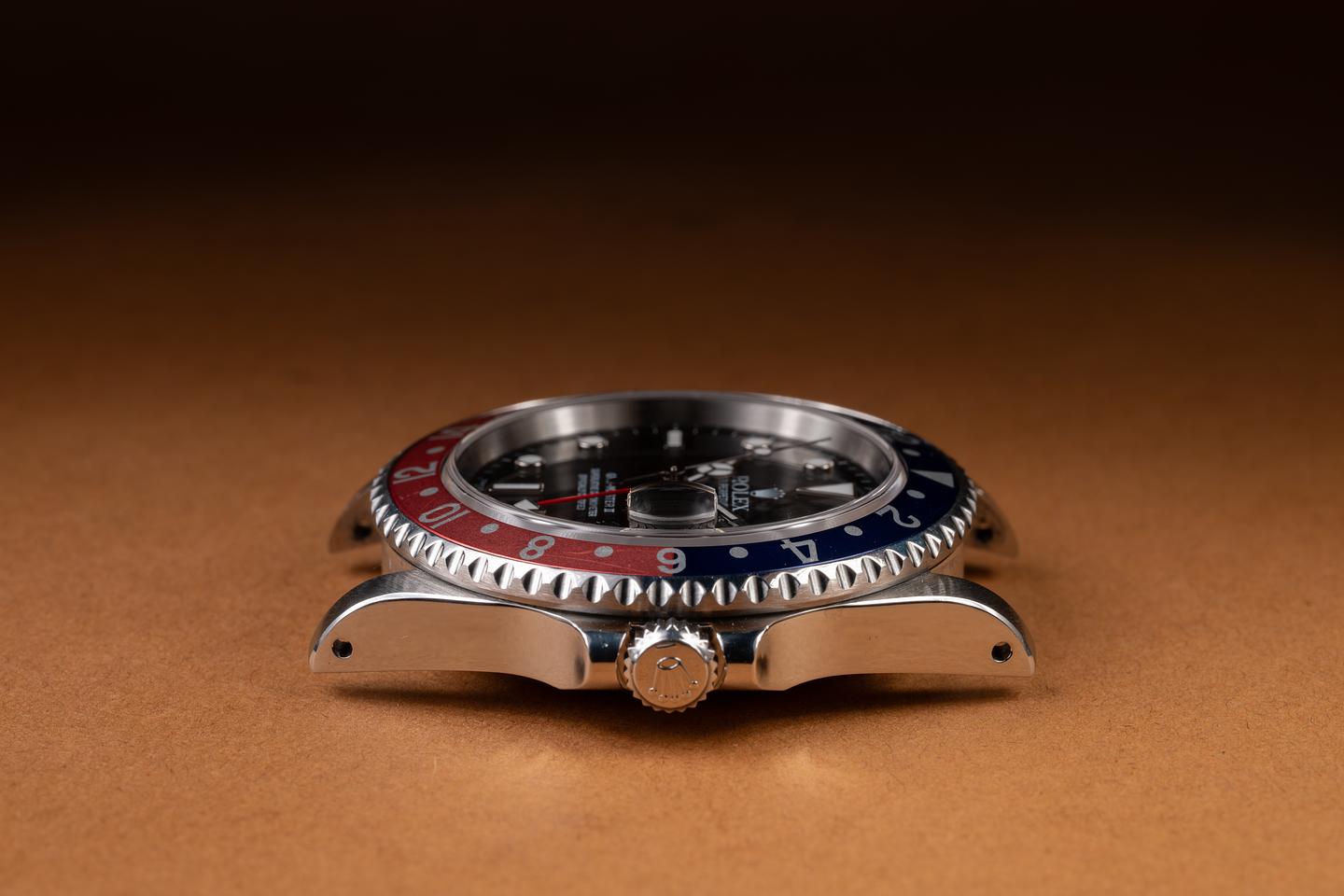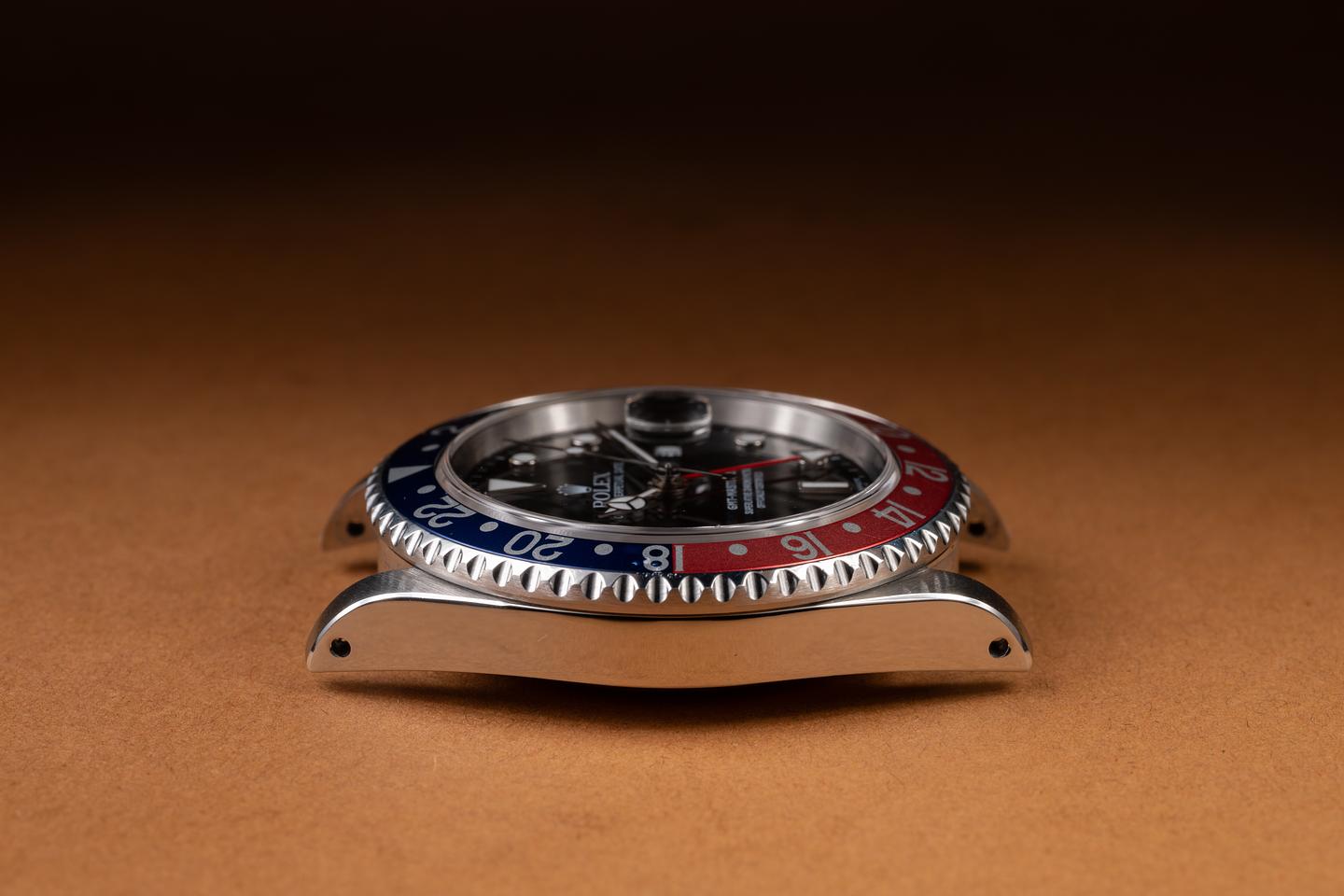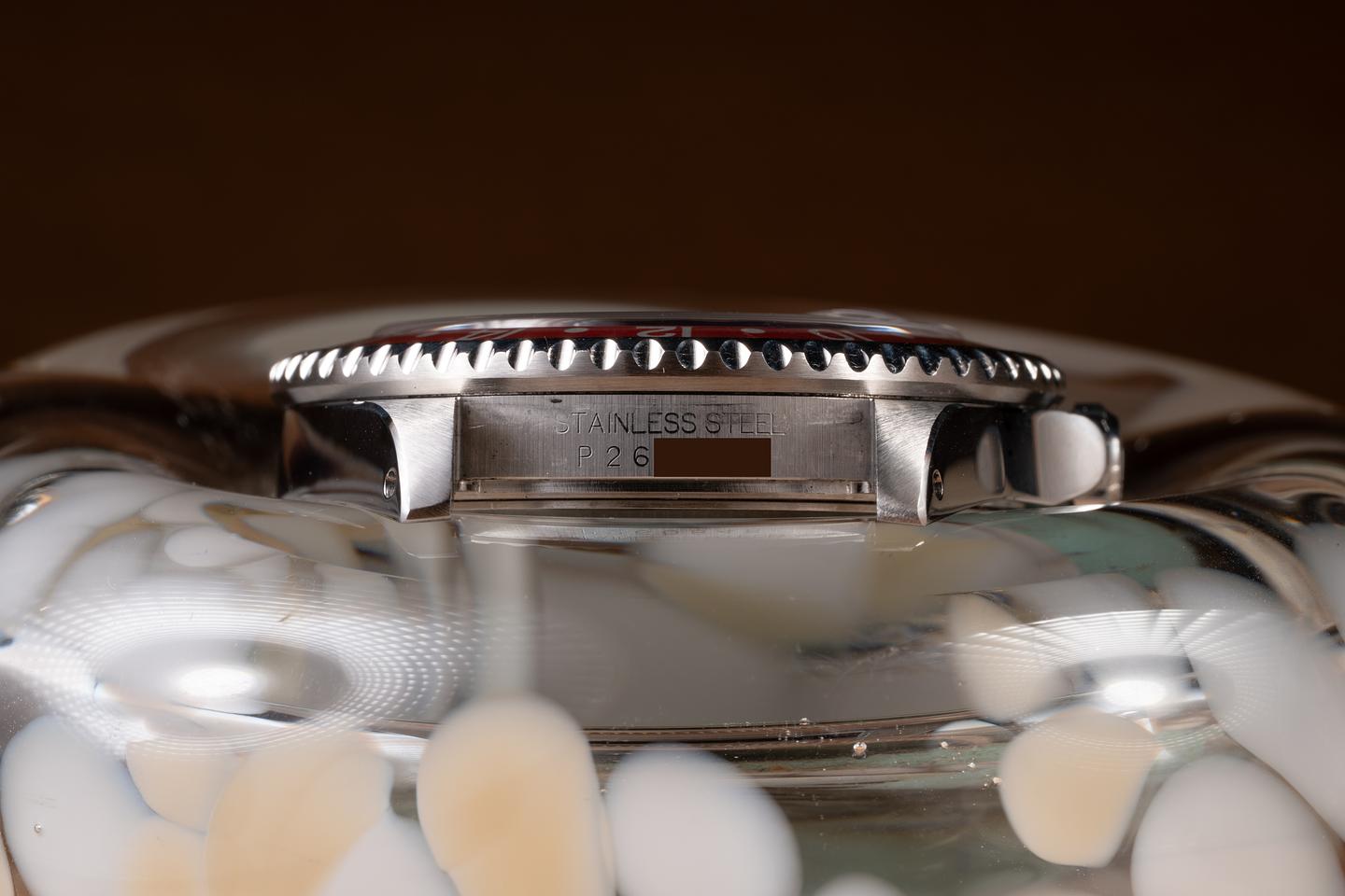 Case: The recently polished case is excelent showing sharp, prominent bevels, and only very light wear. The blue and red bezel insert is also in excellent condition, showing some light fading to the red portion of the insert.