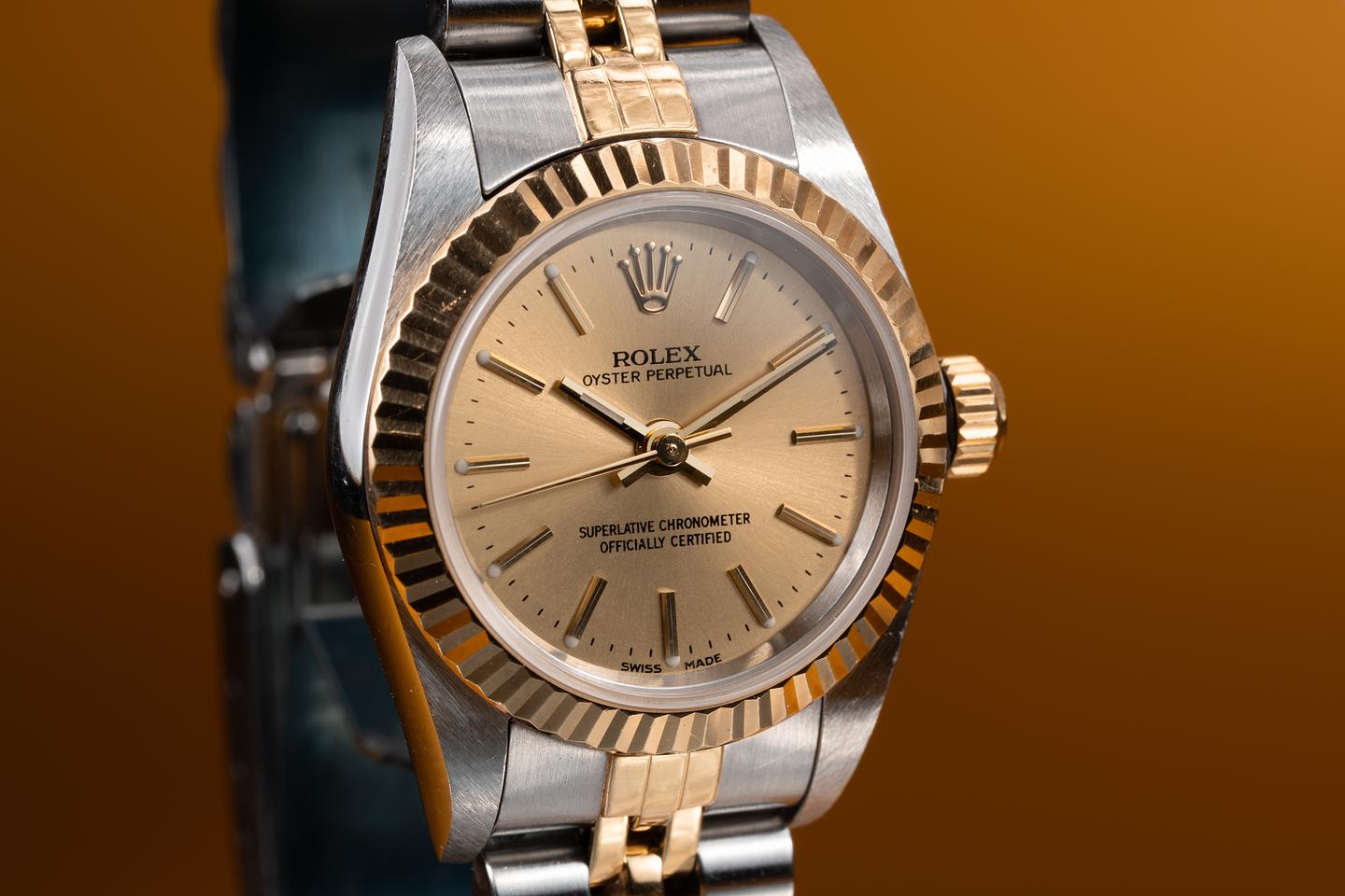 Case: The sharp 24mm case is excellent showing only very light wear. The sharp 18k yellow gold fluted bezel is also in excellent condition showing only very light wear.
