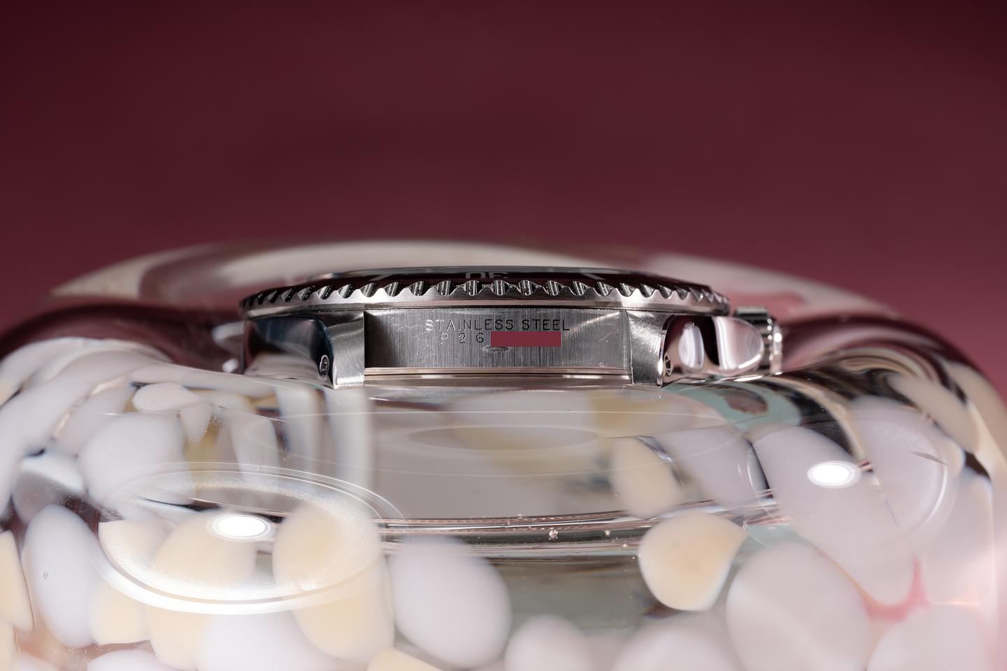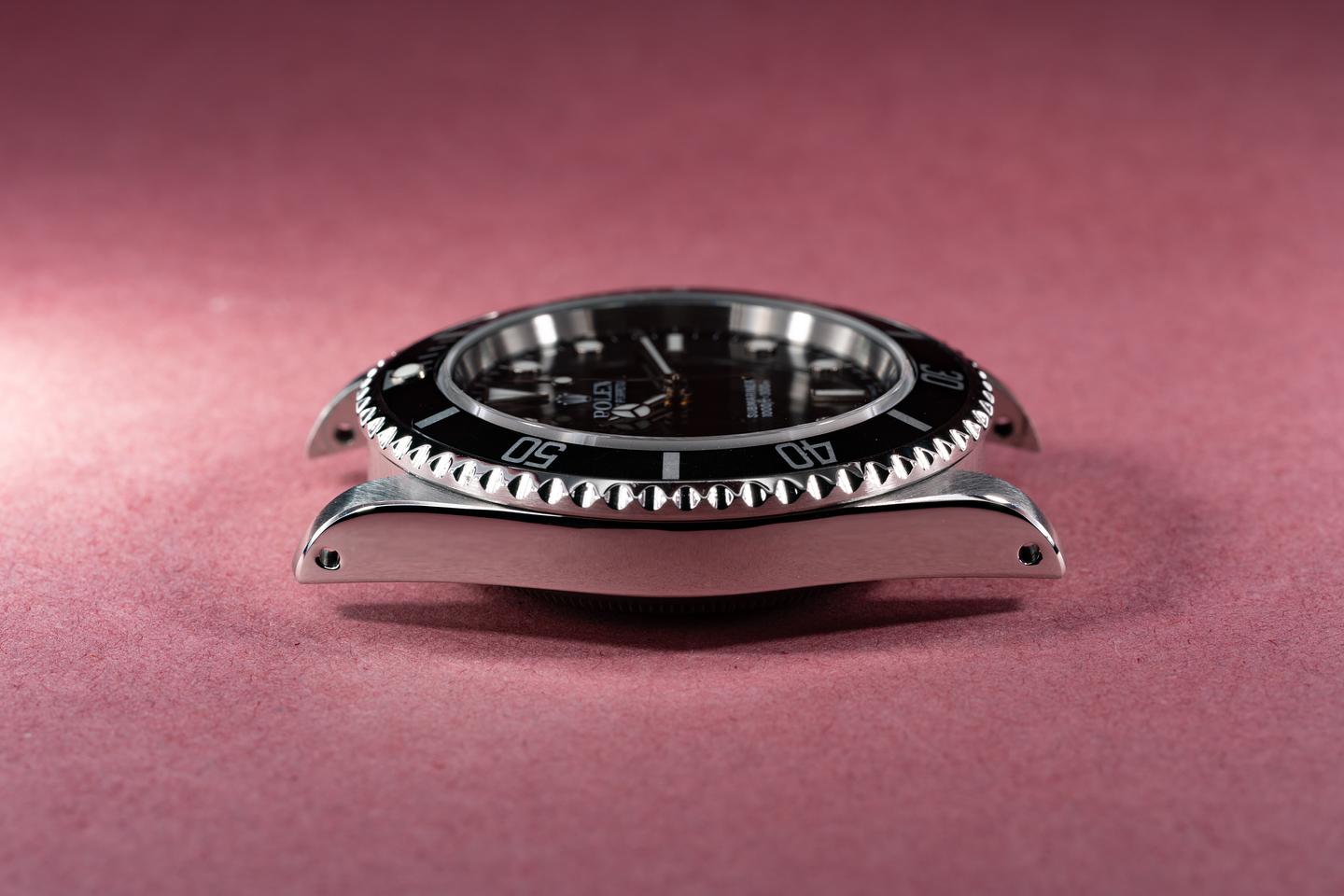 Case: The recently polished case is excellent showing sharp prominent bevels and only very light wear from use. The black bezel insert is also in excellent condition showing only very light wear from use.