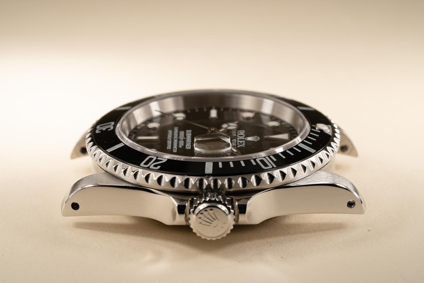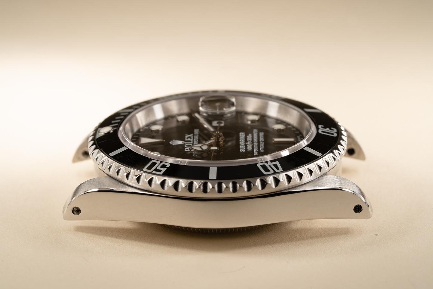 Case: The recently polished case is excellent showing sharp prominent bevels. The black bezel insert is also excellent showing only light wear from use.