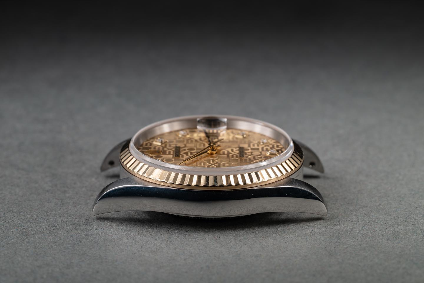 Case: The thick, sharp, and even 36mm case is excellent, showing only very light wear from use. The 18K yellow gold fluted bezel is also in excellent condition, showing only light wear from use.