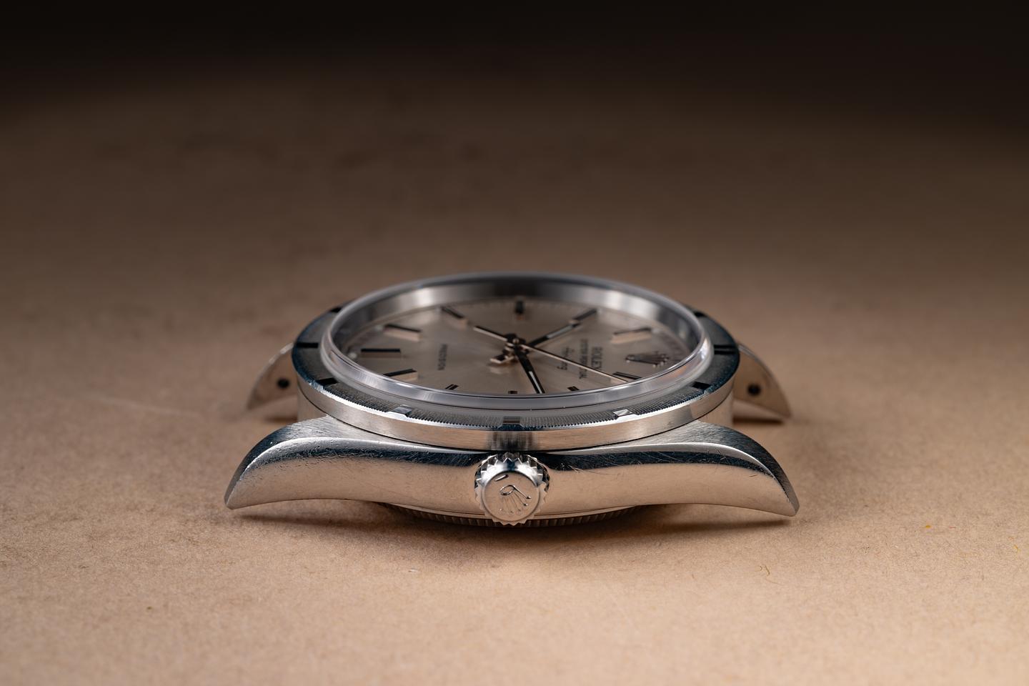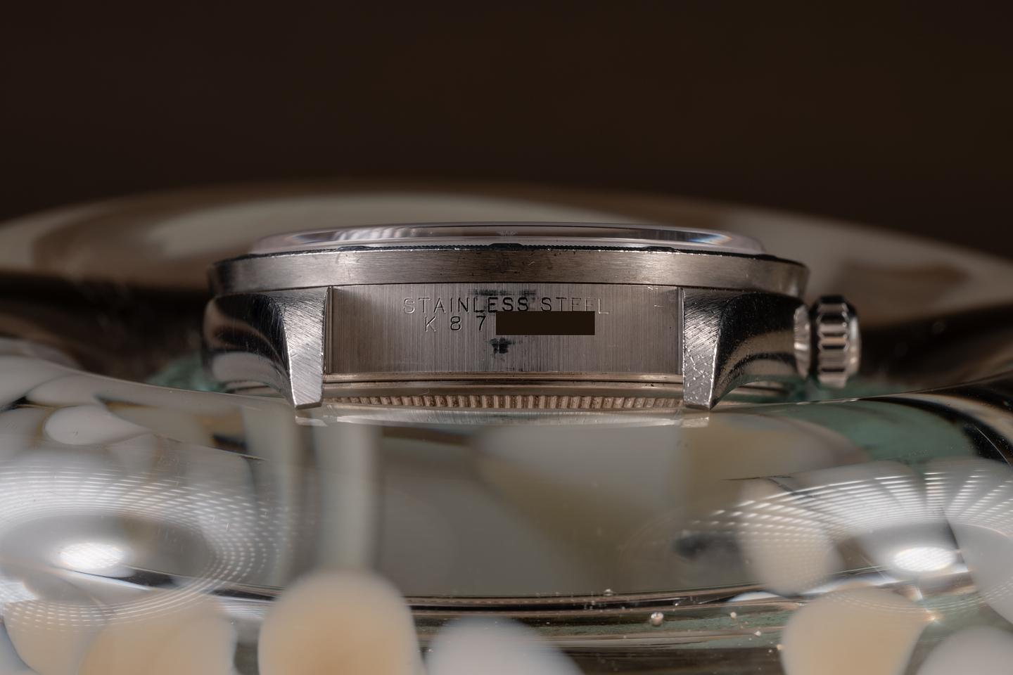 Case: The unpolished 34m case is excellent, showing light to average wear from use. The stainless steel engine turned bezel is also in excellent unpolished condition, showing light wear from use.