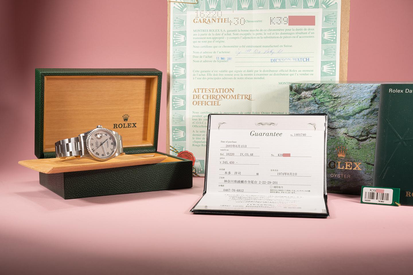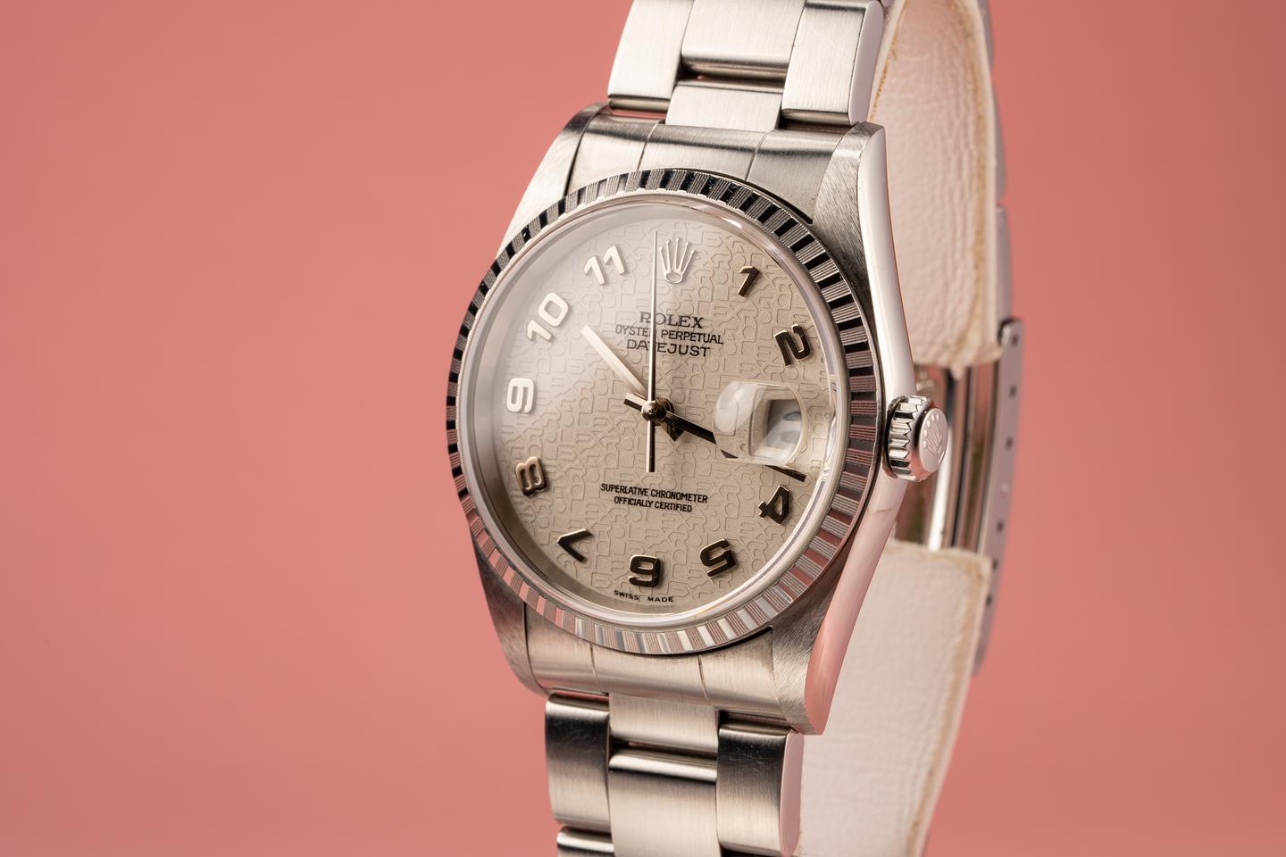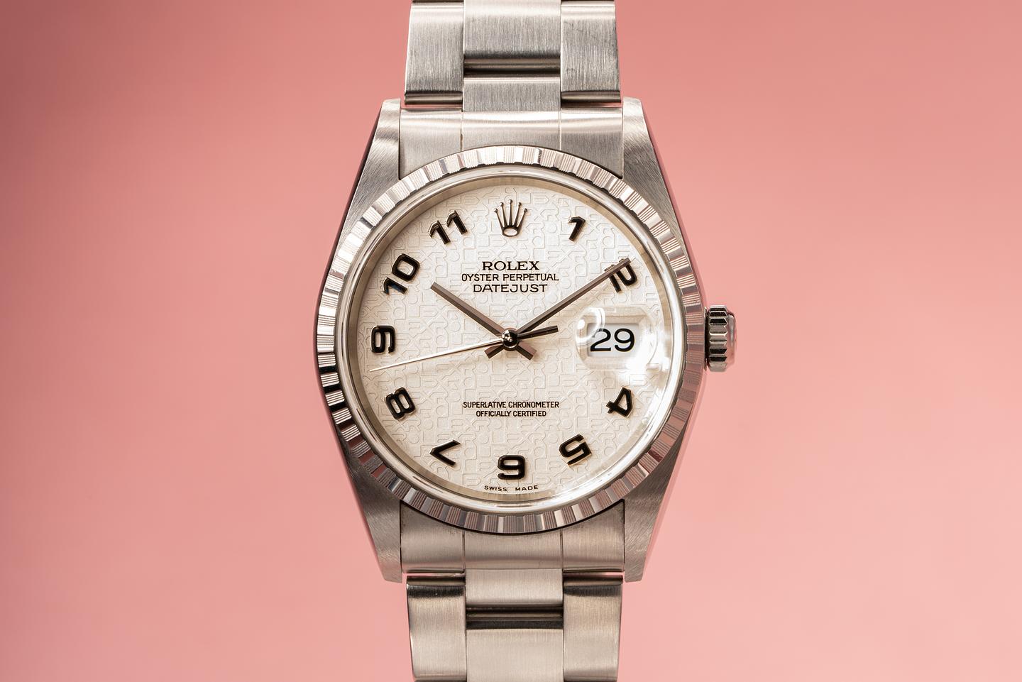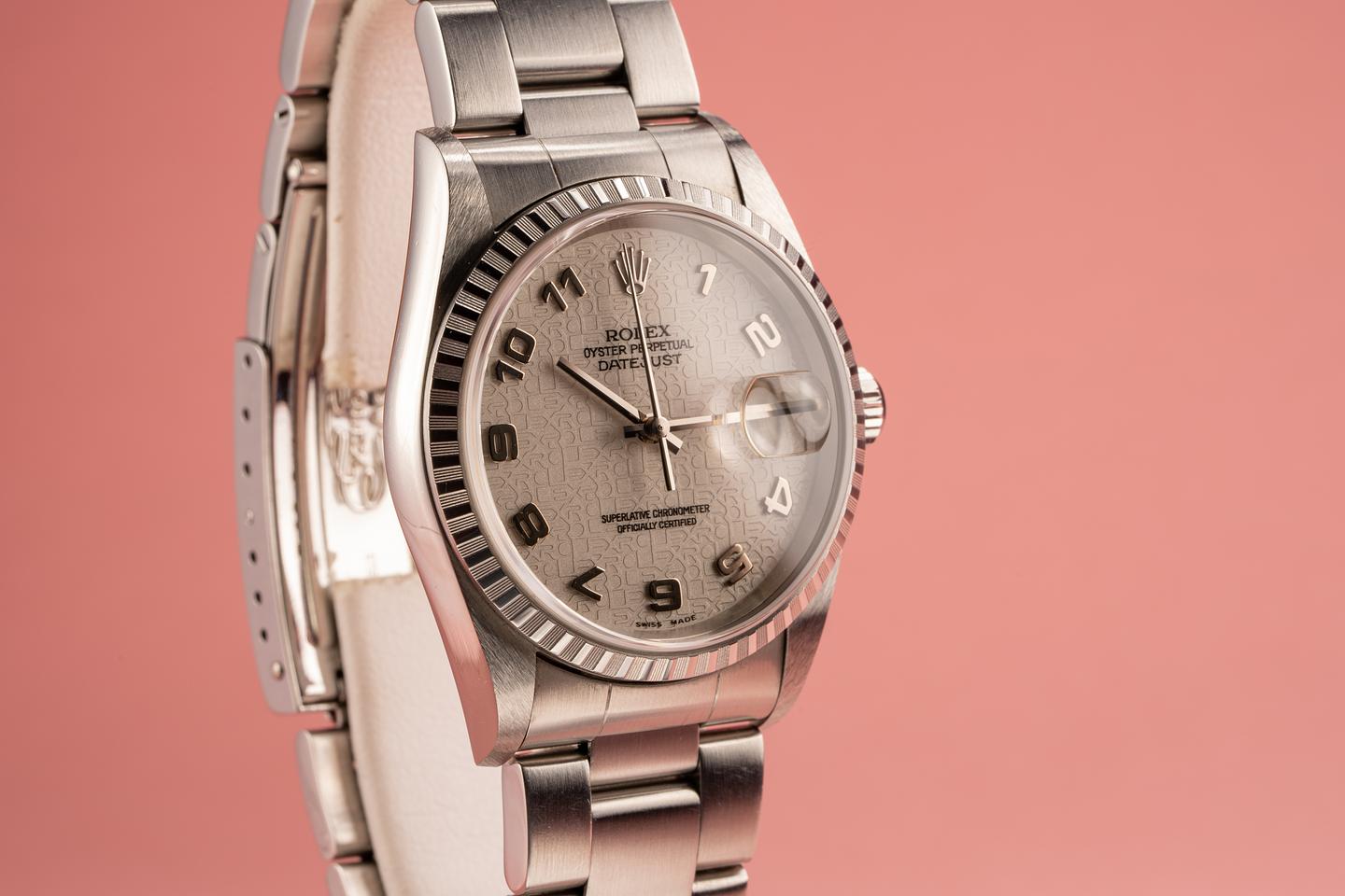 Bracelet: The 13 link oyster bracelet is attached to the watch with 558b end links. The bracelet has very minimal stretch and the clasp is stamped with a matching 2001 date code.