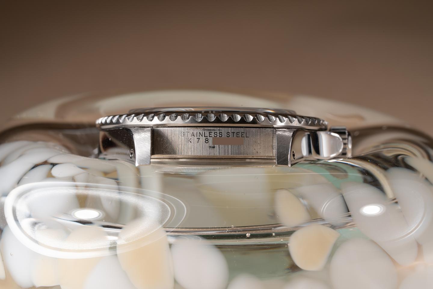 Case: The thick case is excellent showing prominent bevels and only light wear from use. The black bezel insert is also in excellent condition showing only very light wear from use.