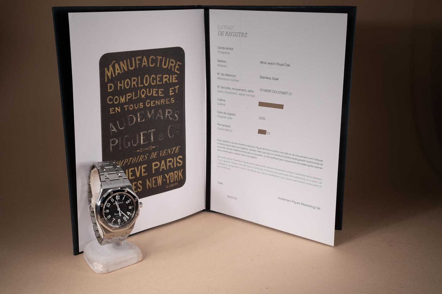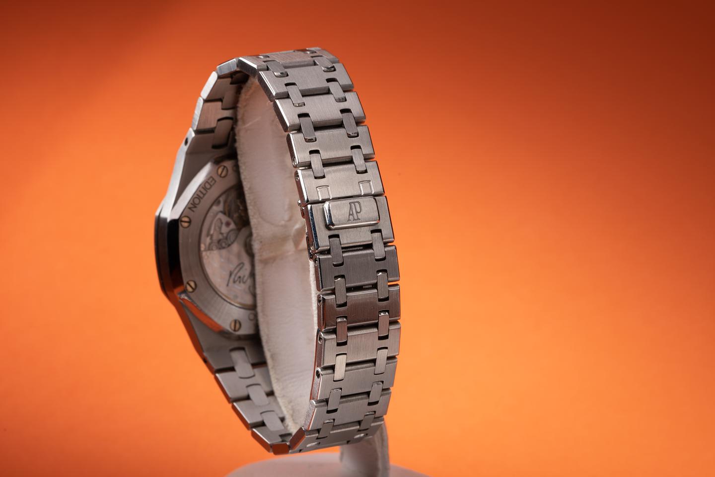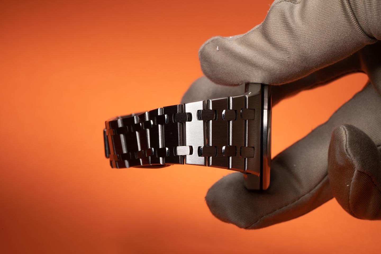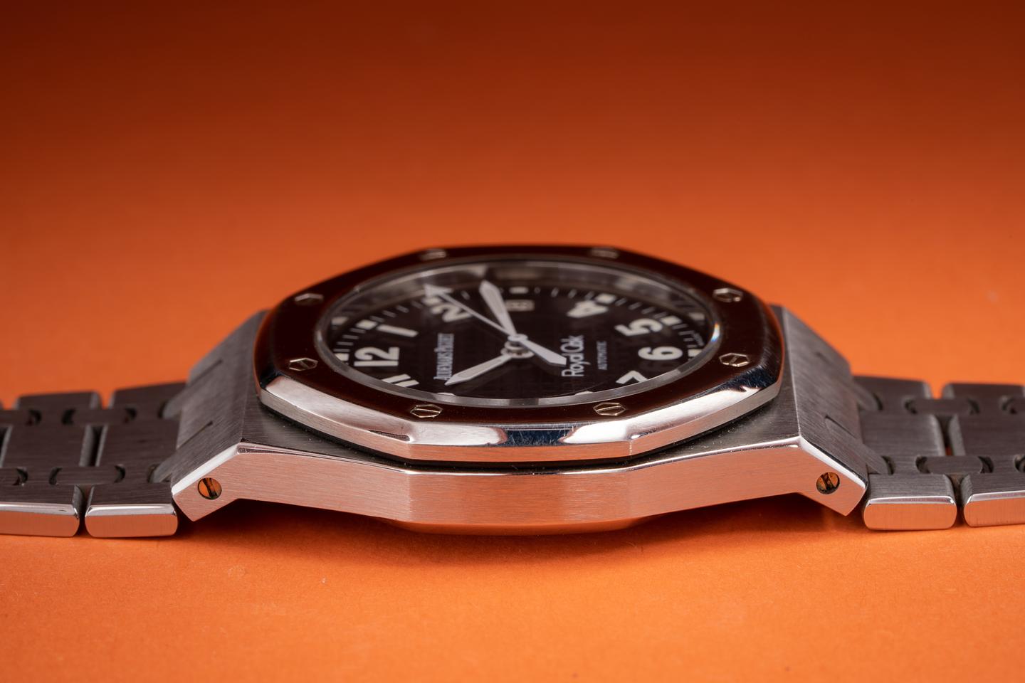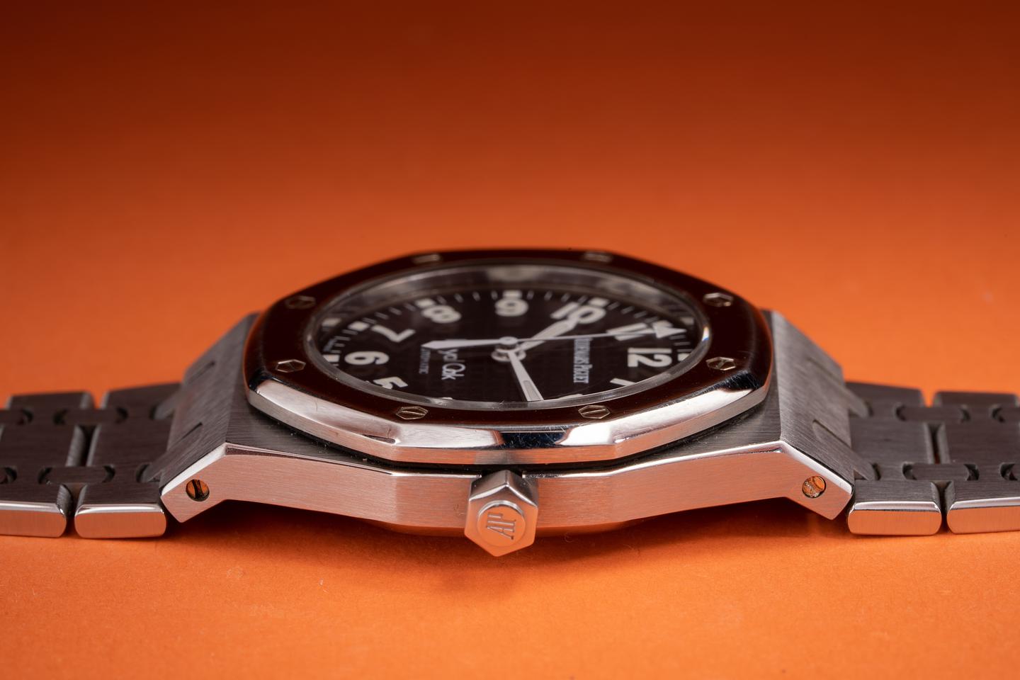 Bracelet: The 18 link royal oak bracelet is excellent showing only very light stretch for its age. The bracelet screw at the 1 o'clock lug looks to be striped.