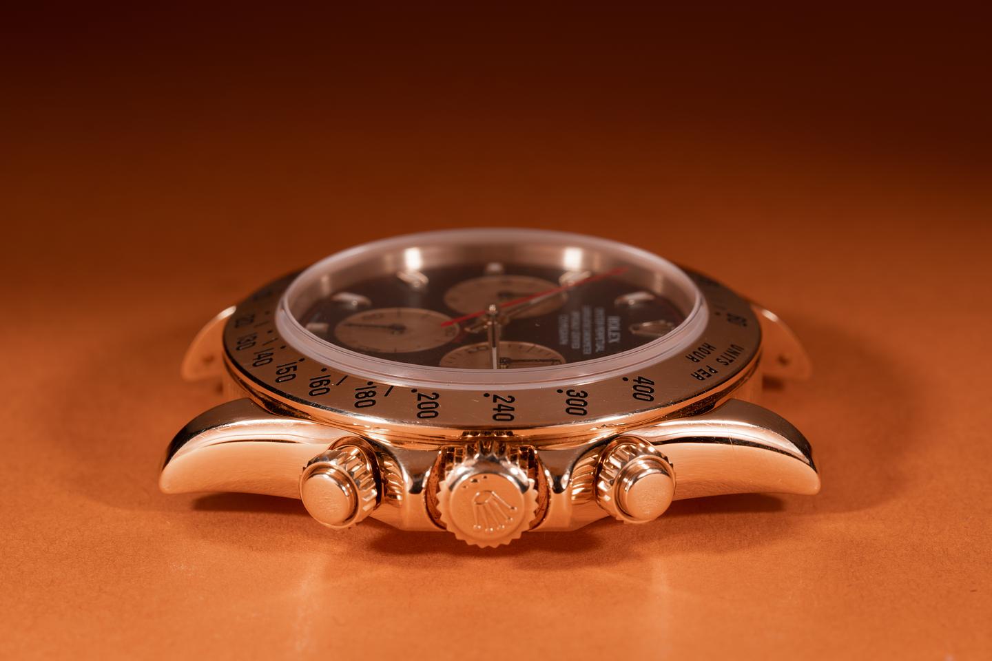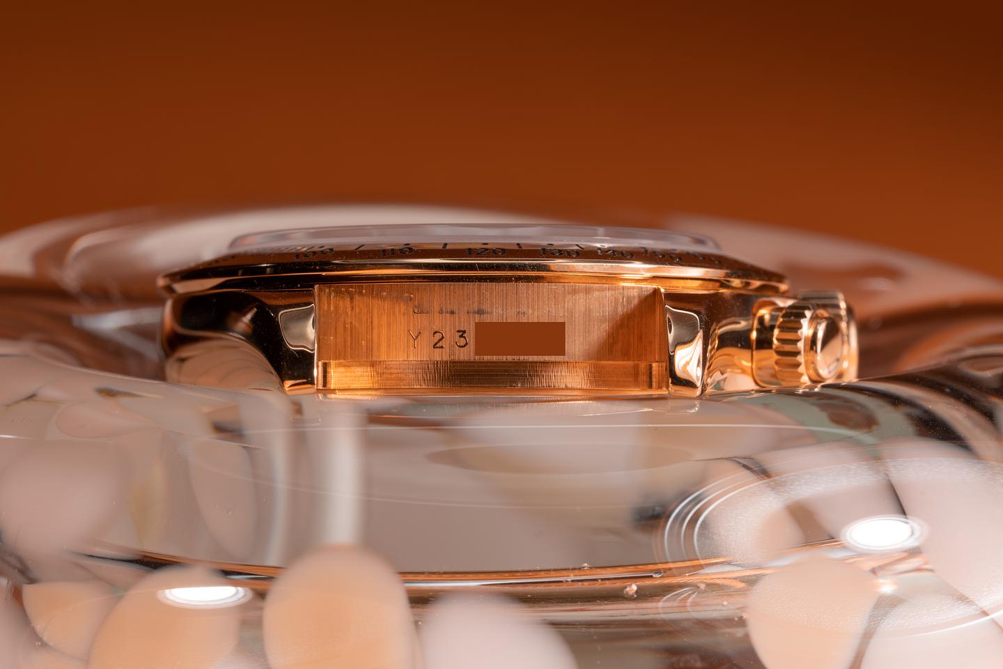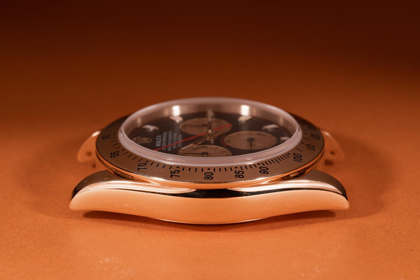 Case: The thick and even 18k yellow gold case is excellent showing only light wear from use. The 18k yellow gold bezel is also in excellent condition showing only light wear from use.