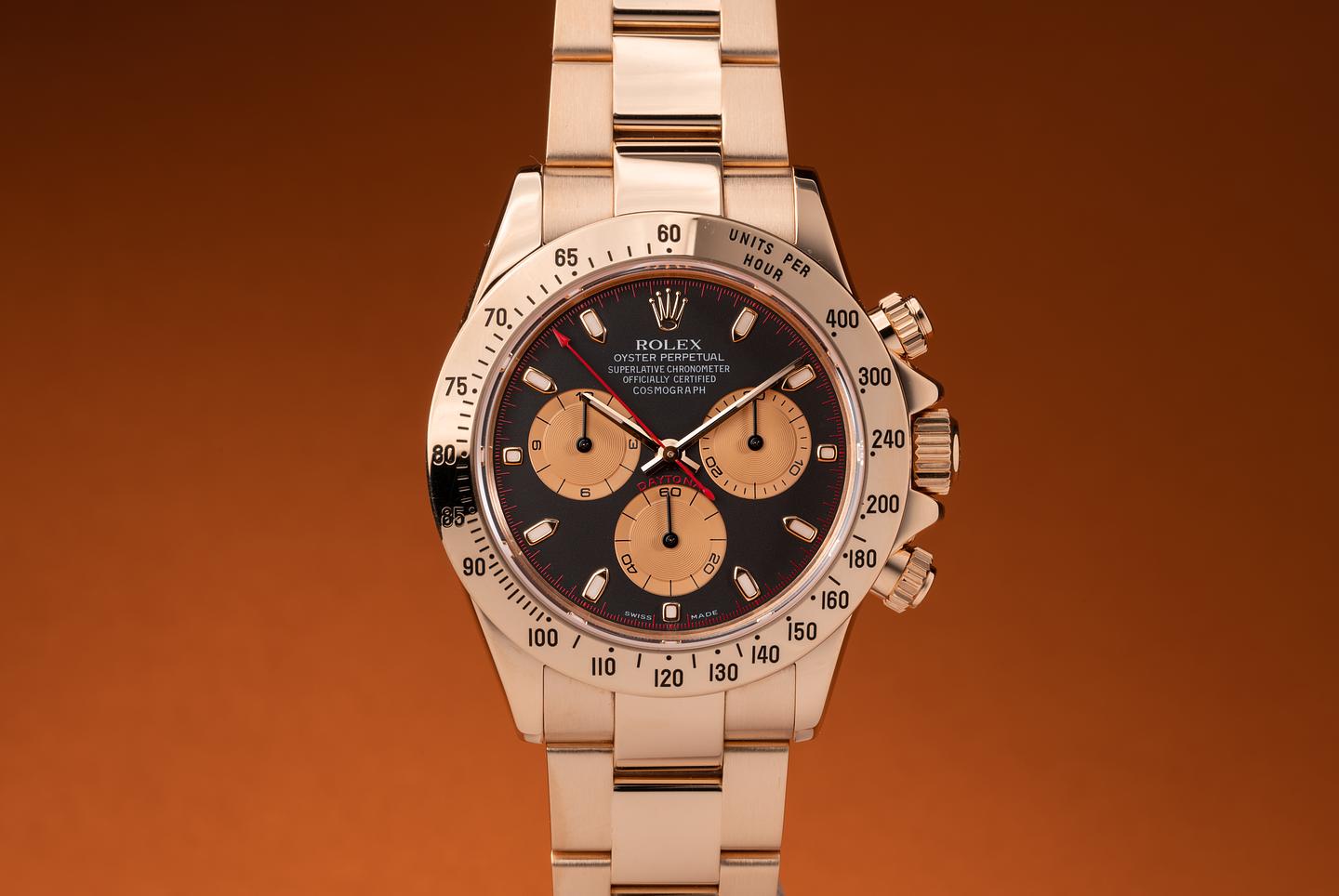 Dial: The matte black/satin gold dial is excellent showing no visible wear. The original factory hands are matching.
