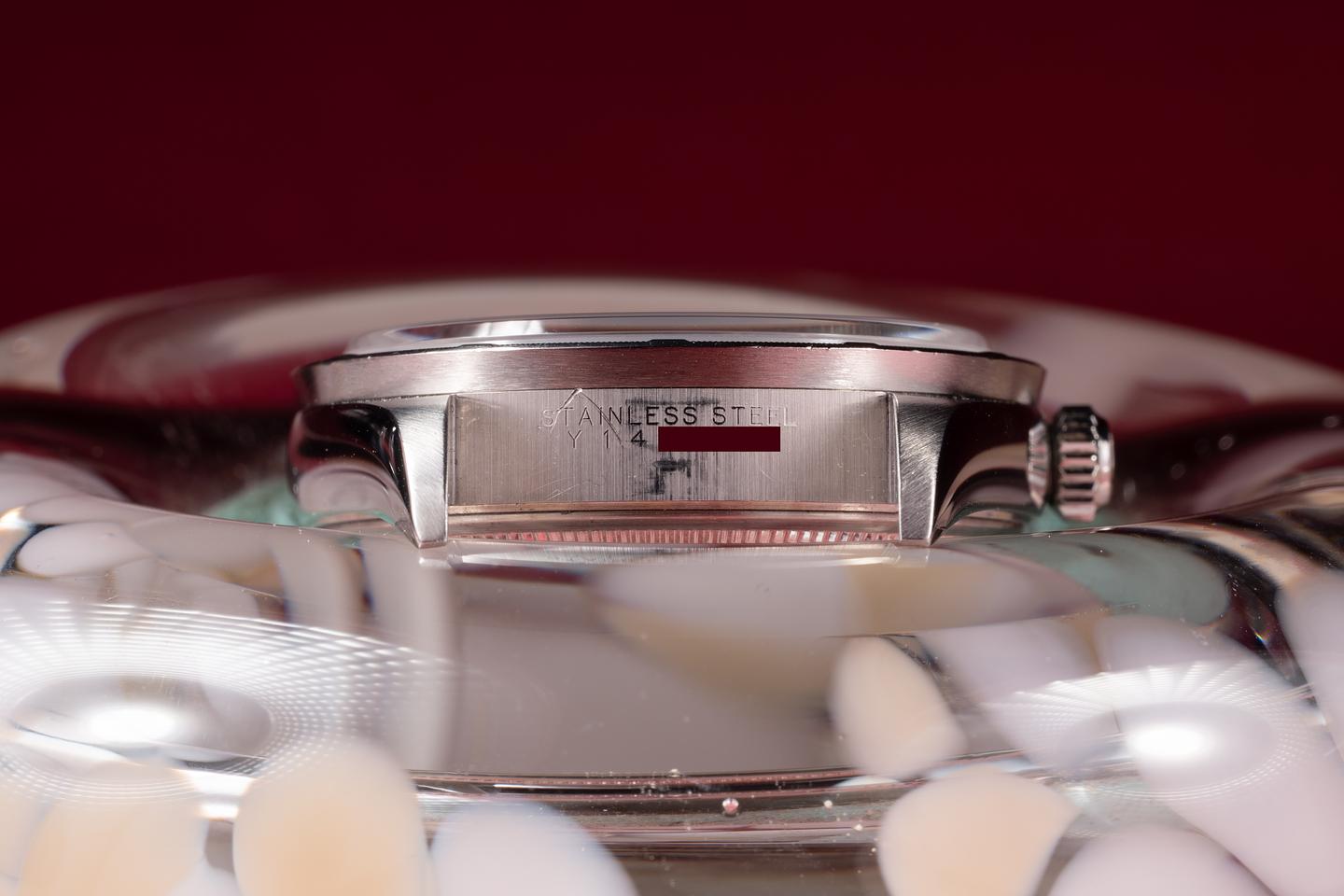 Case: The sharp 34mm case is excellent, showing only light wear from use. The sharp engine-turned bezel is also in excellent condition, showing only very light wear from use.