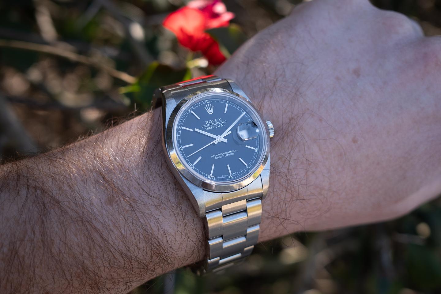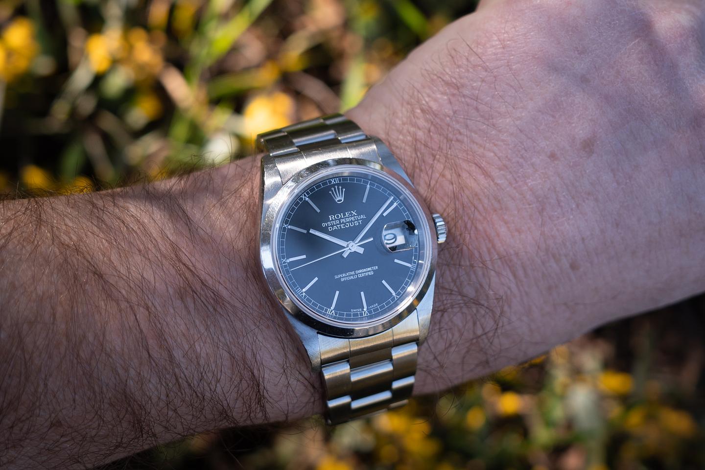 Case: The sharp, unpolished 36mm case is excellent, showing only light wear from use. The smooth, unpolished stainless bezel is also in excellent condition, showing only light wear from use.
