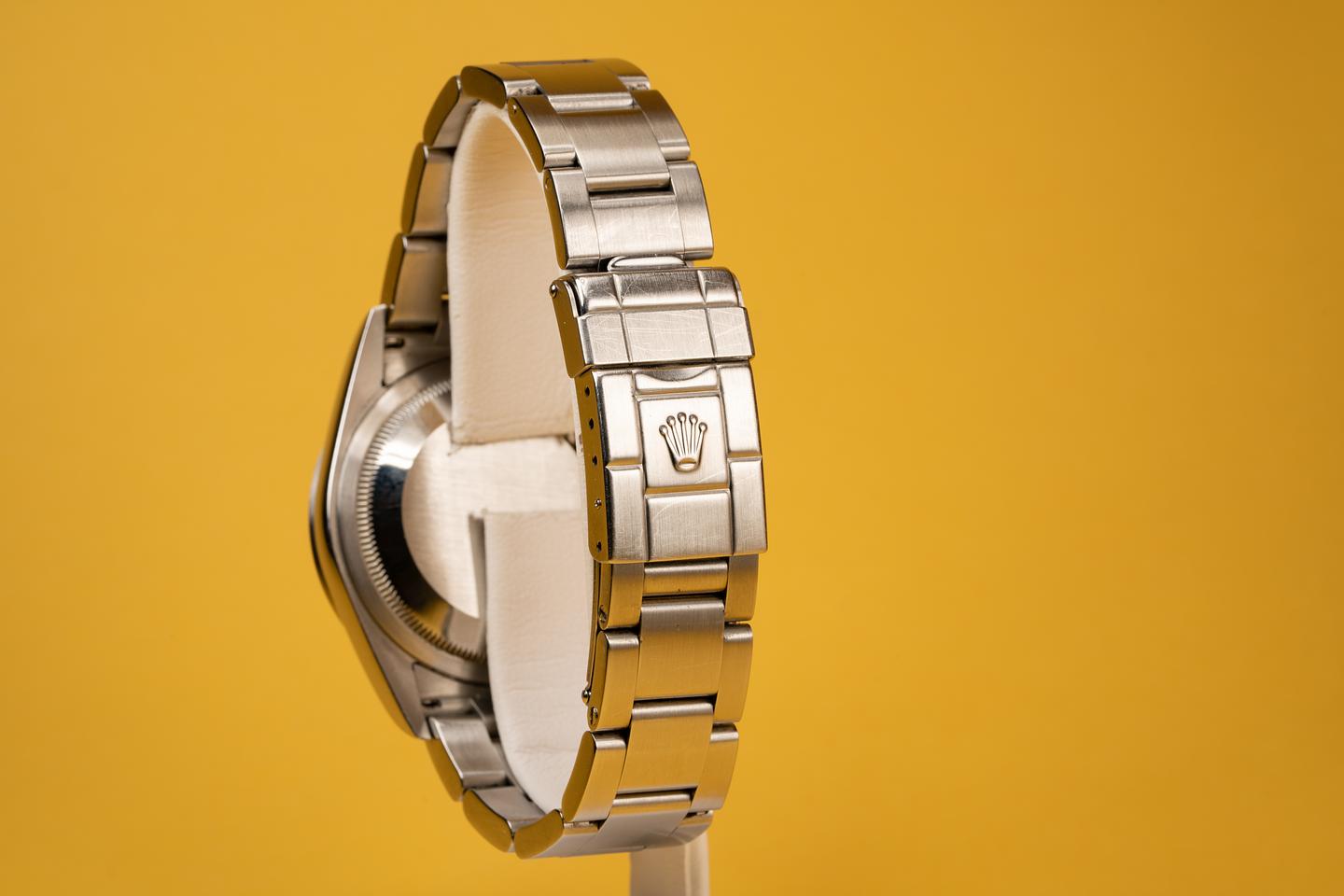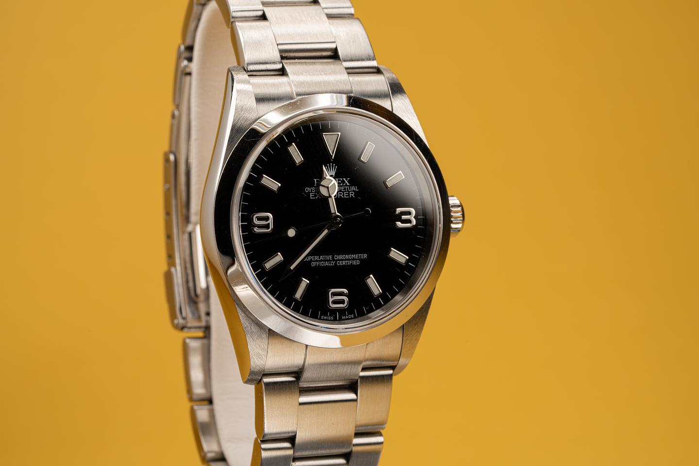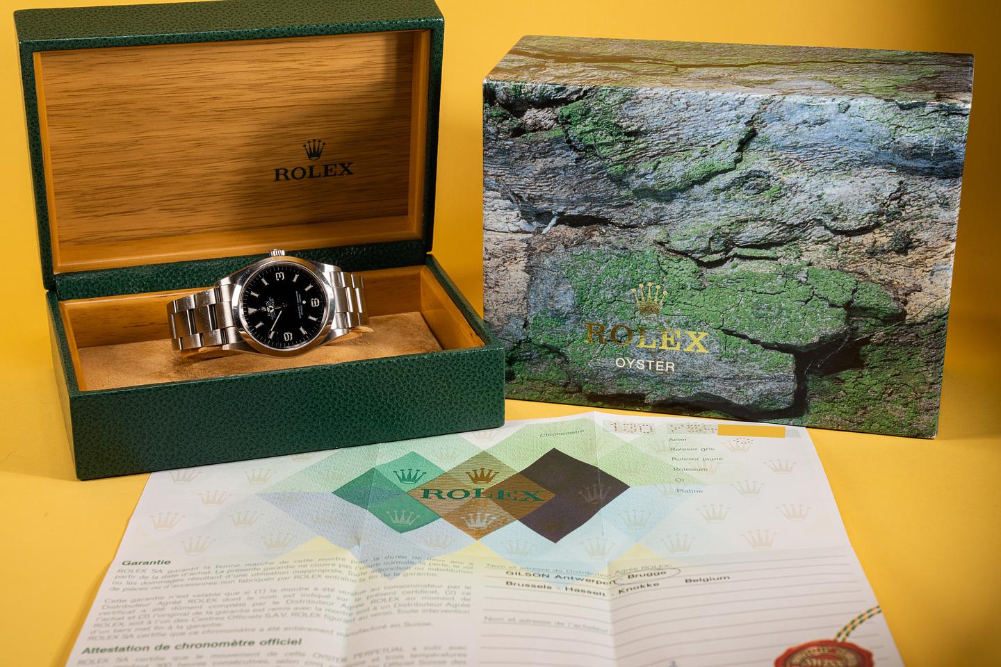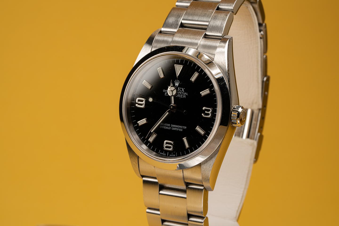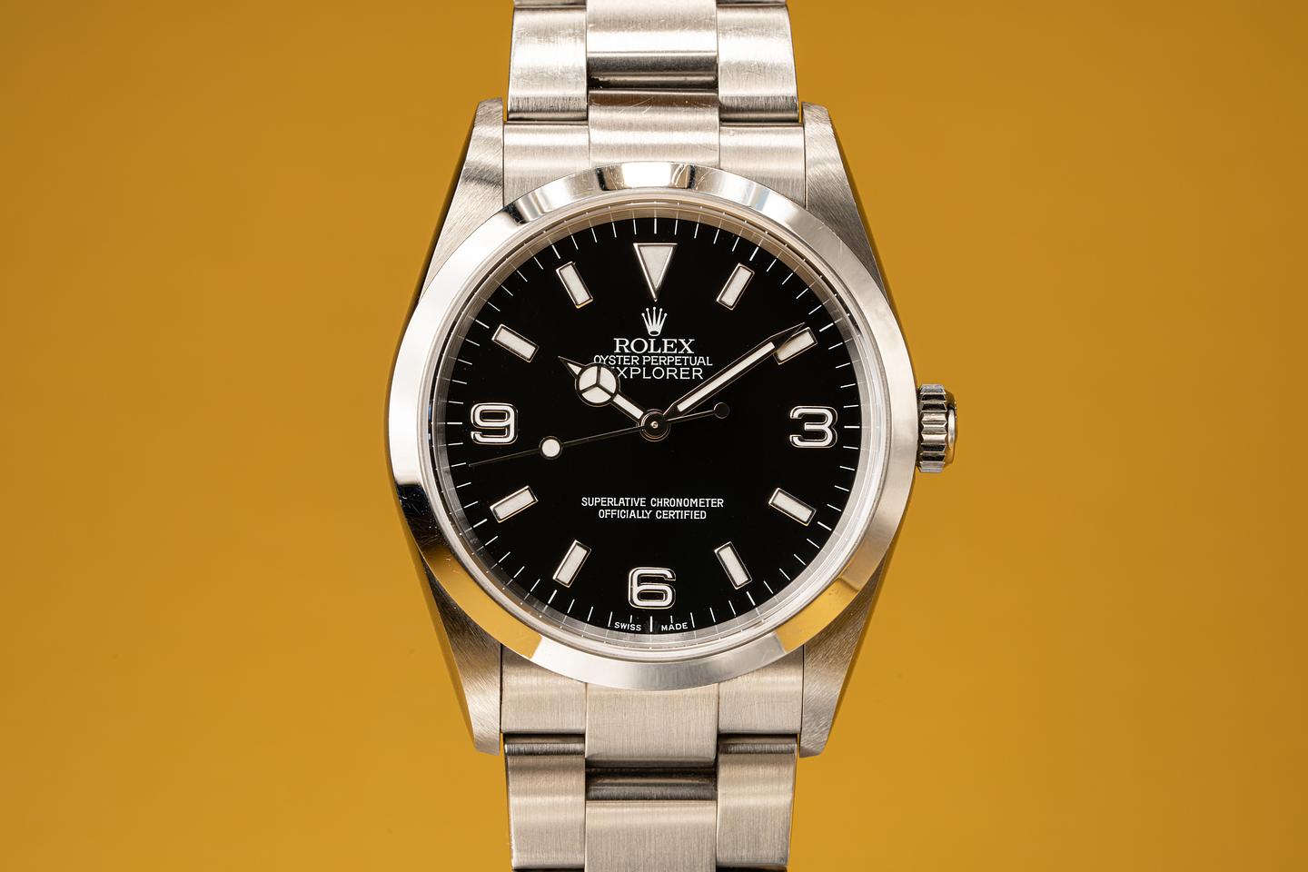 This sharp unpolished Explorer shows light surface wear on the case and bezel. The 2002 12 link SEL 78690 bracelet has very light stretch for its age and looks to be original to the watch. The dial on this one is also in excellent condition. The watch comes with the original guarantee papers and Rolex box.