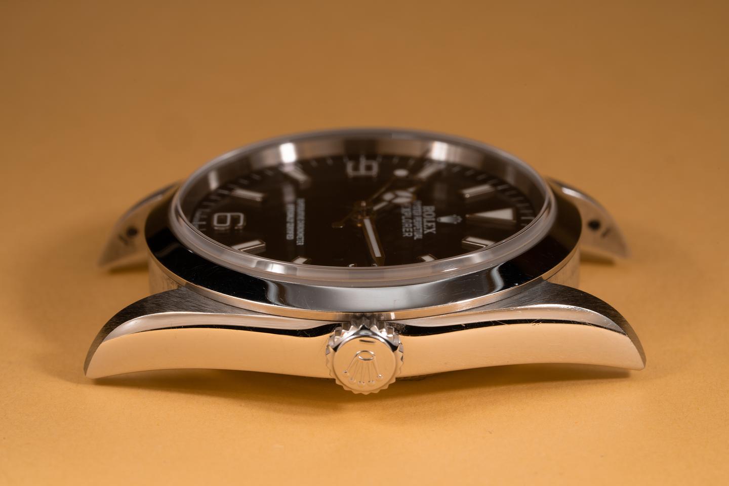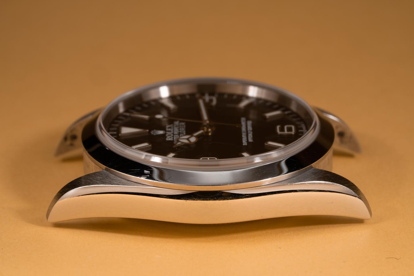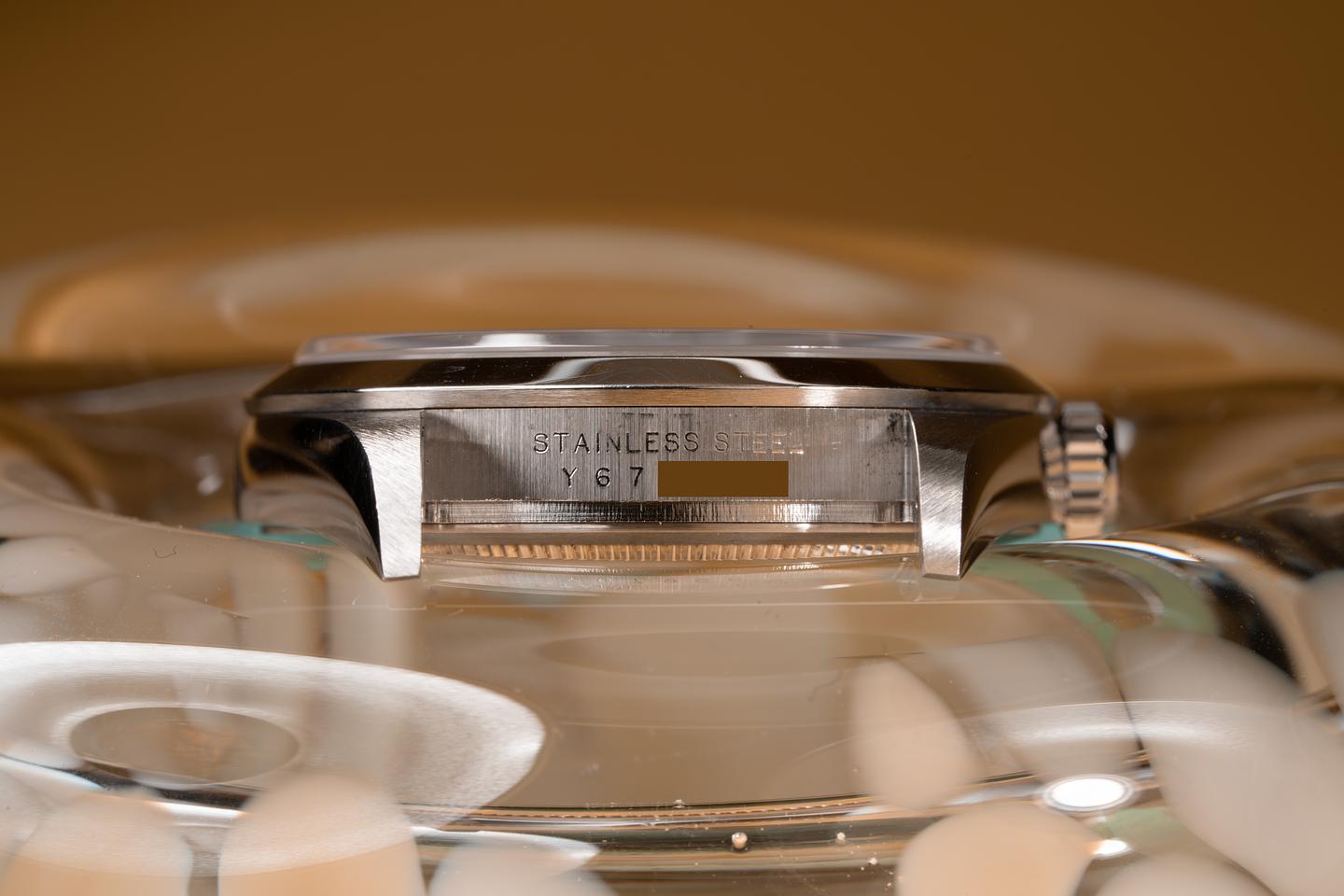 Case: The sharp and even case appears to be unpolished showing some light wear from use. The smooth stainless bezel is also in excellent condition showing only light wear from use. The original factory sticker is still in place on the caseback.