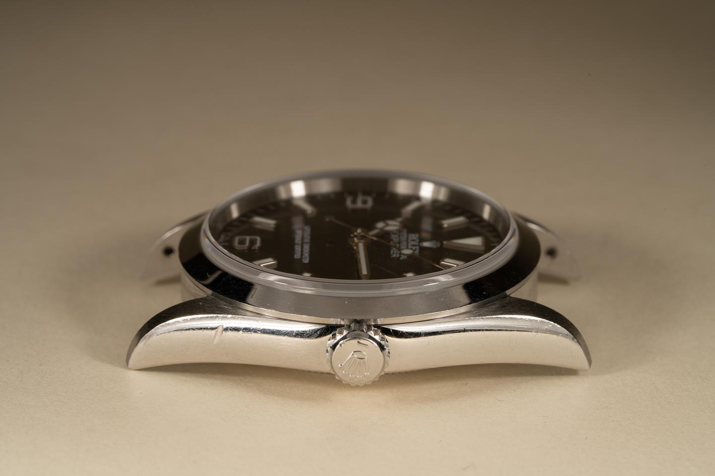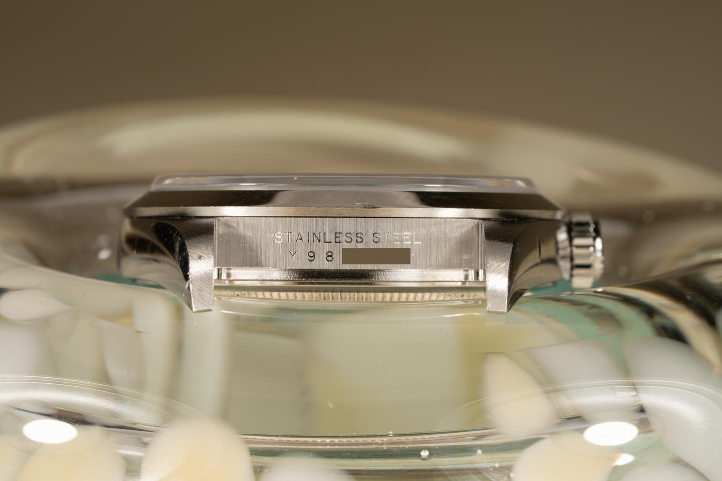 Case: The case is excellent and shows only light wear for its age. The stainless bezel is also excellent showing light wear. There is a shallow ding on the case side below the crown on the crown side of the watch.