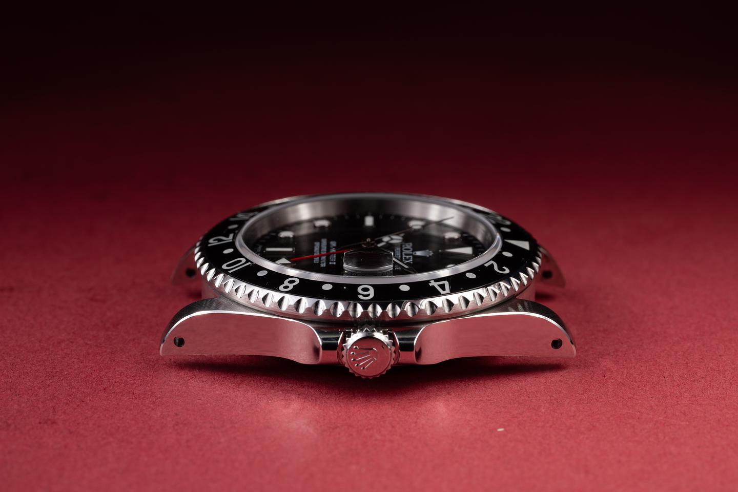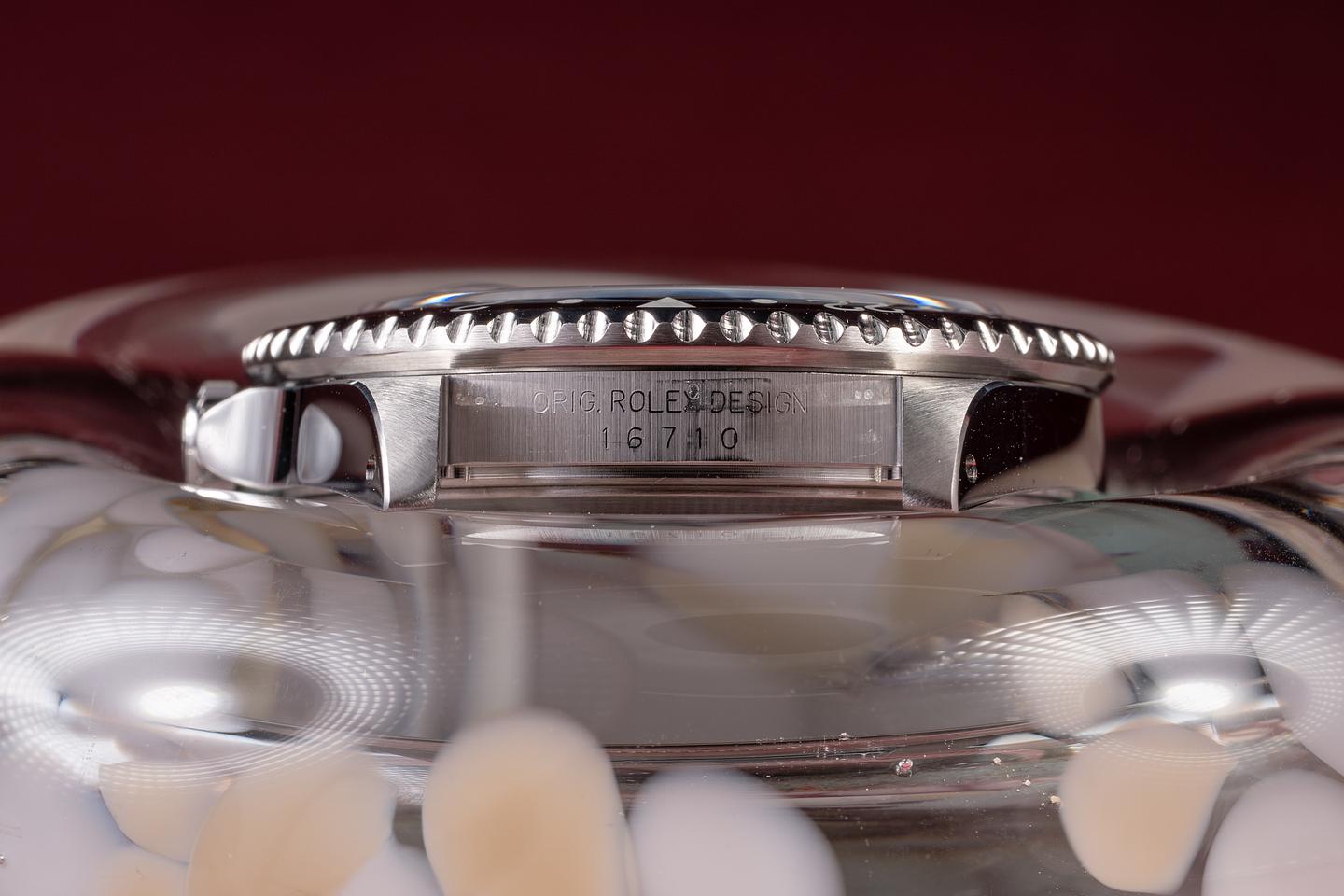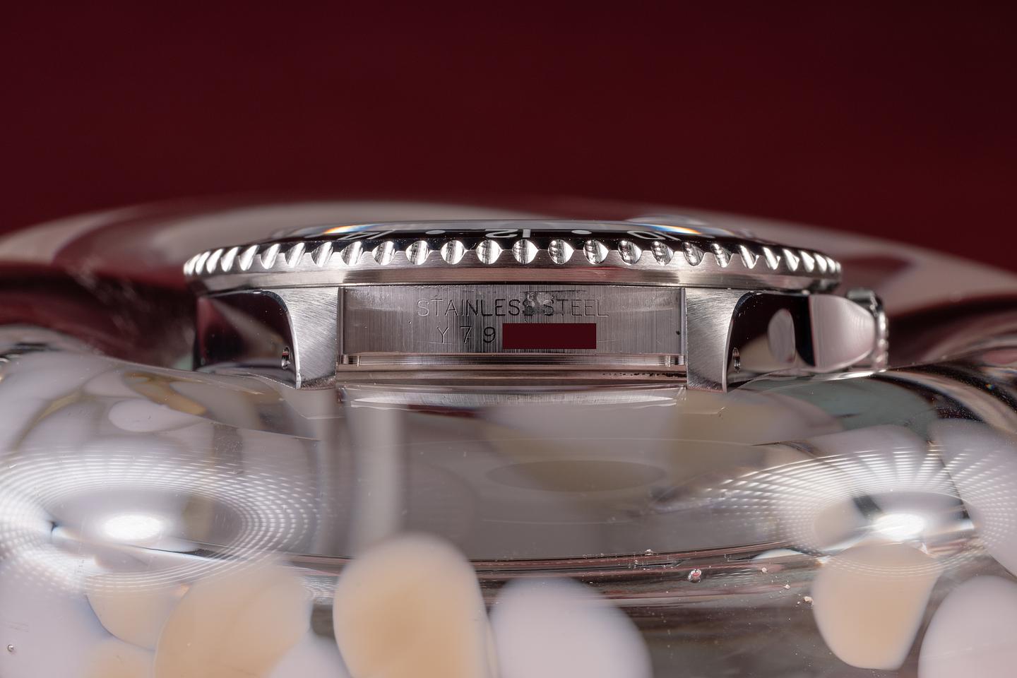 Case: The recently polished case is excellent, showing sharp, prominent bevels and only very light wear. The black bezel insert is also in excellent condition, showing only very light wear from use.
