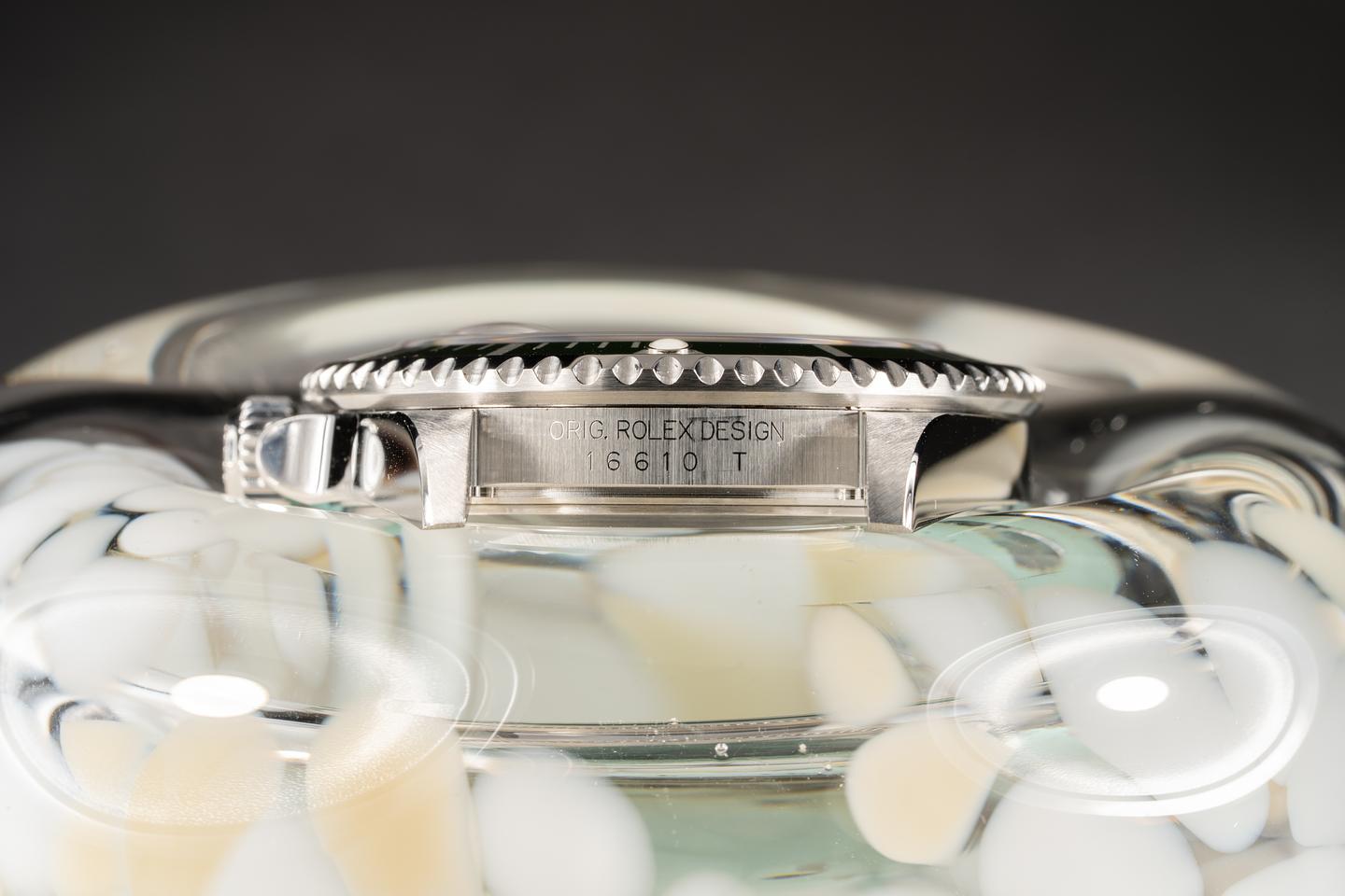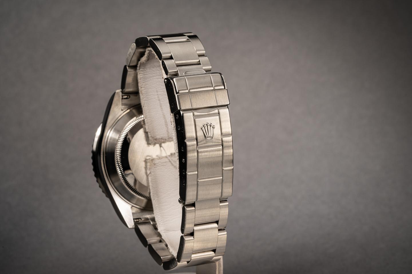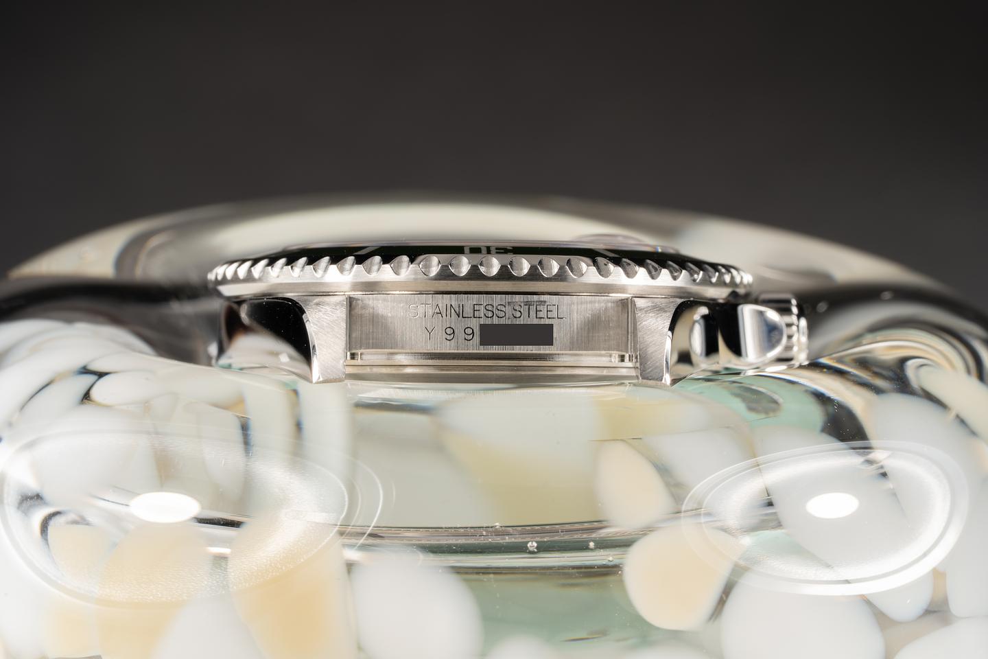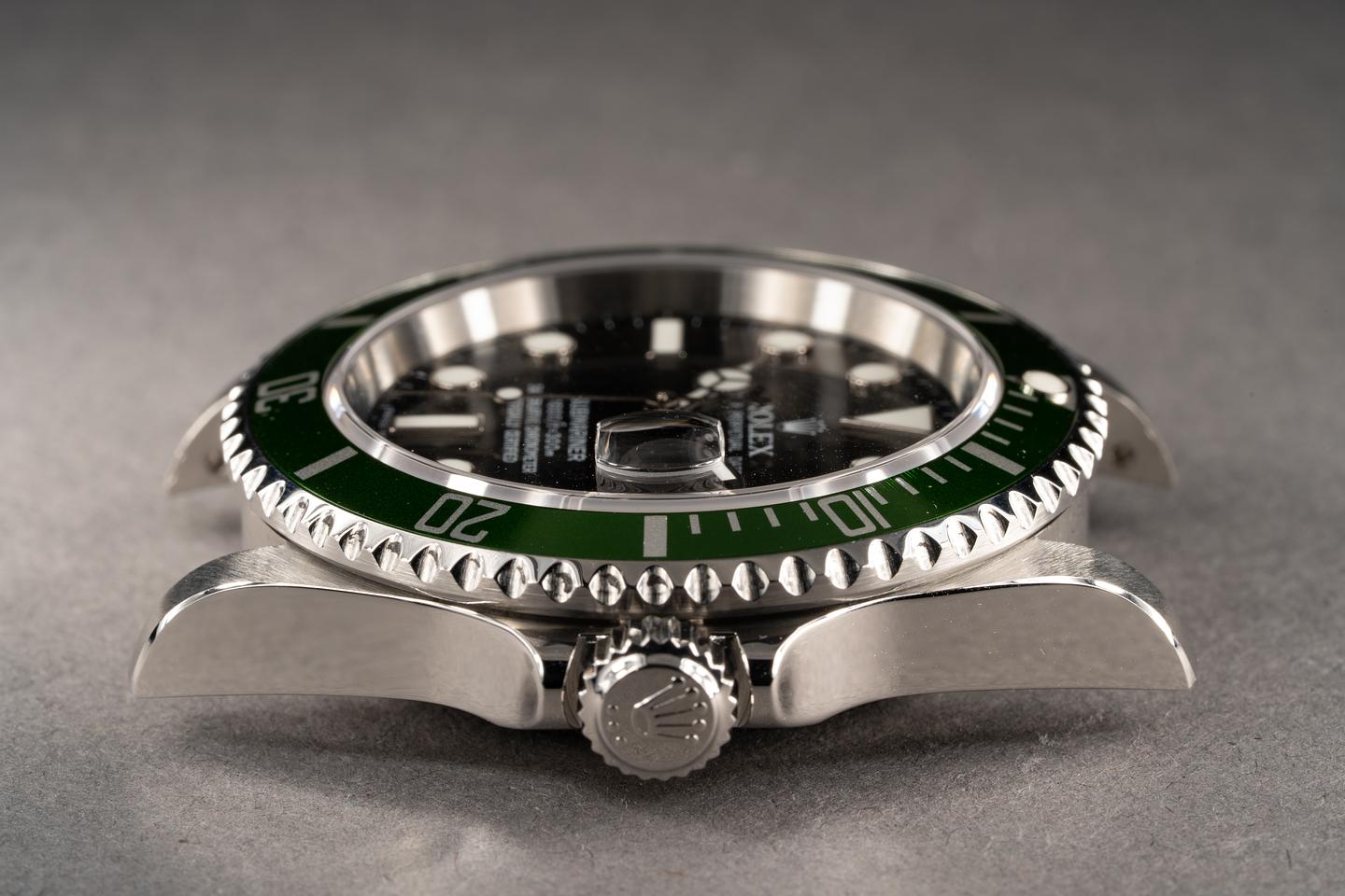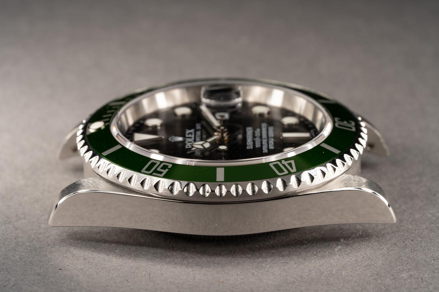Case: The no holes case has recently been polished and shows only light wear from use. The newer MK 4 green bezel insert is also in excellent condition and shows only very light wear.