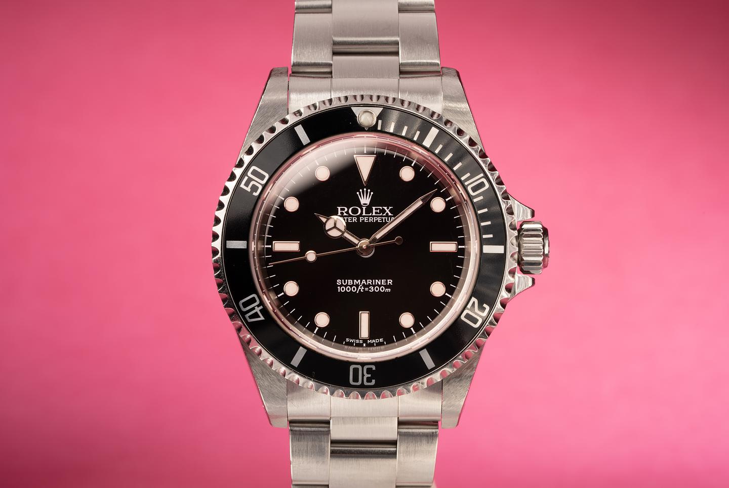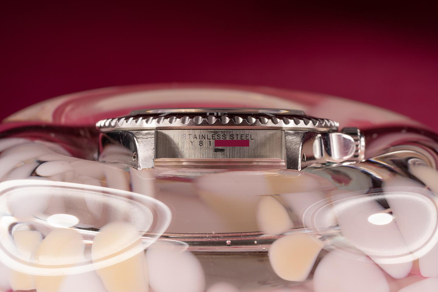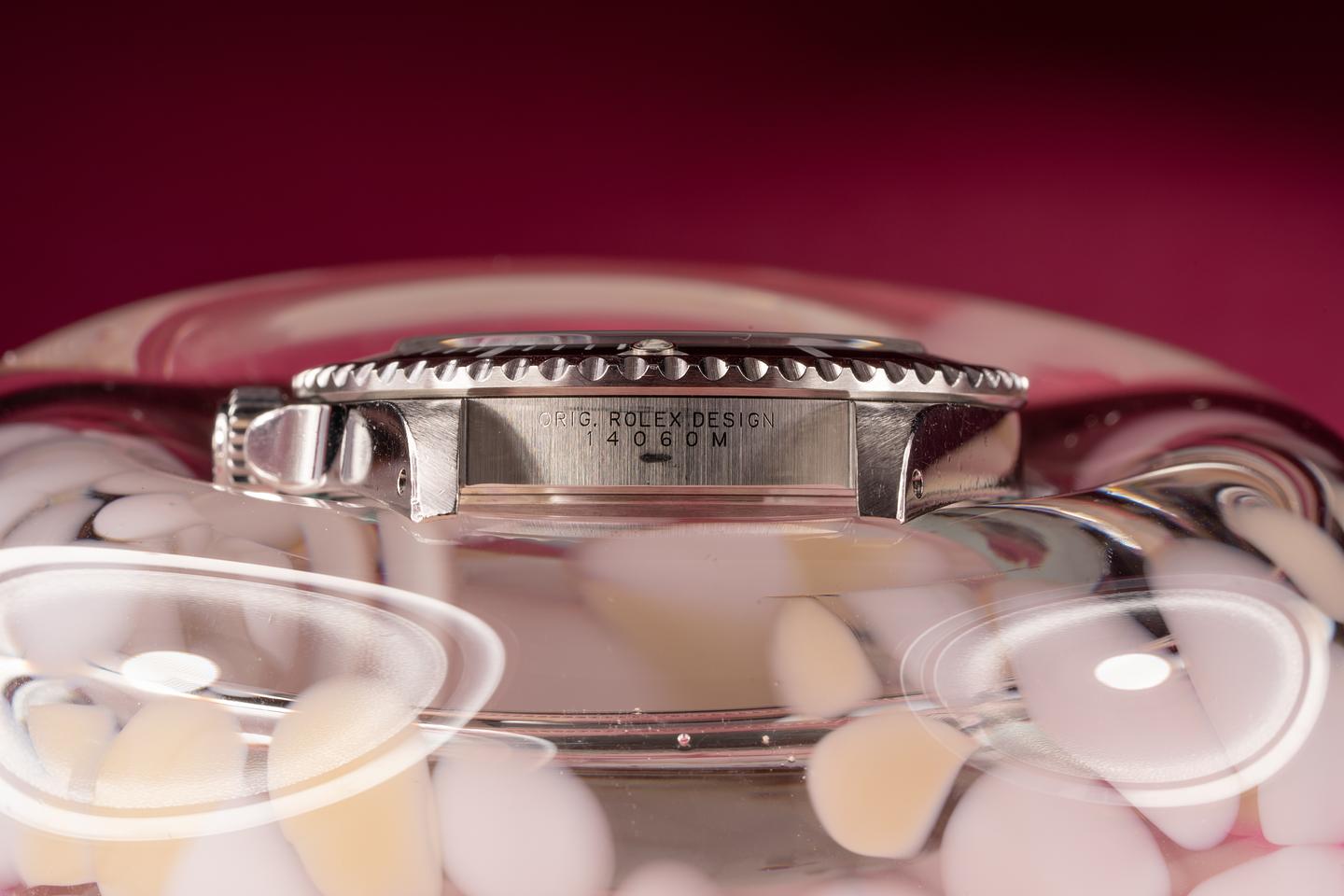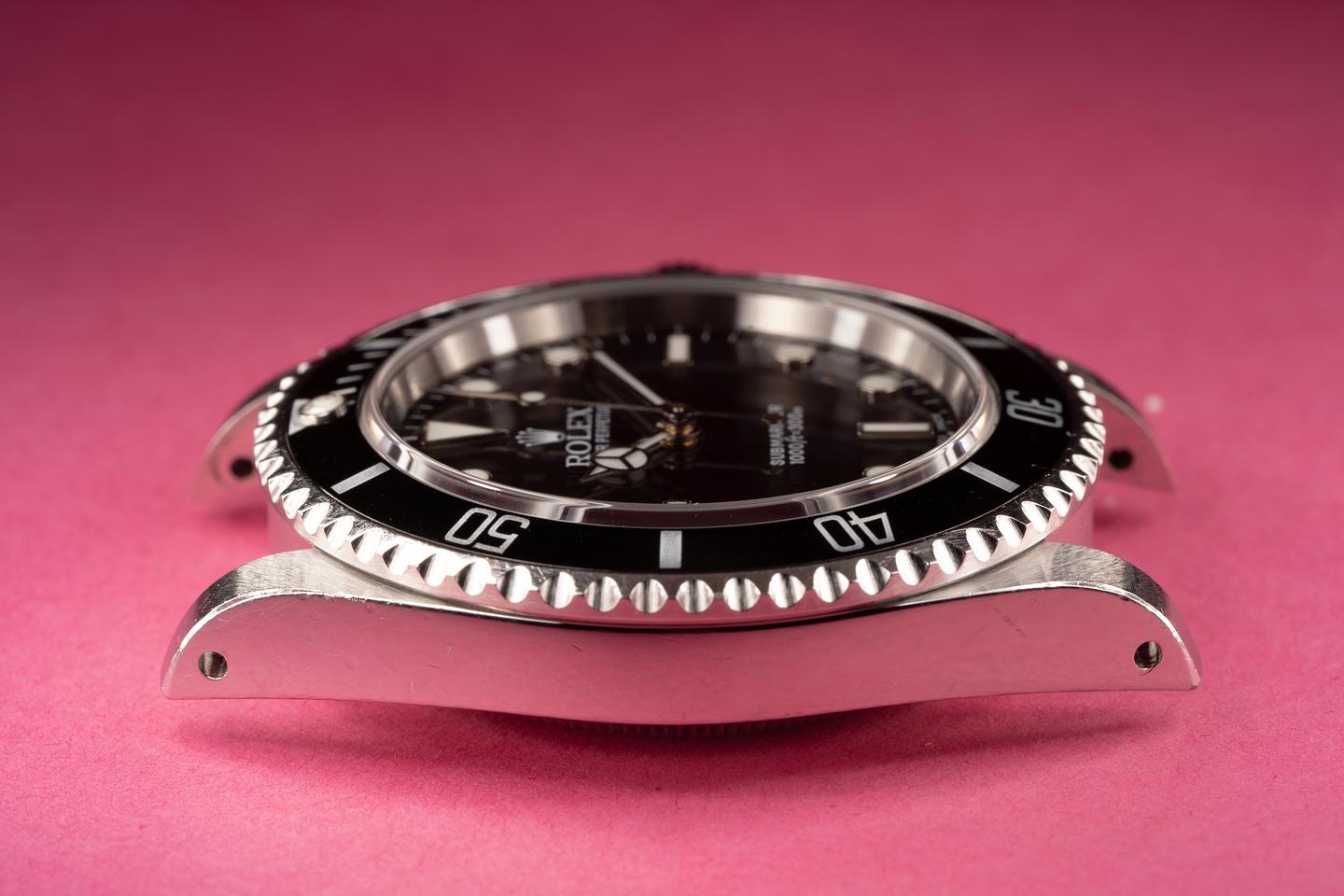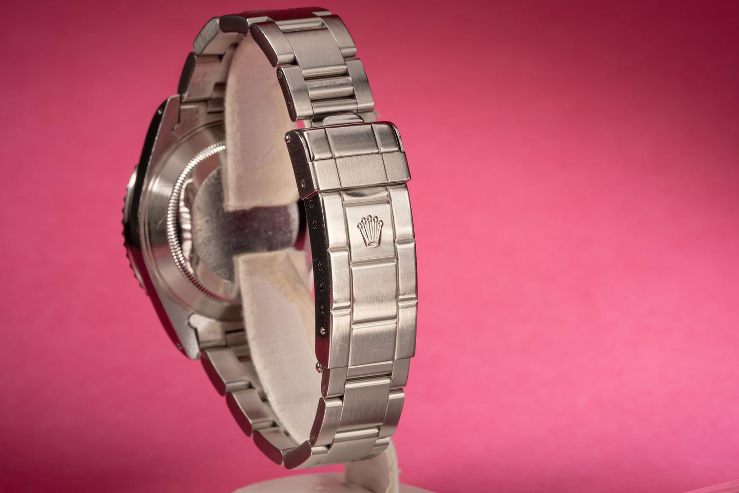 Case: The unpolished case excellent condition with intact factory bevels. The case shows some wear from use. The black bezel insert is also in excellent condition and shows only light wear from use.